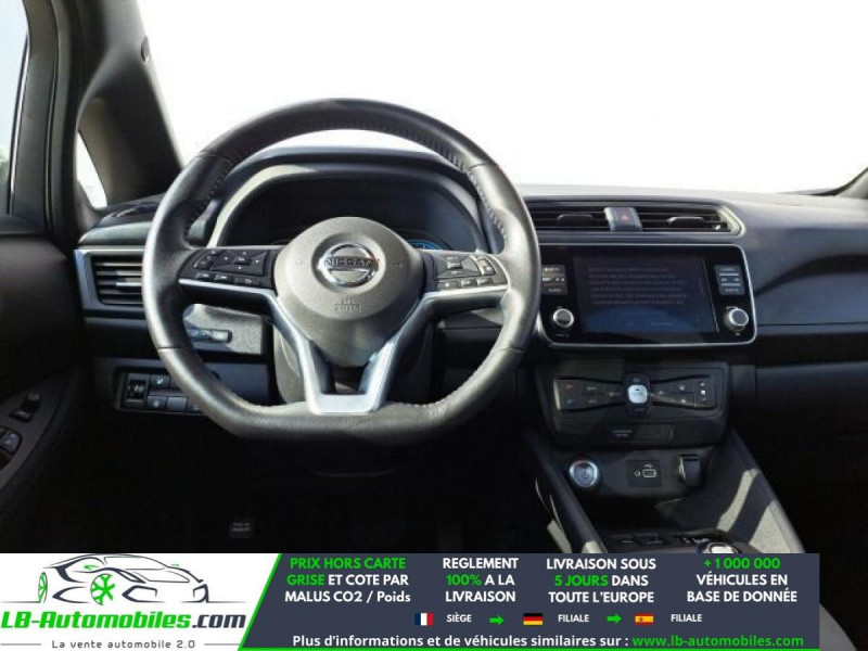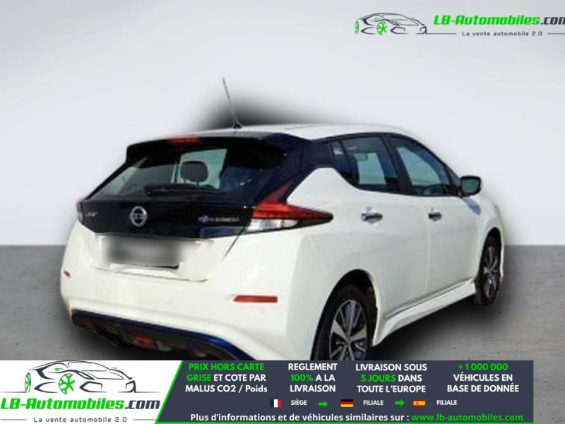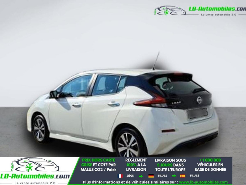 Référence : 1149604 Vos Avantages chez LB-AUTOMOBILES.com / Prix affiché TTC Livré hors carte grise / Livraison sous 10 jours dans toute la France hors 31 / Pas d?avance de frais paiement du véhicule 100% à la livraison par virement. Nissan Leaf Neuf remisée, Nissan Leaf Occasion Toulouse Beaupuy 31850, Nissan Leaf Véhicule sorti de réseau collaborateur, Nissan Leaf import, Nissan Leaf importateur, Nissan Leaf Livraison possible dans toute la France sous 5 jours, Nissan Leaf, Nissan Leaf Location Option Achat, Nissan Leaf LLD, Nissan Leaf Longue Durée, Nissan Leaf TVA récupérable. Possibilité d'extension de garantie 12, 24,36 mois, Pour tout autres voitures import neufs ou occasions collaborateur fortement remisée, Mandataire Audi, Mandataire BMW, Mandataire Volkswagen, Mandataire Mercedes, Mandataire Peugeot Espagne, Mandataire Renault Espagne, Porsche import, Mandataire Citroën Espagne, Mandataire Seat Espagne, n'hésitez pas à nous contacter. « Sous réserve de vente préalable et erreur de saisie » Principaux équipements : - ABS - Android Auto - Antidémarrage - Apple CarPlay - Assistance au freinage d'urgence - Assistance de démarrage en côte - Assistant d'angle mort - Assistant feux de route - Avertisseur de franchissement de ligne - Bluetooth - Capteur de lumière - Capteur de pluie - Certificat de batterie - Contrôle de la pression des pneus - Direction assistée - Éclairage d'ambiance - Éclairage route non éblouissant - Écran tactile - ESP - Fermeture centralisée - Feux de jour LED - Garantie - GPS - Isofix - Jantes alliage - Kit mains libres - Ordinateur de bord - Phare antibrouillard - Pneus été - Pneus toutes saisons - Point Isofix siège passager - Pompe à chaleur - Port USB - Radio DAB - Régulateur de vitesse - Rétroviseur extérieur électrique - Streaming musical intégré - Système antipatinage - Système d'avertissement de la distance - Système de détection de la fatigue - Système de limitation de la vitesse - Système de reconnaissance des panneaux de signalisation - Traction avant - Tuner/radio - Véhicule non-fumeur - Verrouillage centralisé sans clé - Vitres électriques - Volant en cuir - Volant multifonction