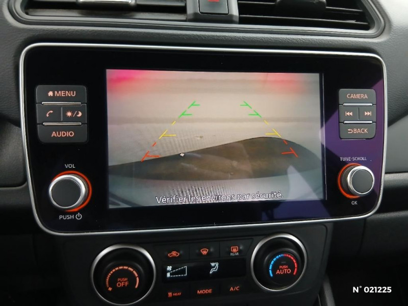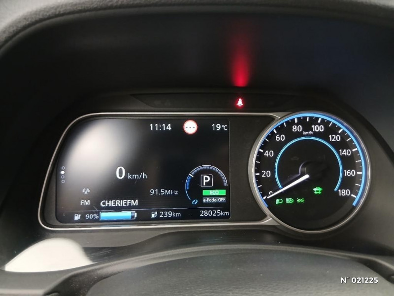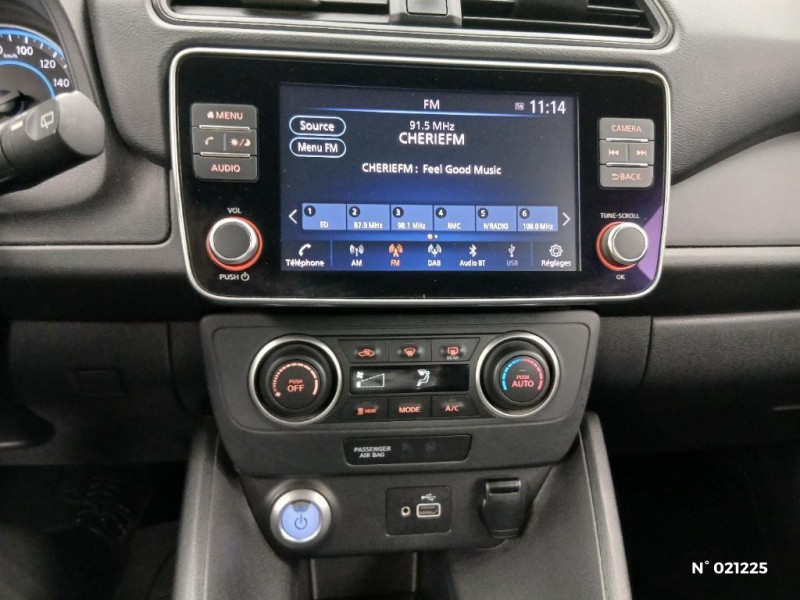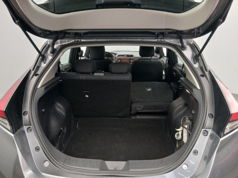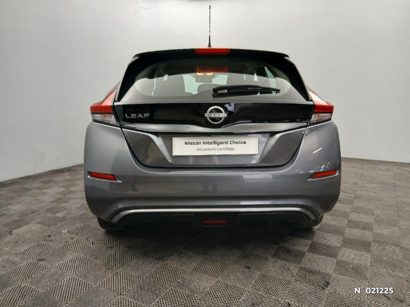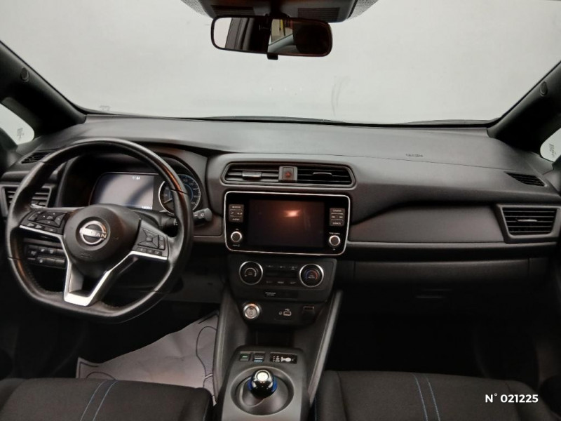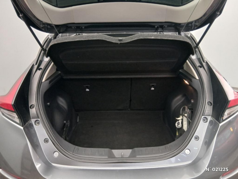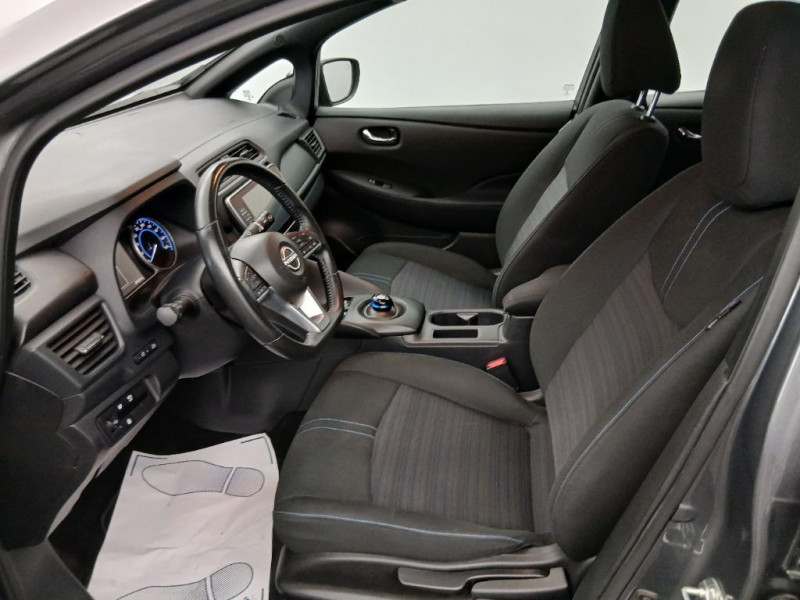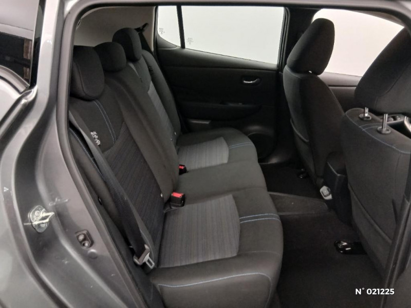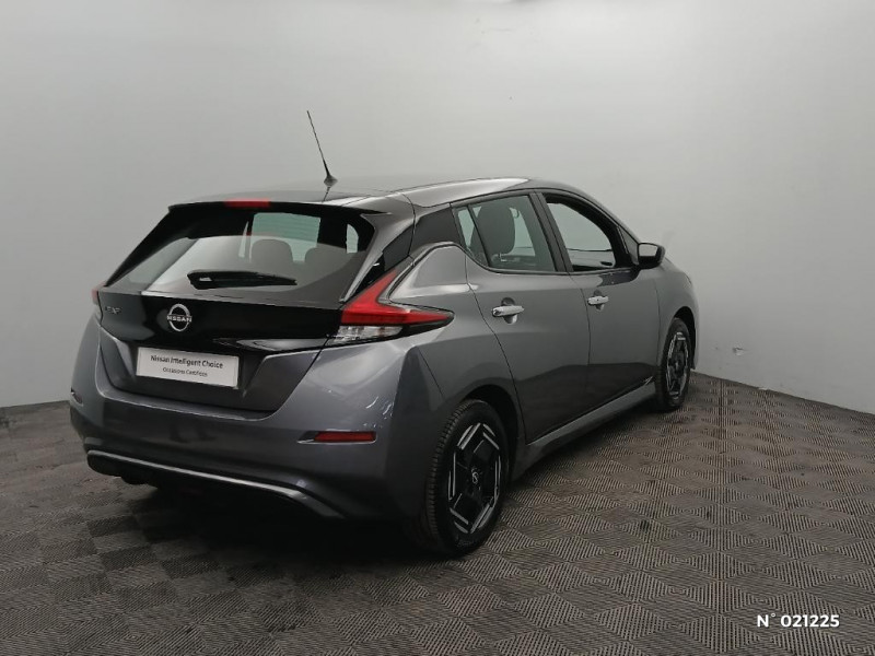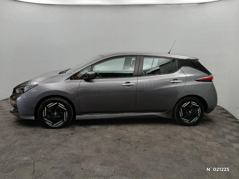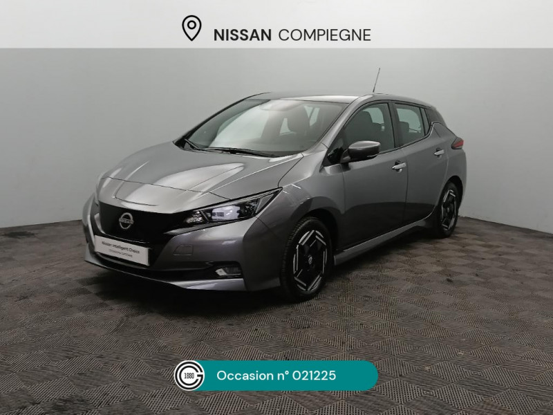 Feux AV halogènes avec signature lumineuse à LED / Feux de route intelligents / Feux diurne LED avec signature lumineuse / Freinage d'urgence intelligent (AEB) avec détection piéton / Indicateur de température extérieure / Kit de réparation pneumatique / Nissan Connect Services / Nissan Connect 8.0 / Ouverture de la trappe de recharge depuis la clé / Pack 100% Mobilité / Pare-soleil côté conducteur et passager avec miroir de courtoisie / Poches aumonières au dos des sièges AV / Poignées de portes chromées / Points d'ancrage de siège enfant ISOFIX à l'AV et 2 à l'AR / Port CHAdeMO pour chargeur rapide 50 kW (recharge de 20% à 80% en 60 min sur 40 kWh ou 90 min sur 62 kWh) / Port USB à l'AV (x1) et l'AR (x2) / Prise auxiliaire Jack 3,5 mm / Prise 12V sur console centrale AV / Programmation de la recharge / Rétroviseurs extérieurs couleur carrosserie avec clignotant à LED intégré / Sécurité enfants sur les portes AR / Sellerie tissu Noir ou Gris Clair / Son d'alerte pour piétons désactivable / Surveillance des angles morts incluant voyant lumineux sur rétroviseurs extérieurs / Système audio Bluetooth, AM/FM, RDS, DAB, MP3, USB (sans CD) / Système "Chassis Control" (contrôle actif de trajectoire et de l'assiette) / Système d'alerte anticollision AR intelligent / Système de climatisation avec pompe à chaleur / Système d'ouverture et de démarrage sans clé "Intelligent key" / Technologie E-pedal / Trois appuis-tête aux places AR / 6 HP / ABS et EBD / Allumage automatique des feux de détresse en cas d'accident / Câble de 6 m (recharge sur prise domestique 230V en 21h sur batterie 40 kWh ou 32h sur batterie 62 kWh) / Câble 32A de 6 m (recharge sur borne publique ou Wallbox 7 kW T2 en 7h30 sur 40 kWh ou 11h30 sur 62 kWh) / Chargeur embarqué de 6,6kW (pour recharge en 7h sur une wallbox de 32A) / Combiné d'instrumentation avec écran HD TFT 7" couleur / Commandes au volant (audio, Bluetooth, régulateur et limiteur de vitesses et contrôle de l'ordinate ur de bord) / Contrôle vocal Nissan / Eclairage de la trappe de recharge / Extinction temporisé des phares "Follow me home"