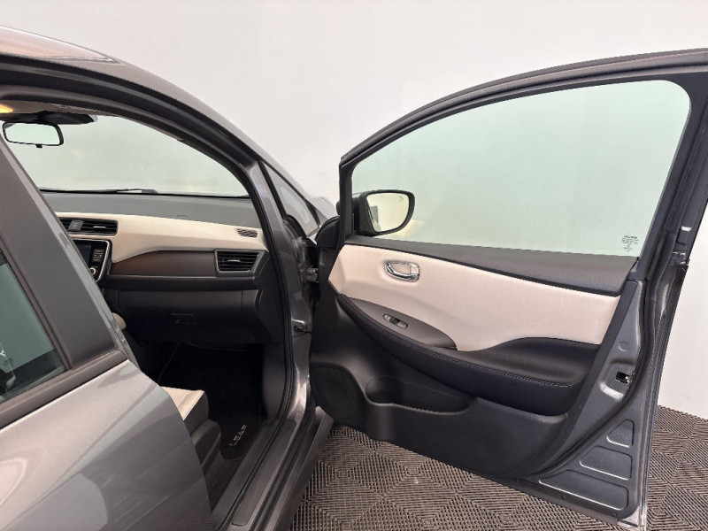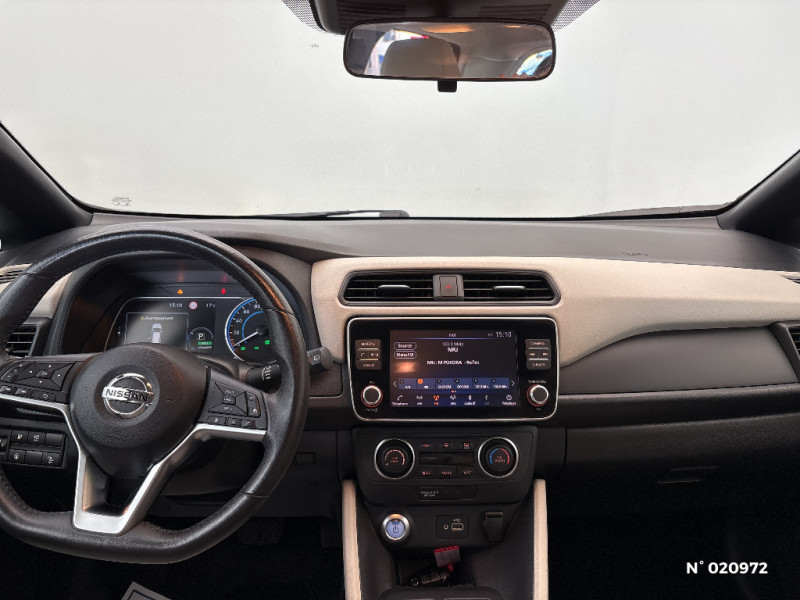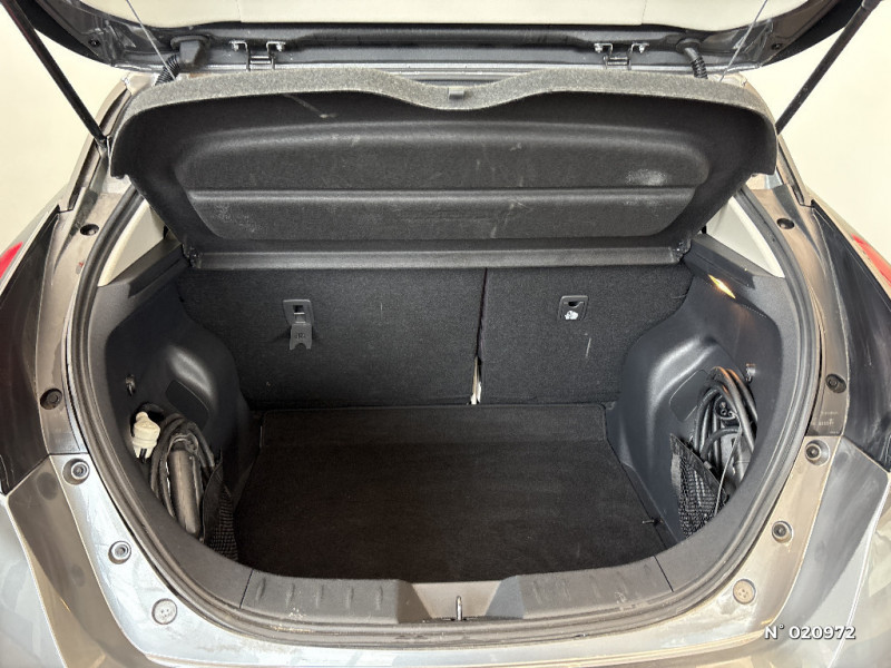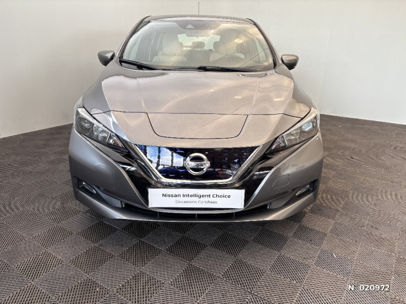 Nissan Connect Services / Nissan Connect 8.0 / Ouverture de la trappe de recharge depuis la clé / Pack 100% Mobilité / Pare-soleil côté conducteur et passager avec miroir de courtoisie / Poches aumonières au dos des sièges AV / Poignées de portes chromées / Points d'ancrage de siège enfant ISOFIX à l'AV et 2 à l'AR / Port CHAdeMO pour chargeur rapide 50 kW (recharge de 20% à 80% en 60 min sur 40 kWh ou 90 min sur 62 kWh) / Port USB à l'AV (x1) et l'AR (x2) / Prise auxiliaire Jack 3,5 mm / Prise 12V sur console centrale AV / Programmation de la recharge / Rétroviseurs extérieurs couleur carrosserie avec clignotant à LED intégré / Sécurité enfants sur les portes AR / Sellerie tissu Noir ou Gris Clair / Son d'alerte pour piétons désactivable / Surveillance des angles morts incluant voyant lumineux sur rétroviseurs extérieurs / Système audio Bluetooth, AM/FM, RDS, DAB, MP3, USB (sans CD) / Système "Chassis Control" (contrôle actif de trajectoire et de l'assiette) / Système d'alerte anticollision AR intelligent / Système de climatisation avec pompe à chaleur / Système d'ouverture et de démarrage sans clé "Intelligent key" / Technologie E-pedal / Trois appuis-tête aux places AR / 6 HP / ABS et EBD / Allumage automatique des feux de détresse en cas d'accident / Câble de 6 m (recharge sur prise domestique 230V en 21h sur batterie 40 kWh ou 32h sur batterie 62 kWh) / Câble 32A de 6 m (recharge sur borne publique ou Wallbox 7 kW T2 en 7h30 sur 40 kWh ou 11h30 sur 62 kWh) / Chargeur embarqué de 6,6kW (pour recharge en 7h sur une wallbox de 32A) / Combiné d'instrumentation avec écran HD TFT 7" couleur / Commandes au volant (audio, Bluetooth, régulateur et limiteur de vitesses et contrôle de l'ordinate ur de bord) / Contrôle vocal Nissan / Eclairage de la trappe de recharge / Extinction temporisé des phares "Follow me home" / Feux AV halogènes avec signature lumineuse à LED / Feux de route intelligents / Feux diurne LED avec signature lumineuse / Freinage d'urgence intelligent (AEB) avec détection piéton / Indicateur de température extérieure / Kit de réparation pneumatique