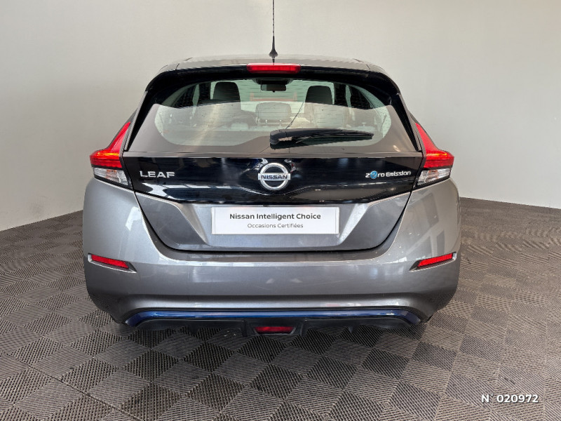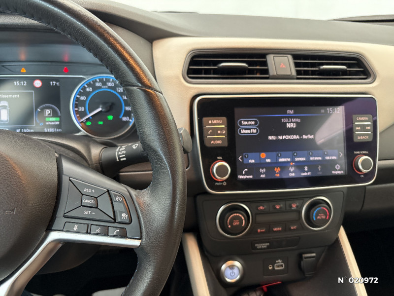 Feux AV halogènes avec signature lumineuse à LED / Feux de route intelligents / Feux diurne LED avec signature lumineuse / Freinage d'urgence intelligent (AEB) avec détection piéton / Indicateur de température extérieure / Kit de réparation pneumatique / Nissan Connect Services / Nissan Connect 8.0 / Ouverture de la trappe de recharge depuis la clé / Pack 100% Mobilité / Pare-soleil côté conducteur et passager avec miroir de courtoisie / Poches aumonières au dos des sièges AV / Poignées de portes chromées / Points d'ancrage de siège enfant ISOFIX à l'AV et 2 à l'AR / Port CHAdeMO pour chargeur rapide 50 kW (recharge de 20% à 80% en 60 min sur 40 kWh ou 90 min sur 62 kWh) / Port USB à l'AV (x1) et l'AR (x2) / Prise auxiliaire Jack 3,5 mm / Prise 12V sur console centrale AV / Programmation de la recharge / Rétroviseurs extérieurs couleur carrosserie avec clignotant à LED intégré / Sécurité enfants sur les portes AR / Sellerie tissu Noir ou Gris Clair / Son d'alerte pour piétons désactivable / Surveillance des angles morts incluant voyant lumineux sur rétroviseurs extérieurs / Système audio Bluetooth, AM/FM, RDS, DAB, MP3, USB (sans CD) / Système "Chassis Control" (contrôle actif de trajectoire et de l'assiette) / Système d'alerte anticollision AR intelligent / Système de climatisation avec pompe à chaleur / Système d'ouverture et de démarrage sans clé "Intelligent key" / Technologie E-pedal / Trois appuis-tête aux places AR / 6 HP / ABS et EBD / Allumage automatique des feux de détresse en cas d'accident / Câble de 6 m (recharge sur prise domestique 230V en 21h sur batterie 40 kWh ou 32h sur batterie 62 kWh) / Câble 32A de 6 m (recharge sur borne publique ou Wallbox 7 kW T2 en 7h30 sur 40 kWh ou 11h30 sur 62 kWh) / Chargeur embarqué de 6,6kW (pour recharge en 7h sur une wallbox de 32A) / Combiné d'instrumentation avec écran HD TFT 7" couleur / Commandes au volant (audio, Bluetooth, régulateur et limiteur de vitesses et contrôle de l'ordinate ur de bord) / Contrôle vocal Nissan / Eclairage de la trappe de recharge / Extinction temporisé des phares "Follow me home"