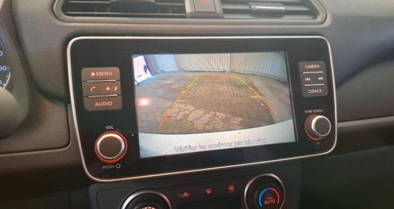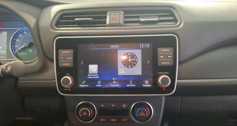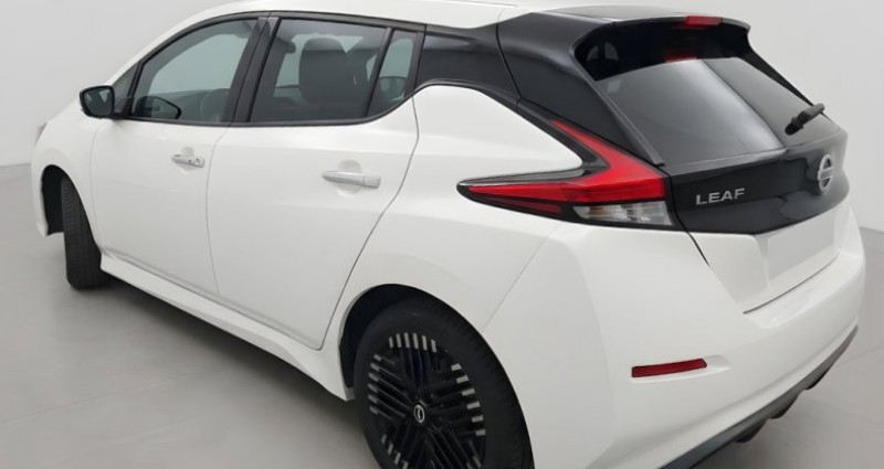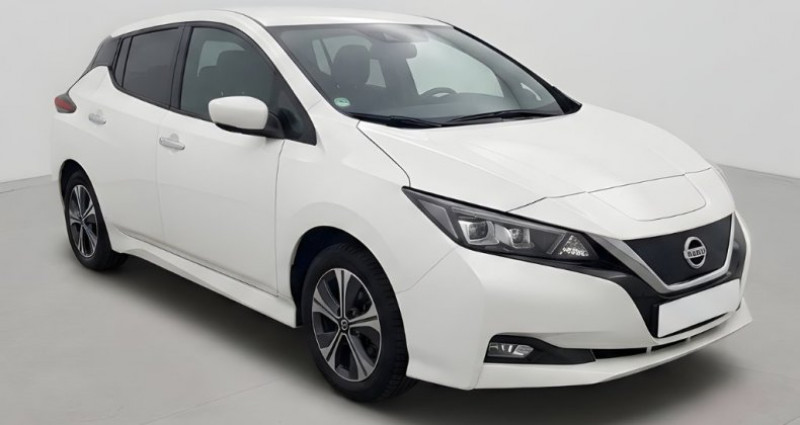 EQUIPEMENTS Poignées de portes chromées, Siège conducteur réglable en hauteur, Volant cuir, Volant réglable en hauteur, Système de contrôle de la pression des pneus, Allumage automatique des feux, Essuie/glace AR à intermittence, Feux AR à LED, Limiteur de vitesse, Ceintures de sécurité AR 3 points à enrouleur, Prise 12V sur console centrale AV, Système de climatisation avec pompe à chaleur, Ouverture de la trappe de recharge depuis la clé, ABS et EBD, Climatisation automatique, ESP, Jantes alliage 17, Commandes au volant (audio Bluetooth régulateur et limiteur de vitesses et contrôle de l'ordinate ur de bord), Freinage d'urgence intelligent (AEB) avec détection piéton, Reconnaissance des panneaux de signalisation, Régulateur de vitesse intelligent, Essuie/glace AV à déclenchement automatique, Système d'ouverture et de démarrage sans clé Intelligent key, Système mains libres Bluetooth, 6 Airbags : frontaux latéraux rideaux, Fermeture et ouverture centralisée des portes à distance, Mode de conduite ECO, Feux antibrouillard AV, Prise auxiliaire Jack 3 5 mm, Nissan Connect 8.0, Câble de 6 m (recharge sur prise domestique 230V en 21h sur batterie 40 kWh ou 32h sur batterie 62 kWh), Câble 32A de 6 m (recharge sur borne publique ou Wallbox 7 kW T2 en 7h30 sur 40 kWh ou 11h30 sur 62 kWh), Trois appuis/tête aux places AR, Port USB à l'AV (x1) et l'AR (x2), Feux AV halogènes avec signature lumineuse à LED, Système audio Bluetooth AM/FM RDS DAB MP3 USB (sans CD), Roue de secours, Rétroviseurs extérieurs couleur carrosserie avec clignotant à LED intégré, Vitres électriques à l'AV et à l'AR, Combiné d'instrumentation avec écran HD TFT 7 couleur, Airbag passager déconnectable (bouton boîte à gants), Rétroviseurs extérieurs dégivrants à réglages électriques, Peinture métallisée Blanc Lunaire,
