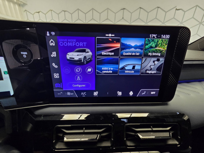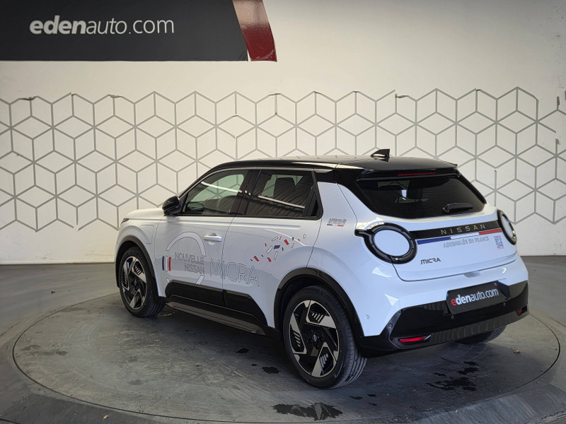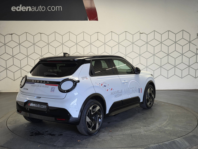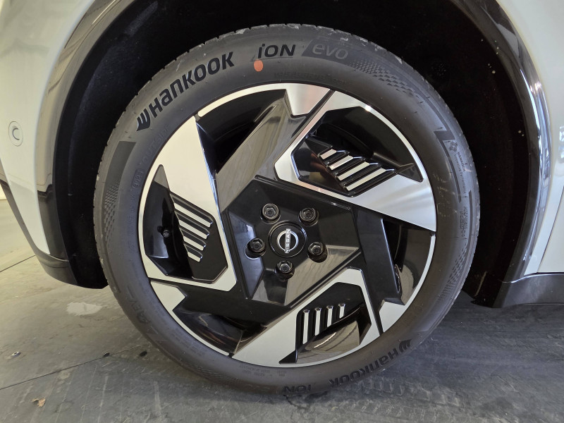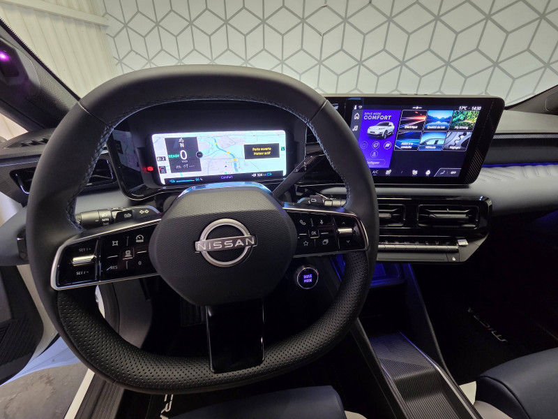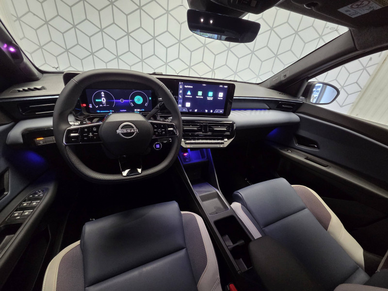 2 connecteurs USB-C AV / Alerte et prévention de sortie de voie / Antenne aileron de requin / Avertisseur de sortie de stationnement en marche AR / Boîte de vitesse à fonction continue / Câble de charge MODE 3 (11 kW) / Chargeur à induction pour Smartphone / Chargeur embarqué 11 kW / Combiné d'infodivertissement digital 10" / Combiné d'instrumentation avec écran couleur 10" / Connecteur Combo CCS 100 kW / Connecteur V2L (détail des fonctionnalités ci-dessous) / Contrôle de la traction (TCS) / Détection intelligente des limitations de vitesse et prévention survitesse (ISA) / Eclairage LED de l'habitacle pour le conducteur et le passager / Freinage d'urgence anticollision AR / Freinage régénératif + E-Pedal avec palettes de changement d'intensité / Frein à main électrique avec Auto Hold / Miroir avec porte-billets dans le pare-soleil pour le conducteur et le passager et éclairage LED pour le passager / Pack Hiver - Volant chauffant - Sièges AV chauffants / Peinture bi-ton / Pochette pour porte-revues AR du siège conducteur / Pompe à chaleur / Rétroviseur intérieur électrochromatique sans contour / Séquence d'accueil personnalisable / Services NissanConnect avec Google intégré / Sièges AV avec réglages manuels 6 voies et conducteur électriquement 2 voies pour lombaires / Spoiler AR / Système audio Premium Harman Kardon avec 9 HP / Système d'alerte anticollision AR intelligent et transversal / Système de navigation NissanConnect avec Google intégrés / Volant en cuir synthétique