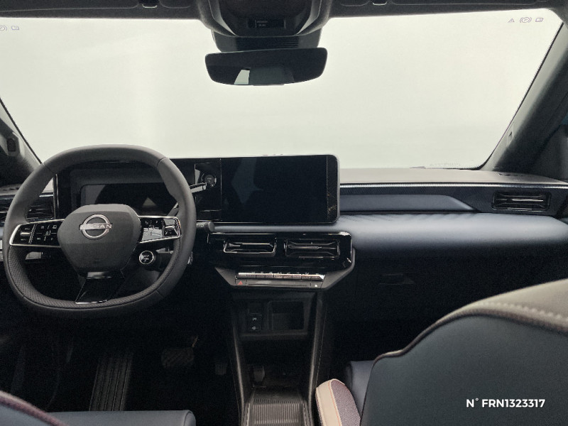 Services NissanConnect avec Google intégré / Sièges AV avec réglages manuels 6 voies et conducteur électriquement 2 voies pour lombaires / Spoiler AR / Système audio Premium Harman Kardon avec 9 HP / Système d'alerte anticollision AR intelligent et transversal / Alerte et prévention de sortie de voie / Antenne aileron de requin / Avertisseur de sortie de stationnement en marche AR / Boîte de vitesse à fonction continue / Câble de charge MODE 3 (11 kW) / Chargeur à induction pour Smartphone / Chargeur embarqué 11 kW / Volant en cuir synthétique / 2 connecteurs USB-C AV / Système de navigation NissanConnect avec Google intégrés / Combiné d'infodivertissement digital 10" / Combiné d'instrumentation avec écran couleur 10" / Connecteur Combo CCS 100 kW / Connecteur V2L (détail des fonctionnalités ci-dessous) / Contrôle de la traction (TCS) / Détection intelligente des limitations de vitesse et prévention survitesse (ISA) / Eclairage LED de l'habitacle pour le conducteur et le passager / Frein à main électrique avec Auto Hold / Freinage d'urgence anticollision AR / Freinage régénératif + E-Pedal avec palettes de changement d'intensité / Miroir avec porte-billets dans le pare-soleil pour le conducteur et le passager et éclairage LED pour le passager / Pack Hiver - Volant chauffant - Sièges AV chauffants / Peinture bi-ton / Pochette pour porte-revues AR du siège conducteur / Pompe à chaleur / Rétroviseur intérieur électrochromatique sans contour / Séquence d'accueil personnalisable