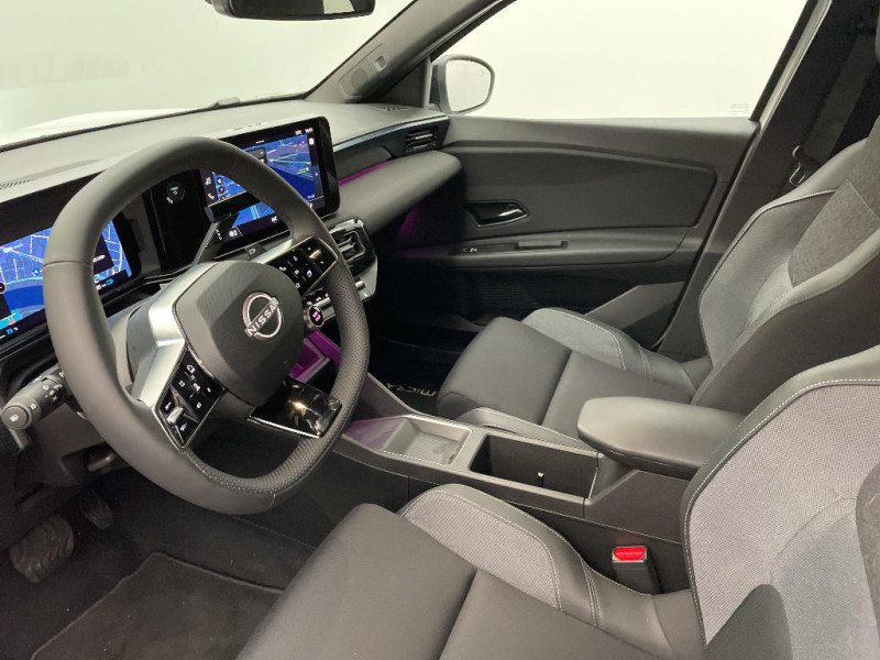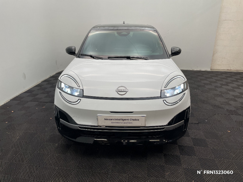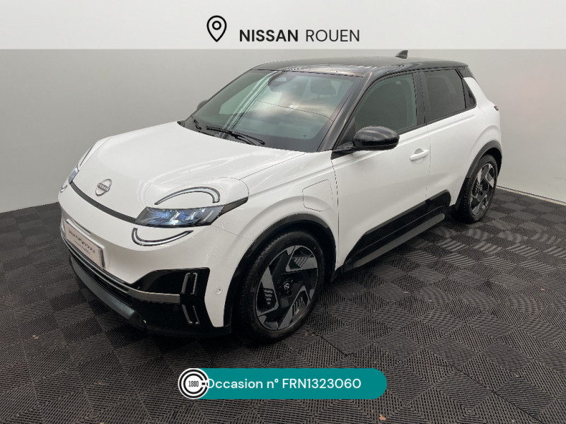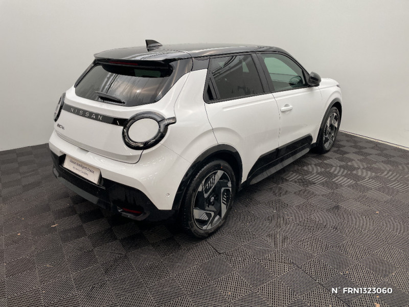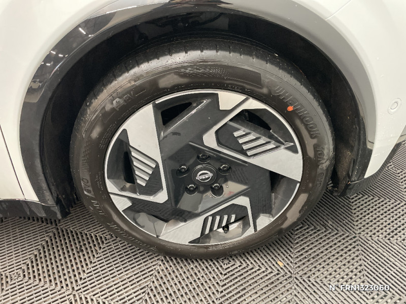 Séquence d'accueil personnalisable / Services NissanConnect avec Google intégré / Sièges AV avec réglages manuels 6 voies / Chargeur embarqué 11 kW / Spoiler AR / Alerte et prévention de sortie de voie / Antenne aileron de requin / Avertisseur de sortie de stationnement en marche AR / Boîte de vitesse à fonction continue / Câble de charge MODE 3 (11 kW) / Chargeur à induction pour Smartphone / Système de navigation NissanConnect avec Google intégrés / Volant en cuir synthétique / 2 connecteurs USB-C AV / Système d'alerte anticollision AR intelligent et transversal / Combiné d'infodivertissement digital 10" / Combiné d'instrumentation avec écran couleur 10" / Connecteur Combo CCS 100 kW / Connecteur V2L (détail des fonctionnalités ci-dessous) / Contrôle de la traction (TCS) / Détection intelligente des limitations de vitesse et prévention survitesse (ISA) / Eclairage LED de l'habitacle pour le conducteur / Frein à main électrique avec Auto Hold / Freinage d'urgence anticollision AR / Freinage régénératif + E-Pedal avec palettes de changement d'intensité / Jantes acier 18" avec enjoliveurs / Jeu de 4 HP Arkamys et 2 tweeters / Miroir avec porte-billets dans le pare-soleil pour le conducteur et le passager et éclairage LED pour le passager / Peinture opaque monoton / Pompe à chaleur
