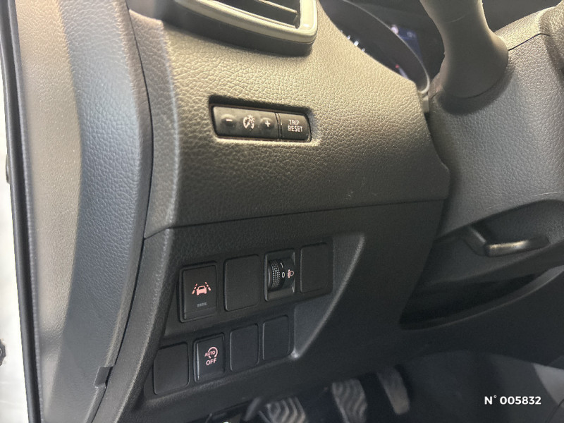 Ciel de toit gris clair / Commandes au volant (audio, Bluetooth, régulateur et limiteur de vitesse, contrôle de l'ordinateur de bord) / Contour des vitres latérales chromé / Direction assistée électrique ajustable (mode Sport ou Normal) / Eclairage d'ambiance intérieur / Fermeture et ouverture centralisées des portes et vitres à distance / Feux AR avec signature LED et effet 3D / Fonction Autohold (aide au stationnement/démarrage) / Sièges AV avec réglage lombaire / Sièges AV "monoform style" / Sièges AV sport "monoform style" / Système audio radio avec ecran tactile 7" avec interface personnalisable, Apple CarPlay, Android Auto, commandes vocales / Système audio Radio, CD/MP3, connexion USB / Système "Châssis Control" / Système d'aide au stationnement : Caméra AR avec repères de gabarit, Caméra AV, Caméras latérales si situées dans les rétroviseurs extérieurs / Vitres latérales AR et vitre de hayon surteintées / Volant et levier de vitesse gainés cuir / 6 HP / Pack Navi / Pack Securité / Pare-soleil côtés conducteur et passager avec miroir de courtoisie éclairé / Peinture opaque / Plancher de coffre modulable - 16 combinaisons / Poignée interieure d'ouverture porte chromée / Poignées de porte couleur carrosserie / Points d'ancrage de siège enfants ISOFIX à l'AR / Porte-gobelets AR / Porte-gobelets AV / Frein à main électrique / Inserts couleur argent pare-chocs AR / Inserts couleur argent pare-chocs AV / Inserts de porte et planche de bord en argent mat 3D / Kit de réparation pneumatique / Nissan Connect : Système de navigation multimédia avec écran tactile couleur 7" / Ordinateur de bord avec écran TFT couleur HD 5" / ABS Système antiblocage des freins / Prise auxiliaire jack 3.5" dans accoudoir central AV / Radio digitale-Réception (DAB) / Rétroviseurs extérieurs avec indicateurs de changement de direction à LED / Rétroviseurs extérieurs couleur carrosserie / Allumage intelligent des phares / Antenne aileron de requin