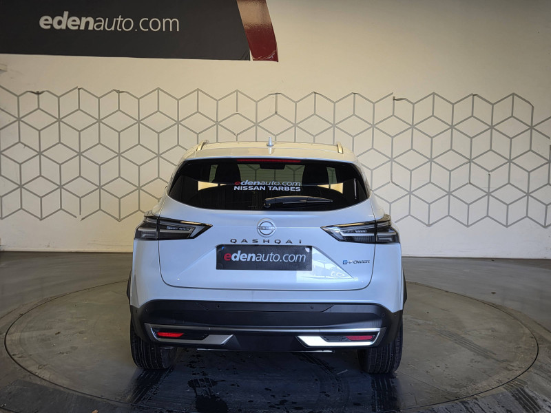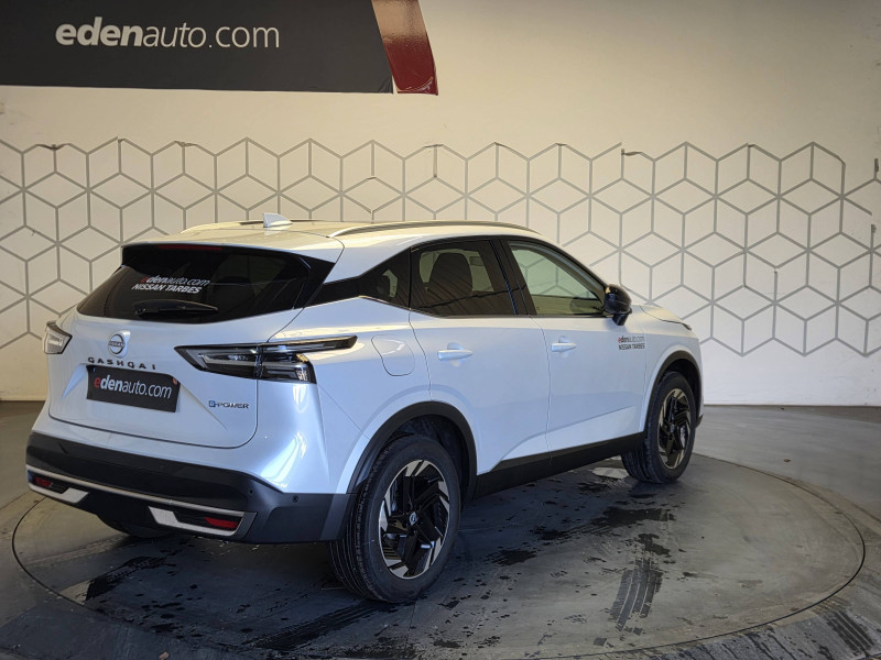 6 crochets de fixation dans le coffre (4 au plancher, 2 sur les côtés) / ABS (système antiblocage des freins) / Accoudoir central AR avec porte-gobelets (2) / Alarme périmétrique / Alerte et prévention de sortie de voie / Antenne aileron de requin Noir / Badges e-POWER / Boîte de vitesses automatique 1 rapports / Bouton d'accès rapide aux réglages des aides à la conduite / Buses de ventilation AR / Cache-bagages amovible / Chargeur à induction pour Smartphone 15W / Ciel de toit Gris clair / Clignotants AV et AR LED / Combiné d'instrumentation digital 12,3'' / Commandes au volant: contrôle de l'ordinateur de bord, audio, téléphone, régulateur et limiteur de vitesse / Compartiment pour lunettes de soleil / Contre-portes et console centrale en TEP / Contrôle de la traction (TCS) / Double port USB AR (USB-A et USB-C) / Double port USB AV et AR (USB-C) / Eclairage d'ambiance personnalisable / Eclairage du coffre (x2) / Feu stop central LED / Feux de détresse à déclenchement automatique / Feux de route adaptatifs / Freinage d'urgence anticollision AR / Freinage d'urgence intelligent avec détection piétons, cyclistes et intersections / Frein à main électrique avec aide au stationnement/démarrage et fonction Autohold / Garantie anticorrosion - perforation 12 ans, kilométrage illimité / Garantie Nissan Privilège Jusqu'à 8 ans de Garantie (moteur, boîte, pont) + Jusqu'à 8 ans d'Assistance 24h/24, 7j/7. Jusqu'à 8 ans ou 160 000 km, conditionnéà entretien annuel dans le réseau Nissan / Garantie peinture 3 ans, kilométrage illimité / Garantie sur tous les composants spécifiques Hybrid, e-POWER 5 ans (limitée à 100 000 km) Liste non exhaustive des composants inclus : batterie lithium-ion, moteur électrique, onduleur, générateur, système de refroidissement de la batterie, etc... / Garantie véhicule neuf 3 ans (limitée à 100 000 km) / Inserts de pare-chocs AV et AR Gris satiné / Kit de réparation pneumatique / Liseuses LED à l'AV et à l'AR / NBAS (amplificateur de freinage d'urgence) / Nissan AVM 3D - Vision Intelligente à 360° : système d'aide au stationnement qui facilite les manoeuvres de stationnement en vous offrant une vision à 360° : Caméra AR avec repères de gabarit, Caméra AV, Caméras latérales situées dans les rétroviseurs extérieurs, Radars 360°, Fonction ''capot transparent'', Mémorisation stationnement régulier et intersections / NissanConnect Services - Services télématiques avec accès à distance depuis un smartphone - Géolocalisation du véhicule - Historique de navigation - Point d'accès WiFi / NissanConnect Services - Services télématiques avec accès à distance depuis un smartphone Services de commandes à distance - Historique de conduite - Mise à jour à distance - Rapports sur l'état de santé du véhicule et alertes de dysfonctionnement - Rappels des pas d'entretien - Aide et assistance Nissan - Alertes intelligentes / Ouverture des portières AR à 85° / Pare-chocs AV et AR Noir mat / Pare-soleil côté conducteur et passager avec miroir de courtoisie éclairé / Planche de bord en TEP / Plancher de coffre modulable / Poignées de maintien pour passager AV et AR / Points d'ancrage pour sièges enfants ISOFIX à l'AR (x2) / Porte-gobelets (x2) / Prise 12V à l'AV (x1) et dans le coffre (x1) / ProPILOT avec Navi-link : technologie de conduite assistée Aide au maintien dans la voie, Freinage anticipé dans les courbes via la navigation, Assistant de conduite en embouteillage, Ajustement aux limitations de vitesse (automatique ou sur commande) / ProPILOT Park : technologie de stationnement automatique / Rails de toit longitudinaux chromés / Régulateur de vitesse intelligent avec ajustement aux limitations de vitesse sur commande / Repose-genoux en TEP / Rétroviseur intérieur électrochromatique sans contour / Sélection du mode de conduite (ECO, STANDARD et SPORT) / Sellerie mixte TEP/Tissu (Noir) / Siège conducteur avec réglage lombaire électrique 2 voies / Système audio radio avec écran tactile 12,3" et 6 HP / Système "Chassis Control" (contrôle actif de trajectoire et de l'assiette) / Système d'alerte anticollision AR intelligent / Système d'alerte prédictif anticollision frontale / Système de navigation NissanConnect avec services Google intégrés Google Maps, Google Assistant, Google Play Store, Live Traffic et cartes 3D, Navigation porte-à-porte, Recherche par Points d'Intérêt, Google Street View, Vue Satellite et Météo, Mise à jour des cartes et logiciels, Prix des carburants / Système d'ouverture et de démarrage sans clé "Intelligent key" avec fonction de verrouillage/ déverrouillage à l'approche du véhicule / Technologie e-Pedal Step / Trappe de carburant sans bouchon