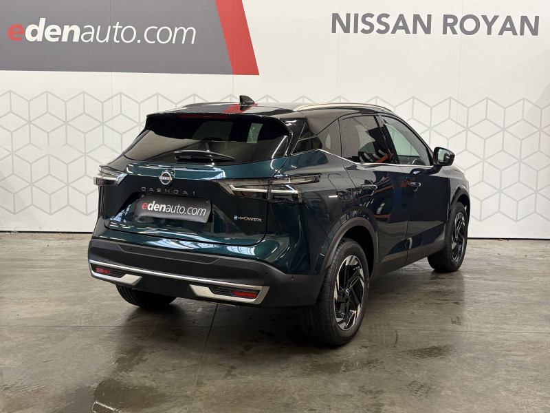 6 crochets de fixation dans le coffre (4 au plancher, 2 sur les côtés) / ABS (système antiblocage des freins) / Accoudoir central AR avec porte-gobelets (2) / Alarme périmétrique / Alerte et prévention de sortie de voie / Antenne aileron de requin Noir / Badges e-POWER / Boîte de vitesses automatique 1 rapports / Bouton d'accès rapide aux réglages des aides à la conduite / Buses de ventilation AR / Cache-bagages amovible / Chargeur à induction pour Smartphone 15W / Ciel de toit Gris clair / Clignotants AV et AR LED / Combiné d'instrumentation digital 12,3'' / Commandes au volant: contrôle de l'ordinateur de bord, audio, téléphone, régulateur et limiteur de vitesse / Compartiment pour lunettes de soleil / Contre-portes et console centrale en TEP / Contrôle de la traction (TCS) / Double port USB AR (USB-A et USB-C) / Double port USB AV et AR (USB-C) / Eclairage d'ambiance personnalisable / Eclairage du coffre (x2) / Feu stop central LED / Feux de détresse à déclenchement automatique / Feux de route adaptatifs / Freinage d'urgence anticollision AR / Freinage d'urgence intelligent avec détection piétons, cyclistes et intersections / Frein à main électrique avec aide au stationnement/démarrage et fonction Autohold / Garantie anticorrosion - perforation 12 ans, kilométrage illimité / Garantie Nissan Privilège Jusqu'à 8 ans de Garantie (moteur, boîte, pont) + Jusqu'à 8 ans d'Assistance 24h/24, 7j/7. Jusqu'à 8 ans ou 160 000 km, conditionnéà entretien annuel dans le réseau Nissan / Garantie peinture 3 ans, kilométrage illimité / Garantie sur tous les composants spécifiques Hybrid, e-POWER 5 ans (limitée à 100 000 km) Liste non exhaustive des composants inclus : batterie lithium-ion, moteur électrique, onduleur, générateur, système de refroidissement de la batterie, etc... / Garantie véhicule neuf 3 ans (limitée à 100 000 km) / Inserts de pare-chocs AV et AR Gris satiné / Kit de réparation pneumatique / Liseuses LED à l'AV et à l'AR / NBAS (amplificateur de freinage d'urgence) / Nissan AVM 3D - Vision Intelligente à 360° : système d'aide au stationnement qui facilite les manoeuvres de stationnement en vous offrant une vision à 360° : Caméra AR avec repères de gabarit, Caméra AV, Caméras latérales situées dans les rétroviseurs extérieurs, Radars 360°, Fonction ''capot transparent'', Mémorisation stationnement régulier et intersections / NissanConnect Services - Services télématiques avec accès à distance depuis un smartphone - Géolocalisation du véhicule - Historique de navigation - Point d'accès WiFi / NissanConnect Services - Services télématiques avec accès à distance depuis un smartphone Services de commandes à distance - Historique de conduite - Mise à jour à distance - Rapports sur l'état de santé du véhicule et alertes de dysfonctionnement - Rappels des pas d'entretien - Aide et assistance Nissan - Alertes intelligentes / Ouverture des portières AR à 85° / Pare-chocs AV et AR Noir mat / Pare-soleil côté conducteur et passager avec miroir de courtoisie éclairé / Planche de bord en TEP / Plancher de coffre modulable / Poignées de maintien pour passager AV et AR / Points d'ancrage pour sièges enfants ISOFIX à l'AR (x2) / Porte-gobelets (x2) / Prise 12V à l'AV (x1) et dans le coffre (x1) / ProPILOT avec Navi-link : technologie de conduite assistée Aide au maintien dans la voie, Freinage anticipé dans les courbes via la navigation, Assistant de conduite en embouteillage, Ajustement aux limitations de vitesse (automatique ou sur commande) / ProPILOT Park : technologie de stationnement automatique / Rails de toit longitudinaux chromés / Régulateur de vitesse intelligent avec ajustement aux limitations de vitesse sur commande / Repose-genoux en TEP / Rétroviseur intérieur électrochromatique sans contour / Sélection du mode de conduite (ECO, STANDARD et SPORT) / Sellerie mixte TEP/Tissu (Noir) / Siège conducteur avec réglage lombaire électrique 2 voies / Système audio radio avec écran tactile 12,3" et 6 HP / Système "Chassis Control" (contrôle actif de trajectoire et de l'assiette) / Système d'alerte anticollision AR intelligent / Système d'alerte prédictif anticollision frontale / Système de navigation NissanConnect avec services Google intégrés Google Maps, Google Assistant, Google Play Store, Live Traffic et cartes 3D, Navigation porte-à-porte, Recherche par Points d'Intérêt, Google Street View, Vue Satellite et Météo, Mise à jour des cartes et logiciels, Prix des carburants / Système d'ouverture et de démarrage sans clé "Intelligent key" avec fonction de verrouillage/ déverrouillage à l'approche du véhicule / Technologie e-Pedal Step / Trappe de carburant sans bouchon