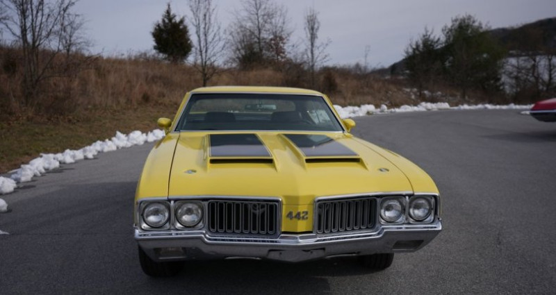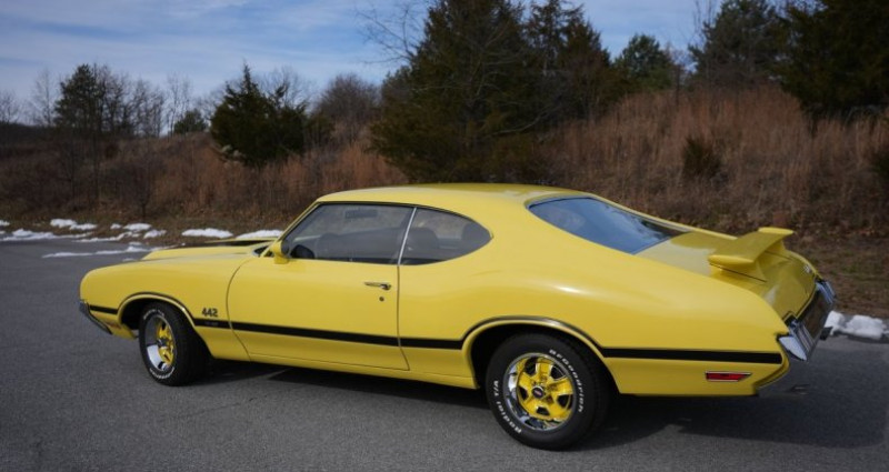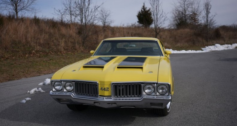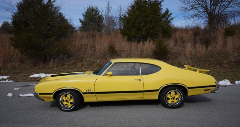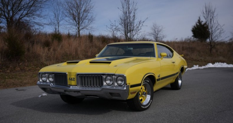 - Marque : Oldsmobile - Modèle : Holiday Coupe - Année : 1970 - Couleur extérieure : Jaune - Couleur intérieure : Noir - Type de carrosserie : Coupé - Transmission : Boîte de vitesses à 4 rapports manuelle - Moteur : Rocket 350 V8 (395558-2) - Kilométrage : 58219 - Équipement : Freinage et direction assistés, spoiler, échappement à double tuyau, air induction. Provenance : Pennsylvania. Disponibilité : environ 7 semaines, clés en main. 42 500 € tout compris (importation, taxes, procédure d'immatriculation). Annonce publiée le 24/12/2025