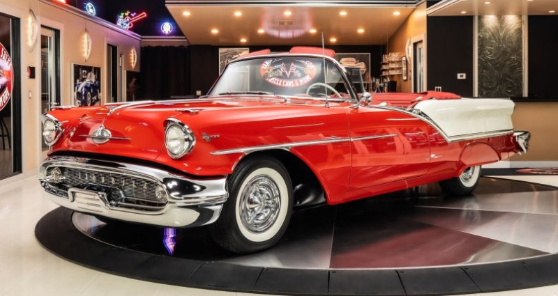 Ce 1957 Oldsmobile Super 88 Convertible a été entièrement restauré sur chassis (Frame Off Restoration) et ne renonce à aucune dépense. Sa carrosserie présente un beau couleur rouge émaillée, avec un toit convertible rouge et des pneus en roues pleines blanchis, des éclats de chrome et des jupes de fender. Sous le capot se trouve le moteur V8 J2 de 371 pouces cubes tri-puissance. Le moteur est relié à une transmission automatique à 3 vitesses Hydromatic et à une boîte de vitesses ouverte arrière avec un taux de pignon de 3, 43:1. La carrosserie est équipée d'un plancher de sol peint en noir, couvert de revêtement de la couleur de la carrosserie. Les caractéristiques supplémentaires comprennent des freins à pompe, direction assistée, système de climatisation à refroidissement après-marché avec le contrôleur de fabrication, pneus blanchis en caoutchouc Coker Classics et plusieurs autres options. L'intérieur est également remarquable avec des sièges bancs rouges en cuir double, le réglage électrique du siège avant et les autres options disponibles. Cette Oldsmobile est un exemple exceptionnellement restauré d'une classique de timeless.. Ce descriptif est basé sur les éléments communiqués par le propriétaire avec un traitement assisté. Merci pour votre indulgence en cas de formulation perfectible. Provenance : Michigan. Disponibilité : 7 semaines, clés en main. 136 000 € tout compris (importation, taxes, procédure d'immatriculation). Annonce publiée le 03/10/2025