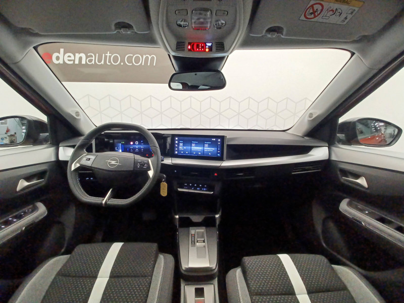1 cléà télécommande et seconde clé rigide / 3 Ports USB-C (1 AV et 2 AR) / 6 HP / Airbags frontaux et latéraux conducteur et passager AV, rideaux (6 airbags) / Air conditionné automatique mono-zone avec 6 aérateurs (4 AV et 2 AR) / Alerte de sous-gonflage des pneumatiques / Allumage et commutation automatique des feux de route/croisement / Arches de roues Noir grainé / Calandre Opel Vizor / Combiné instrumentation numérique 10" / Console centrale avec porte gobelet / Coques de rétroviseurs Noir laqué / Décor intérieur Noir laqué et Argent / Détection de non-bouclage des ceintures de sécurité aux places AV/AR / Ecran infotainment de 10'' Pure Panel / Eléments de carrosserie Noir laqué latérales / Jantes alliage 17" Diamanté Pneus 215/60 R17 / Kit anti-crevaison / Lettrage AR central - Noir / Logo AV Noir / Navigation / Opel Connect avec e-call / b-call / Pack Drive Assist - Aide active au maintien dans la voie - Aide au démarrage en côte - Aide au freinage d'urgence - Alerte anti-somnolence - Régulateur et Limiteur de vitesse - Reconnaissance des panneaux de signalisation étendue / Pare-soleils avec miroir de courtoisie conducteur et passager AV / Peinture bi-ton avec Toit Noir Karbon / Phares AR à LED / Phares AV Eco LED intelliLED / Plancher de coffre modulable 2 positions / Poignées intérieur - Argent / Radio FM/AM/DAB+ / Rangement central flexible à sangles / Reconnaissance vocale / Réglage manuel des feux / Rétroviseur intérieur électrochromatique "Frameless" / Sabots de protection AV/AR Argent / Sellerie Tissu ''Intelli-Seat'' Gris/ Noir / Siège conducteur et passager ergonomique Intelli-Seat avec poches aumonières / Siège passager réglable sur 4 voies / Station d'accueil Smartphone / Système de freinage avec antiblocage des roues (ABS) / Verrouillage centralisé avec télécommande et en roulant