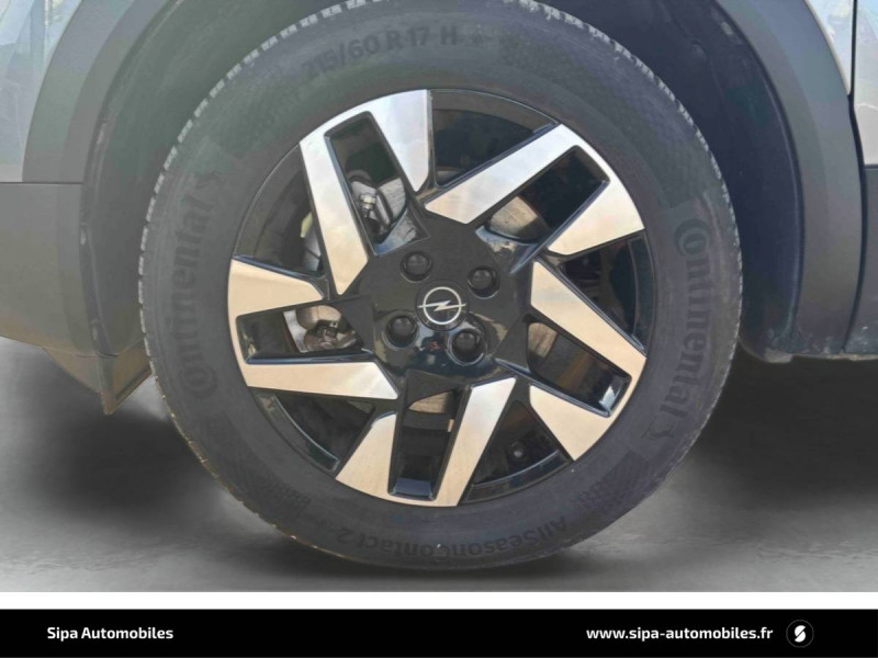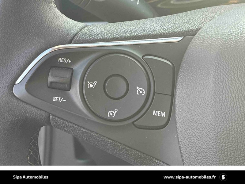 1 cléà télécommande et seconde clé rigide / 1 port USB à l'AV et 2 à l'AR / 6 HP / Accoudoir conducteur avec porte-gobelet / Aide active au maintien dans la voie / Alerte anti-somnolence / Alerte de détection améliorée des piétons et des cyclistes / Alerte de sous-gonflage des pneumatiques / Becquet de toit AR noir / Câble de recharge Mode 3 - 22kW / Calandre Opel Vizor avec contour noir / Caméra de recul panoramique 180° / Chargeur embarqué monophasé 7,4 KW / Ciel de pavillon - Gris / Combiné d'instrumentation numérique 7" / Coquilles de rétroviseurs peintes en noir / Décors intérieur Erino & Liquid Palladium / Détection de non-bouclage des ceintures de sécurité aux places AV / Fonction Bluetooth (appels et streaming audio) / Grille inférieure - Noir grainé / Jantes en alliage 17" Diamanté / Kit anti-crevaison / Lame inférieure - Peinte / Lettrage et logo - Argent / Ligne de vitrage chromée / Opel Connect avec e-call / Pack Visibilité LED / Phares AR à LED / Poignées de portes intérieures chromées / Radio FM/AM/DAB+ / Réglage manuel des feux / Rétroviseur intérieur électrochromatique / Sellerie Tissu / TEP Revolution / Siège passager réglable dans 6 directions / Signature lumineuse en forme d'aile à LED / Système anti-collision à basse vitesse et détection des piétons / Système de freinage avec antiblocage des roues (ABS) / Système Isofix sièges latéraux AR / Verrouillage automatique de la trappe à essence lors de la fermeture du véhicule / Verrouillage des ouvrants en roulant / Vitres AV et AR électriques - système anti-pincement