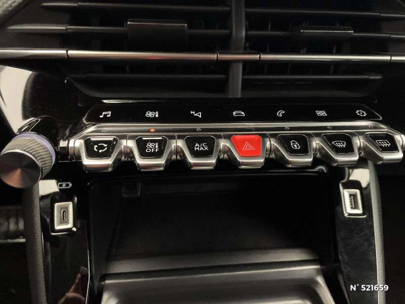 Barres de toit longitudinales Noir Brillant / Pare-brise teinté acoustique / Enjoliveurs de seuil de coffre Métallure / Frein de stationnement électrique avec aide au démarrage en pente et serrage automatique / Rétroviseur intérieur photosensible / Airbags frontaux auto-adaptatifs, latéraux AV (thorax et abdominaux), rideaux AV / Fonctions Mirror Screen (Apple Carplay/Android Auto) / Radio avec écran tactile capacitif 7" couleur, 2 prises USB console AV (1 Data Type A, 1 recharge type C) / Eclairage extérieur d'accueil et d'accompagnement / Fixations suivant norme ISOFIX et Top Tether avec étiquettes de localisation aux places latérales AR / Pack Safety Plus / Becquet AR couleur caisse / Fonction DAB (Radio Numérique Terrestre) / Feux diurnes à LED sous projecteurs / Lève-vitres AV et AR électriques séquentiels avec antipincement / Commandes d'ouverture intérieure de portes chromées / Siège passager AV à réglage manuel en hauteur / Kit de dépannage pneumatique avec conditionnement rigide / Jantes alliage 17'' SALAMANCA diamantées bi-tons Noir Onyx et vernis brillant, cabochons et vis Noir / Katana Noir Mat avec insert Noir Brillant / Passages de roues Noir Mat / Protections latérales de portes Noir grainées avec inserts Métallure / Kit de dépannage de pneumatique compresseur 12 V avec cartouche de produit de colmatage / Projecteurs LED Technology, avec indicateurs de direction à ampoules / Lécheurs de vitres latérales Noir Mat / Vitres latérales AR et lunette AR chauffante temporisée surteintées / Avertisseur de temps de conduite / 6 haut-parleurs (2 tweeters et 2 woofers à l'AV et 2 haut-parleurs à l'AR) / Enjoliveurs de custode Noir Brillant / Aide graphique et sonore au stationnement AR / Sellerie Tri-matière Tissu COSY/TEP, surpiqûres Blue Virtuel / Visio Park 1 / Habitacle et ciel de pavillon gris clair / Commande d'ouverture extérieure couleur caisse / 4 poignées de maintien (2 à l'AV et 2 à l'AR) / Démarrage mains libres avec 2 télécommandes 3 boutons mains libres / Rétroviseurs extérieurs dégivrants avec réglage et rabattement électriques,éclairage de seuil / Plancher de coffre modulable 2 positions / Programme de Stabilité Electronique (ESC) avec ASR, ABS, REF, AFU, CDS et TSM / Détection de sous-gonflage indirecte / Peugeot i-Cockpit 3D avec combiné tête haute numérique 3D / Air conditionné automatique monozone / 2 prises USB (Recharge type A) sur console haute pour passagers AR / Calandre avec grille supérieure noir grainée et marquage horizontal Chrome Brillant, grille inférieure avec décor Métallure, enjoliveur supérieur Noir Brillant / Canules d'échappement doubles droite et gauche chromées / Coques de rétroviseurs extérieurs avec répétiteurs latéraux à LED / Filets aumônières au dos des sièges AV / Eclairage de coffre à ampoule / Eclairage intérieur à LED / Seuils de portes AV en inox avec marquage PEUGEOT Noir / Console haute avec accoudoir intégré / Planche de bord slush et panneaux de portes AV avec décors aspect carbone et baguette Noir Brillant avec jonc chromé / Essuie-vitre AV à déclenchement automatique