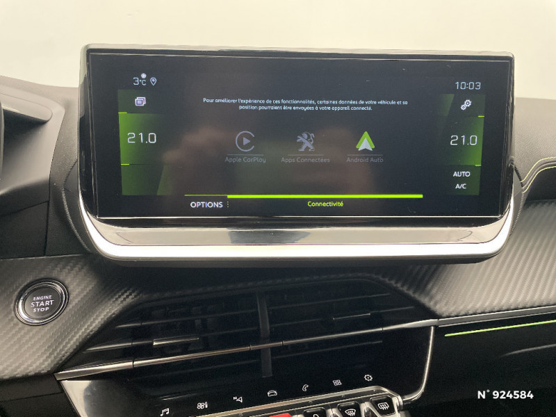 Canule d'échappement chromée (droite) / Fonction DAB (Radio Numérique Terrestre) / Surtapis AV et AR noirs avec surpiqûres Vert Adamite / Ceinture de sécurité AR centrale 3 points, avec détection de non bouclage / Pack Drive Assist / Calandre haut de gamme avec grille supérieure avec marquage Dark Chrome et enjoliveur supérieur Noir Brillant / Jantes alliage 17'' BRONX avec inserts Noir Brillant et vernis Dark Coat / Sellerie Alcantara Mistral/TEP, surpiqûres Bleu Moyen et Vert Adamite / Fonction "Mirror Screen" (Apple CarPlay / Android Auto ) / Décor panneaux de portes de portes Noir et Orange / Projecteurs "Peugeot Full LED Technology" avec signature 3 griffes / 2 prises USB (Recharge type A) sur console basse pour passagers AR / Ceintures de sécurité AR latérales avec enrouleurs pyrotechniques, limiteurs d'effort et détection de non bouclage / Bandeau entre feux AR noir brillant / Programme de Stabilité Electronique (ESC) avec ASR, ABS, REF, AFU, CDS et TSM / 6 haut-parleurs (2 tweeters et 2 woofers à l'AV et 2 larges bandes à l'AR) / Fixations suivant norme ISOFIX aux places latérales AR avec étiquettes de localisation, et Top Tether / Fixations suivant norme ISOFIX sur siège passager AV avec étiquettes de localisation / Lève-vitres AV électriques et séquentiels avec antipincement / Eclairage coffre à lampe / Enjoliveurs de pied milieu brillant avec sérigraphies AV / PEUGEOT Connect SOS & Assistance et Telemaintenance / Essuie-vitre AV à déclenchement automatique / Pédalier aluminium / Pack Safety Plus / Navigation 3D connectée avec reconnaissance vocale, écran tactile capacitif 10" HD 2 prises USB sur console AV, Cartographie Europe,Trafic en temps réel by TomTom Services (Informations trafic, Stations services, Parkings, Météo, Recherche Locale), abonnement 3 ans inclus Zones de danger by TomTom Services, abonnement 3 ans inclus. Connexion automatique et permanente via carte SIM intégrée au véhicule / Seuils de portes AV en Inox / 4 poignées de maintien (2 à l'AV et 2 à l'AR) / Pare-brise teinté acoustique / Eclairage intérieur à LED : plafonniers tactiles AV (1 lampe et 2 liseuses) et AR (2 liseuses), pares-soleils, cave à pieds / Visio Park 1 Caméra de recul avec restitution sur l'écran tactile d'une vue AR et d'une vue de dessus de l'environnement AR du véhicule + Aide graphique et sonore au stationnement AR / Passages de roue Noir brillant / Planche de bord slush surpiquée et panneaux de portes AV avec décors aspect carbone et éclairage polyambiant 8 couleurs / Ceintures de sécurité AV conducteur et passager à enrouleurs pyrotechniques avec limiteurs d'effort et détection de non bouclage / Avertisseur de temps de conduite / Lécheurs de vitres latérales Noir Brillant / Feux diurnes à LED sous projecteurs / Habitacle et ciel de pavillon noir / Frein de stationnement électrique avec aide au démarrage en pente et serrage automatique / Air conditionné automatique mono-zone / Commutation automatique des feux de route / feux de croisement / Siège passager AV à réglage manuel en hauteur / Rétroviseur intérieur photosensible frameless / Aide graphique et sonore au stationnement AR / Rétroviseurs extérieurs dégivrants avec réglage et rabattement électriques / Vitres latérales AR et lunette AR chauffante temporisée surteintées / 1 Poignée de maintien passager AV / Volant compact cuir fleur avec laà§age vert, Lion chromé et badge GT et commandes multimédia sur volant / Peugeot i-Cockpit 3D avec combiné tête haute numérique 3D / Lève-vitres AR électriques et séquentiels avec antipincement / Aide graphique et sonore au stationnement AV / Détection de sous-gonflage indirecte / Jupes de pare-chocs AR inférieure et supérieure Noir brillant / Console haute avec accoudoir intégré / Accès et démarrage mains libres Proximity