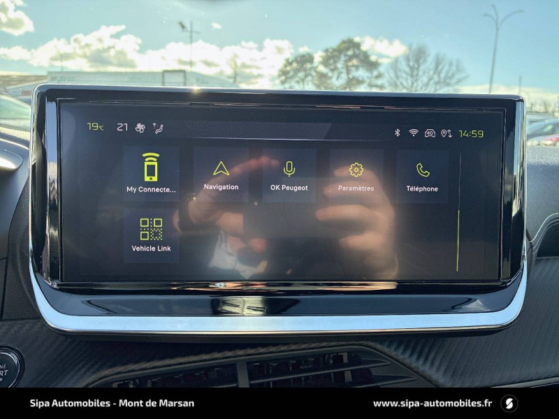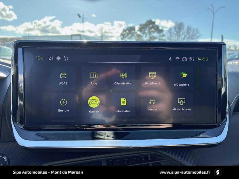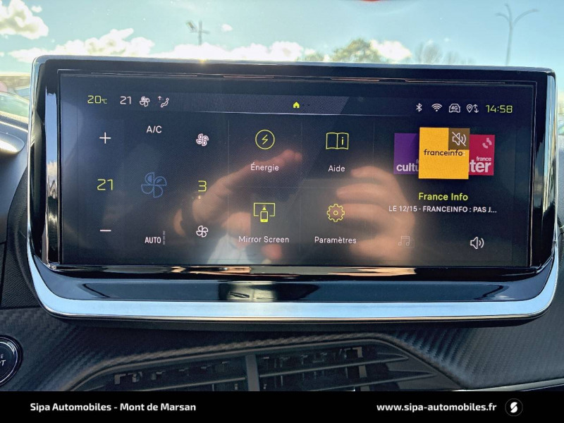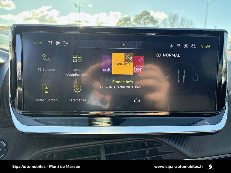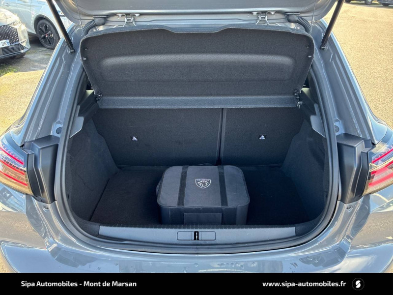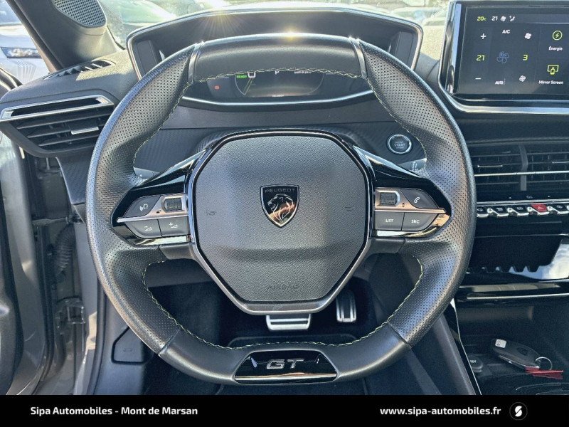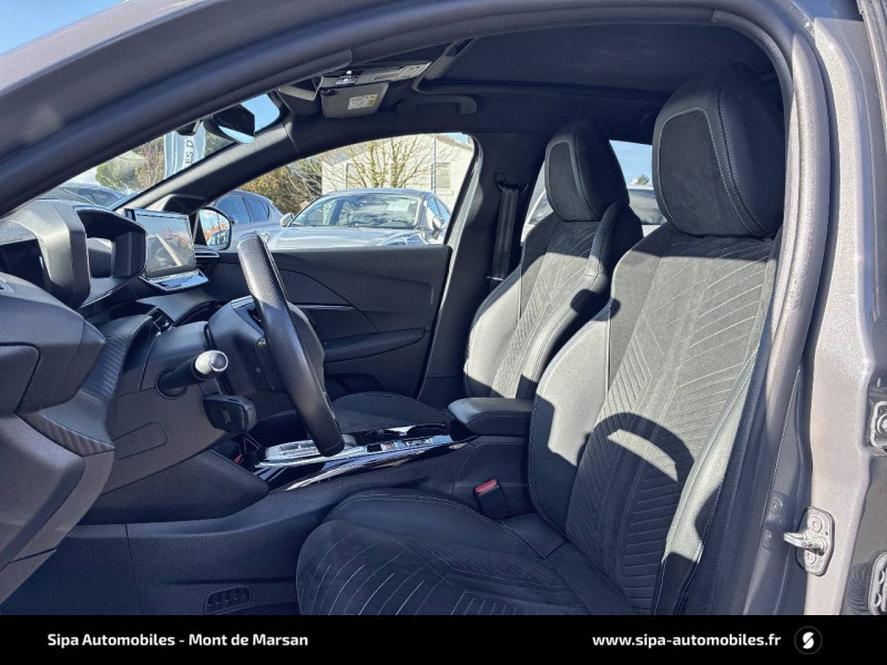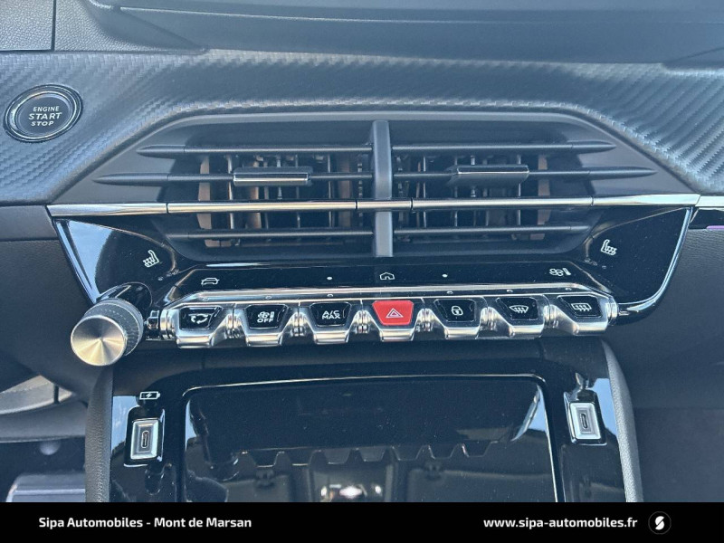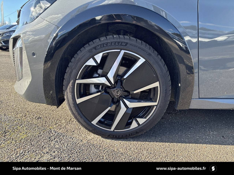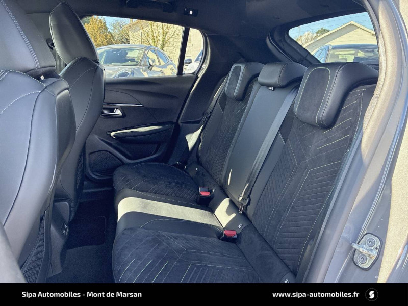 1 prise USB type C (Charge) et 1 prise USB type A (Charge) pour passagers AR / 4 poignées de maintien rétractables (2 à l'AV et 2 à l'AR) / 6 HP (2 tweeters et 2 woofers à l'AV et 2 larges bandes à l'AR) / Accès et démarrage mains libres Proximity / Accoudoirs sur portes AV et AR en TEP avec surpiqûre Adamite / Aide graphique et sonore au stationnement AR / Airbags frontaux auto-adaptatifs, latéraux AV et rideaux AV et AR / Air conditionné automatique mono-zone / Antenne requin / Becquet rapporté Noir Brillant / Câble électrique mode 3 triphasé 22 kW / Calandre haute de gamme noir grainée avec marquage couleur caisse / Ceinture de sécurité AR centrale 3 points, avec détection de non bouclage / Ceintures de sécurité AR latérales avec enrouleurs pyrotechniques, limiteurs d'effort et détection de non bouclage / Ceintures de sécurité AV conducteur et passager à enrouleurs pyrotechniques avec limiteurs d'effort et détection de non bouclage / Chargeur embarqué 7,4 kW monophasé / Commande d'ouverture des portes couleur caisse / Commutation automatique des feux de route / feux de croisement / Console haute avec accoudoir intégré 1 prise USB type C (Charge) et 1 prise USB type A (Charge) pour passagers AR, Sélecteur de mode de conduite (Normal/Eco/Sport) / Détection de sous-gonflage indirecte / Eclairage coffre à lampe / Eclairage intérieur Eclairager AV I-DOME à LED (1 plafonnier et 2 liseuses), 2 liseuses à LED AR, Miroir de courtoisie dans pare-soleil éclairéà LED, Eclairage à LED partie basse rangement et caves à pieds / Eclairage polyambiant 8 couleurs (Liés aux modes de conduite) / Enjoliveur bas de calandre Noir Brillant / Enjoliveur DRL Noir Brillant / Enjoliveur entre feux AR noir brillant / Enjoliveurs d'ailes Noir Brillant / Enjoliveur supérieur de calandre Noir Brillant / ESP Déconnectable avec aide au démarrage en pente / Essuie-vitre AV à déclenchement automatique / Feux AR signature 3 griffes, stop, recul et indicateur de direction à LEDs / Frein de stationnement électrique / Habitacle et ciel de pavillon Noir / Jantes alliage 17" diamantées YANAKA bi--ton vernis brillant et Noir Orbital avec inserts Noir Orbital et vernis mat / Jupes AR inférieure Noir brillant / Jupes AR supérieure Noir brillant / Lécheurs de vitres latérales Noir Brillant / Lève-vitres AR électriques et séquentiels avec antipincement / Lève-vitres AV électriques et séquentiels avec antipincement / Pack Safety / Pack Visibilité / Panneaux de porte AR avec grain Karsten avec baguette Noir brillant / Panneaux de porte AV avec médaillon TPE surmoulé Carbone, baguette Noir brillante avec jonc lumineux (8 couleurs) et crosse de tirage TEP avec surpiqûres Adamite / Pédalier aluminium / PEUGEOT Connect SOS & Assistance et Teleservices SOS & Assistance : Appel d'urgence automatique ou manuel par push SOS, et mise en relation directe avec la plateforme d'assistance PEUGEOT (24h/24 7j/7) Teleservices: Détection du besoin d'une intervention technique ou d'une opération d'entretien périodique et transmission au réseau PEUGEOT pour prise de rendez vous / Peugeot i-Cockpit 3D avec combiné tête haute numérique 10'' / Peugeot i-Connect: Radio DAB avec écran tactile couleur personnalisable 10" HD, Bluetooth, Mirror Screen sans fil (Apple CarPlay/Android Auto), Wifi, 1 prise USB type C ( Data+charge) et 1 prise USB type C (Charge) sur console AV / Planche de bord Slush avec Décor Carbone TPE et double surpiqûres Adamite/Tramontane et baguette Noir brillante avec jonc chromé et jonc lumineux / Prise 12 V et rangement pour smartphone en façade centrale / Programme de Stabilité Electronique (ESC) avec ASR, ABS, REF, AFU, CDS et TSM / Projecteurs "Peugeot Full LED Technology" avec feux diurnes à LED 3 griffes / Recharge smartphone sans fil / Rétroviseur intérieur électrochrome sans cadre / Rétroviseurs extérieurs dégivrants avec réglage et rabattement électriques, éclairage de seuil / Sélecteur de mode de conduite (Normal/Eco/Sport) / Sellerie tissu BELOMKA, accompagnement TEP Isabella, trimatière Uni Capy et surpiqûres Vert Adamite / Seuils de portes AV aluminium siglés PEUGEOT / Siège passager AV à réglage manuel en hauteur et lombaire pneumatique / Surtapis AV/AR / Télécommande 3 boutons + clé standard / Visiopark 1 Aide au stationnement AV et AR graphique et sonore, Caméra de recul avec restitution sur l'écran tactile d'une vue AR, et d'une vue de dessus de l'environnement AR du véhicule / Vitres latérales AR et lunette AR chauffante temporisée surteintées / Volant compact cuir fleur avec commandes multimédia intégrées et badge GT