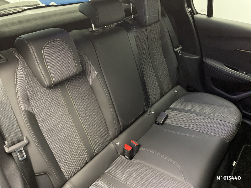 Fonction "Mirror Screen" (Apple CarPlay / Android Auto ) / Programme de Stabilité Electronique (ESC) avec ASR, ABS, REF, AFU, CDS et TSM / Calandre haut de gamme avec grille supérieure avec marquage couleur caisse et enjoliveur supérieur Noir Brillant / Rétroviseur intérieur photosensible frameless / Jupes de pare-chocs AR inférieure et supérieure Noir brillant / Lécheurs de vitres latérales Noir Brillant / Câble électrique mode 3, prises de charge T2/T2 / Seuil de portes lettrage "PEUGEOT" / Démarrage mains libres avec 2 télécommandes 3 boutons / Ceintures de sécurité AV conducteur et passager à enrouleurs pyrotechniques avec limiteurs d'effort et détection de non bouclage / Frein de stationnement électrique avec aide au démarrage en pente et serrage automatique / PEUGEOT Connect SOS & Assistance et Telemaintenance / Détection de sous-gonflage indirecte / Habitacle et ciel de pavillon noir / Sellerie Tri matière Tissu CAPY/TEP surpiqûres Vert Adamite / Pare-brise teinté acoustique / Kit de dépannage de pneumatique / Monogramme extérieur GT sur custode et volet de coffre / Navigation 3D connectée avec reconnaissance vocale, écran tactile capacitif 7" 2 prises USB sur console AV, Cartographie Europe,Trafic en temps réel by TomTom Services (Informations trafic, Stations services, Parkings, Météo, Recherche Locale), abonnement 3 ans inclus, Zones de danger by TomTom Services, abonnement 3 ans inclus. Connexion automatique et permanente via carte SIM intégrée au véhicule / Lève-vitres AR électriques et séquentiels avec antipincement / Pack Safety / Visio Park 1 Caméra de recul avec restitution sur l'écran tactile d'une vue AR et d'une vue de dessus de l'environnement AR du véhicule + Aide graphique et sonore au stationnement AR / Essuie-vitre AV à déclenchement automatique / Pédalier aluminium / Lève-vitres AV électriques et séquentiels avec antipincement / Commutation automatique des feux de route / feux de croisement / Vitres latérales AR et lunette AR chauffante temporisée surteintées / Aide graphique et sonore au stationnement AR / Rétroviseurs extérieurs dégivrants avec réglage et rabattement électriques / Jantes alliage 17'' BRONX avec inserts Noir Brillant et vernis Dark Coat / Fonction DAB (Radio Numérique Terrestre) / Console haute avec accoudoir intégré / Feux diurnes à LED sous projecteurs / Décor panneaux de portes Noir et Azure / Planche de bord slush et panneaux de portes AV avec décors aspect carbone / Air conditionné automatique mono-zone / Aide graphique et sonore au stationnement AV / Siège passager AV à réglage manuel en hauteur / 2 prises USB (Recharge type A) sur console basse pour passagers AR / Eclairage intérieur à LED : plafonniers tactiles AV (1 lampe et 2 liseuses) et AR (2 liseuses), pares-soleils, cave à pieds / Volant compact cuir fleur avec laçage vert, Lion chromé et badge GT et commandes multimédia sur volant / Surtapis AV et AR noirs avec surpiqûres Vert Adamite / Radio avec écran tactile 7" couleur capacitif, 2 prises USB (DATA type A, recharge type C) sur console AV / Fixations suivant norme ISOFIX aux places latérales AR avec étiquettes de localisation, et Top Tether / Projecteurs "Peugeot Full LED Technology" avec signature 3 griffes / Passages de roue Noir brillant / Planche de bord slush surpiquée et panneaux de portes AV avec décors aspect carbone et éclairage polyambiant 8 couleurs / 4 poignées de maintien (2 à l'AV et 2 à l'AR) / Avertisseur de temps de conduite / 1 Poignée de maintien passager AV / Ceintures de sécurité AR latérales avec enrouleurs pyrotechniques, limiteurs d'effort et détection de non bouclage / Fixations suivant norme ISOFIX sur siège passager AV avec étiquettes de localisation / Chargeur embarqué 7,4 kW monophasé / Peugeot i-Cockpit avec combiné tête haute analogique et matrice couleur 3"5 / 6 haut-parleurs (2 tweeters et 2 woofers à l'AV et 2 larges bandes à l'AR) / Ceinture de sécurité AR centrale 3 points, avec détection de non bouclage / Bandeau entre feux AR noir brillant / Eclairage coffre à lampe