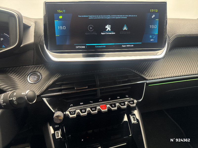 Reconnaissance étendue des panneaux / Vitres latérales AR et lunette AR chauffante temporisée teintées / Rétroviseur intérieur photosensible frameless - sans cadre / Feux diurnes à LED sous projecteurs / Détection de sous-gonflage indirecte / Projecteurs "Peugeot Full Led Technology" / Habitacle et ciel de pavillon noir / Lève-vitres AV électriques et séquentiels avec antipincement / Kit de dépannage de pneumatique / Commutation automatique des feux de route / feux de croisement / Avertisseur de temps de conduite / Signature lumineuse avant DRL à LED sous projecteurs / Fonction DAB (Radio Numérique Terrestre) / Démarrage mains libres avec 2 télécommandes 3 boutons mains libres / Console haute avec accoudoir intégré / Navigation 3D Connectée avec écran tactile 10'' HD couleur : 2 prises USB (Data et recharge) sur console AV, 2 prises AR sur console haut(recharge), Fonction DAB (Radio Numérique Terrestre) / Air conditionné automatique mono-zone / Câble électrique mode 2, prises de charge T2/EF type Green'up / Navigation 3D connectée avec reconnaissance vocale, écran tactile capacitif 10" HD / Visio Park 1 / Sellerie Tri matière Tissu CAPY/TEP surpiqûres Vert Adamite / PEUGEOT Connect SOS & Assistance / Rétroviseurs extérieurs dégivrants avec réglage et rabattement électriques / Calandre haut de gamme avec grille supérieure avec marquage couleur caisse et enjoliveur supérieur Noir Brillant / Aide graphique et sonore au stationnement AR / Pack Safety Plus / Eclairage intérieur à LED : plafonniers tactiles AV (1 lampe et 2 liseuses) et AR (2 liseuses), pares-soleils, cave à pieds / Rétroviseurs extérieurs dégivrants avec réglage et rabattement électriques,éclairage de seuil / Pack Safety / Filets aumônières au dos des sièges AV / 6 haut-parleurs (2 tweeters et 2 woofers à l'AV et 2 larges bandes à l'AR) / Seuils de portes AV en Inox / Eclairage coffre à lampe / 4 poignées de maintien (2 à l'AV et 2 à l'AR) / Ceinture de sécurité AR centrale 3 points, avec détection de non bouclage / Essuie-vitre AV à déclenchement automatique / Ceintures de sécurité AV conducteur et passager à enrouleurs pyrotechniques avec limiteurs d'effort et détection de non bouclage / Programme de Stabilité Electronique (ESC) avec ASR, ABS, REF, AFU, CDS et TSM / Teinte métallisée Jaune Faro / Vitres latérales AR et lunette AR surteintées / Projecteurs "Peugeot Full LED Technology" avec feux diurnes et clignotants AV à LED / Volant compact cuir fleur avec laçage vert, Lion chromé et badge GT et commandes multimédia sur volant / 2 prise USB sur console AV / Siège passager AV à réglage manuel en hauteur / Fonction "Mirror Screen" (Apple CarPlay / Android Auto / MirrorLink) / Peugeot i-Cockpit 3D avec combiné tête haute numérique 3D / Jantes alliage 17'' SHAW avec inserts spécifique EV / 2 prises USB (Recharge type A) sur console basse pour passagers AR / Fixations suivant norme ISOFIX aux places latérales AR avec étiquettes de localisation, et Top Tether / Ceintures de sécurité AR latérales avec enrouleurs pyrotechniques, limiteurs d'effort et détection de non bouclage / PEUGEOT Connect SOS & Assistance et Telemaintenance / Bandeau entre feux AR noir brillant / Rétroviseur intérieur photosensible frameless / Planche de bord slush surpiquée et panneaux de portes AV avec décors aspect carbone et éclairage polyambiant 8 couleurs / Lève-vitres AR électriques et séquentiels avec antipincement / Signature LED sur pare-choc AV / Surtapis AV et AR noirs avec surpiqûres Vert Adamite / Aide graphique et sonore au stationnement AV / Volet de rangement smartphone / Pédalier aluminium / Lécheurs de vitres latérales Noir Brillant / Fixations suivant norme ISOFIX sur siège passager AV avec étiquettes de localisation / Chargeur embarqué 7,4 kW monophasé / Passages de roue Noir brillant / Jupes de pare-chocs AR inférieure et supérieure Noir brillant / Console haute avec accoudoir central finition TEP et surpiqûres tramontane / Visio Park 1 Caméra de recul avec restitution sur l'écran tactile d'une vue AR et d'une vue de dessus de l'environnement AR du véhicule + Aide graphique et sonore au stationnement AR / Fonction Mirror Screen / Frein de stationnement électrique avec aide au démarrage en pente et serrage automatique / Pare-brise teinté acoustique