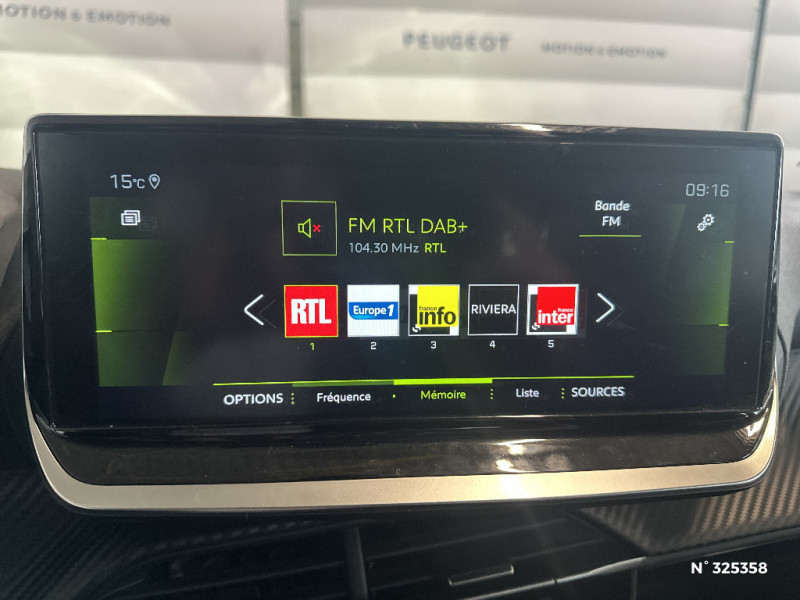 Becquet rapporté Noir Brillant / Calandre Noir grainée avec marquage noir brillant polymirroir / Ceinture de sécurité AR centrale 3 points, avec détection de non bouclage / 1 prise USB type C (Charge) et 1 prise USB type A (Charge) pour passagers AR / 3 poignées de maintien rétractables (1passager à l'AV et 2 à l'AR) / 6 Airbags (Frontaux auto-adaptatifs, latéraux AV et rideaux AV/AR) / 6 HP (2 tweeters et 2 woofers à l'AV et 2 larges bandes à l'AR) / Projecteurs halogènes avec feux diurnes à LED / Projecteurs Peugeot LED Technology avec feux diurnes à LED 3 griffes / PEUGEOT Connect SOS & Assistance et Teleservices SOS & Assistance : Appel d'urgence automatique ou manuel par push SOS, et mise en relation directe avec la plateforme d'assistance PEUGEOT (24h/24 7j/7) Teleservices: Détection du besoin d¿une intervention technique ou d¿une opération d'entretien périodique et transmission au réseau PEUGEOT pour prise de rendez vous / Peugeot i-Cockpit avec combiné tête haute analogique et matrice couleur 3,5" / Planche de bord Injecté avec Décor Carbone injecté et baguette Noir brillante avec jonc chromé / Planche de bord Injecté avec Décor Carbone injecté et baguette Noir brillante avec jonc chromé ( planche slush en électrique) / Prise 12 V et rangement pour smartphone en façade centrale / Programme de Stabilité Electronique (ESC) avec ASR, ABS, REF, AFU, CDS et TSM / Enjoliveur supérieur de calandre Noir grainé / ESP Déconnectable avec aide au démarrage en pente / Feux AR signature 3 griffes, stop à LEDs, recul et indicateur de direction à lampe / Habitacle et ciel de pavillon clair / Jantes tôle 16" avec enjoliveurs MONTI Gris Eclat avec vernis brillant & noir grainé / Jupes AR inférieure noir grainé / Jupes AR supérieure noir grainé / Kit de dépannage de pneumatique / Lécheurs de vitres Noir mat / Lève-vitres AR électriques et séquentiels avec antipincement / Lève-vitres AV électriques et séquentiels avec antipincement / Pack Safety / Pack Safety Régulateur / Limiteur de vitesse, Freinage d'urgence automatique avec alerte risque de collision, Alerte active de franchissement involontaire de ligne et bas côté, Reconnaissance étendue des panneaux de signalisation et préconisation de vitesse, Alerte attention conducteur / Pack Visibilité / Pack Visibilité Allumage automatique des feux de croisement / Panneaux de porte AR avec grain Karsten / Panneaux de porte AV avec médaillon décoration Carbone et baguette noire brillante avec tampographie Calcite / Airbags frontaux auto-adaptatifs, latéraux AV et rideaux AV et AR / Ceintures de sécurité AR latérales avec enrouleurs pyrotechniques, limiteurs d'effort et détection de non bouclage / Ceintures de sécurité AV conducteur et passager à enrouleurs pyrotechniques avec limiteurs d'effort et détection de non bouclage / Commande d'ouverture des portes couleur caisse / Console basse avec frein de stationnement mécanique / Détection de sous-gonflage indirecte / Eclairage coffre à lampe / Eclairage intérieur Plafonnier AV A-DOME 3 ampoules (1 lampe, 2 liseuses AV) / Eclairage intérieur Plafonnier AV A-DOME 3 LEDs (1 lampe, 2 liseuses AV) / Enjoliveur bas de calandre noir grainé / Enjoliveur DRL Noir grainé / Enjoliveur entre feux AR noir brillant / Accoudoirs sur portes AV et AR tissu Rimini Mistral / Aide au stationnement AR, graphique et sonore / Rétroviseur intérieur à réglage jour/nuit manuel / Sellerie tissu PNEUMA embossé 3D, tri matières Leorki chiné et surpiqûres Vert Calcite / Système stop & go couplé avec l'assistance au positionnement sur la voie / Télécommande 3 boutons + clé standard / Touch screen 10'' & Bluetooth Radio & Telephone: Radio DAB avec écran tactile couleur 10'' SD, Bluetooth, Mirror Screen sans fil (Apple CarPlay / Android Auto), Ecran avec Toggles Switches, 1 prise USB type C ( Data+charge ) sur console AV / Vitres latérales AR et lunette AR chauffante temporisée teintées / Volant compact cuir avec commandes multimédia intégrées