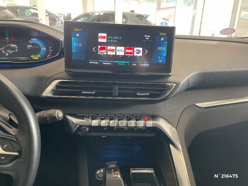 Barres de toit longitudinales profilée en Aluminium / Contrôle dynamique de stabilité CDS avec antipatinage électronique ASR / Indicateur de rapport conseillé / Poches/filets aumonières au dos des sièges AV / Appuis-tête à sécurité optimisée réglables en hauteur sur les sièges conducteur et passager AV ainsi que sur les places latérales AR / Ceintures de sécurité AV 3 points à enrouleur, réglables en hauteur avec prétensionneurs et limiteurs d'effort / Reconnaissance étendue des panneaux (Stop, Sens interdit) et préconisation des panneaux de vitesse / Sièges AV mécaniques à réglage manuel en hauteur / Siège passager AV mécanique avec mise en tablette / Direction assistée électrique, colonne de direction réglable en hauteur et profondeur (mécanique) / Vitres AV feuilletées acoustiques / Aide graphique et sonore au stationnement AR / Eclairage intérieur à LED / Boîte à gants floquée et éclairée / Calandre à¡ damiers chromés / Bandeau de pare-chocs AR chromé / Passages de roues rapportés noirs / Accoudoir central AV à ouverture papillon, avec compartiment de rangement éclairé et réfrigérable / Accès et démarrage mains libres / Sélecteur de modes (Electric, Hybrid, Sport) / Vitres latérales AR et lunette AR surteintées / Commande de verrouillage à distance (2 plips) / Projecteurs "Peugeot LED Technology" avec feux diurnes à LED sous projecteurs / Teinte métallisée Bleu Celebes / Ceintures de sécurité 3 points à enrouleur (x3) au 2ème rang, avec prétensionneurs et limiteurs d'effort aux places latérales / Pack City 1 / Mirror Screen (compatible Mirrorlink, Apple CarPlay, Android Auto) / Chargeur embarqué 3,7kW : câble de recharge T2 avec prise murale / AVAS (système d'alerte sonore du véhicule émis à faible allure en roulage électrique, audible depuis l'extérieur pour la sécurité des piétons) / Garnissage TEP avec Tissu Colyn Mistral / Essuie-vitre AV avec système de lavage "Magic Wash" / Système d'antiblocage des roues ABS avec répartiteur électronique de freinage REF et assistance au freinage d'urgence AFU / Plafonniers AV et AR avec spot de lecture / Airbags frontaux conducteur et passager adaptatifs (passager neutralisable par clé), airbags latéraux conducteur et passager AV, airbags rideaux de tête aux places AV et AR / Jantes alliage 18" "Detroit" bi-ton diamantées Gris Storm / Lève-vitres AV et AR électriques séquentiels avec antipincement / Drive Mode : Choix de 2 modes de conduite (Eco ou Sport) / Peugeot Connect: Ecran tactile capacitif 10'' HD,navigation 3D connectée avec reconnaissance vocale aux services de Navigation connectée TomTom, SOS & Assistance, Teleservices / "Toggle Switches" chromés (touches "piano" d'activation des fonctions de l'écran tactile) / Décors intérieurs (baguettes de planche de bord et panneaux de portes, enjoliveur de console) chromés / Peugeot i-Cockpit avec combiné tête haute numérique reconfigurable, écran tactile capacitif 10" et volant compact multi-fonctions / Air conditionné automatique bi-zone avec aérateurs aux places AR / Radio avec fonction DAB,bi-tuner compatible MP3 et connectivité Bluetooth (audio streaming, kit mains libres), avec commandes au volant, 6 HP, écran tactile capacitif 10" HD / Décors de planche de bord et panneaux de portes en maille "Brumeo" / Pack Eclairage d'ambiance / Coques de rétroviseurs couleur carrosserie / Frein de stationnement électrique avec aide au démarrage en pente / Avertisseur de temps de conduite / Pack Safety Plus / Enjoliveur d'arc de pavillon en inox / Enjoliveur en inox sur les protecteurs de bas de portes / Inserts d'ailes AV chromés / Siège conducteur à réglage lombaire manuel / Sabots de pare-chocs AV gris métallisé / Contrôle de la charge de la batterie à distance / Pré-chauffage / climatisation du véhicule à distance / Détection de sous-gonflage indirecte / Banquette rabattable 1/3 - 2/3 (commandes dans le coffre) avec accoudoir et trappe à skis / Plancher de coffre fixe avec articulation pour accès au coffre de rangement du câble de recharge / Badge "HYBRID" sur ailes AV et volet de coffre / Trappe de recharge électrique sur l'aile AR gauche, avec indicateur lumineux d'état de recharge / Prise USB (dans la zone connectique) / Prise 12V (x3 : zone connectique, AR de console et coffre) / Kit de dépannage de pneumatique : compresseur 12 volts, flacon de produit de colmatage, anneau de remorquage, deux cales de roue, manivelle de frein de stationnement électrique / Sécurité enfants électrique des vitres AR / Rétroviseur intérieur photosensible frameless (sans cadre) avec témoin lumineux d'information roulage mode ELECTRIC / Essuie-vitre AR avec enclenchement automatique en marche AR / Lunette AR chauffante avec antennes sérigraphiées / Pack Visibilité