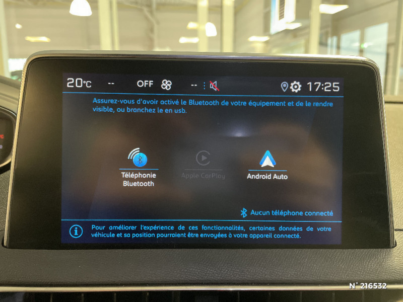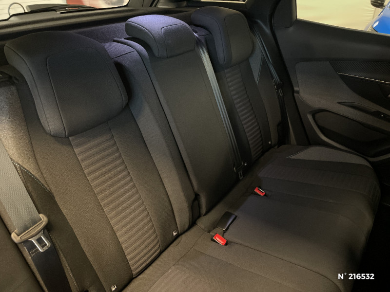 Projecteurs "Peugeot LED Technology" avec feux diurnes à LED sous projecteurs / Drive Mode : Choix de 2 modes de conduite (Eco ou Sport) / Pack Visibilité / Accoudoir central AV à ouverture papillon, avec compartiment de rangement éclairé et réfrigérable / Kit de dépannage de pneumatique : compresseur 12 volts, flacon de produit de colmatage, anneau de remorquage, deux cales de roue, manivelle de frein de stationnement électrique / Direction assistée électrique, colonne de direction réglable en hauteur et profondeur (mécanique) / Lève-vitres AV et AR électriques séquentiels avec antipincement / Frein de stationnement électrique avec aide au démarrage en pente et serrage automatique / Volant croûte de cuir Mistral / Rétroviseur intérieur photosensible / Fonction "Mirror Screen" (Apple CarPlay / Android Auto ) / Pack Safety / Indicateur de rapport conseillé / Sécurité enfants électrique des vitres AR / Plancher de coffre 2 positions / Décors de planche de bord et panneaux de portes aspect carbone / Prise 12V (x3 : zone connectique, AR de console et coffre) / Plafonniers AV/AR à LED avec 2 spots de lecture / Rétroviseurs extérieurs dégivrants avec réglage et rabattement électriques / Détection de sous-gonflage indirecte / Avertisseur de temps de conduite / 6 airbags (Frontaux adaptatifs, latéraux AV, rideaux AV et AR) / Appuis-tête à sécurité optimisée réglables en hauteur (conducteur, passager et arrière x3) / Enjoliveur d'arc de pavillon en Inox Brillant / Enjoliveurs d'ailes AV chromés / Jantes alliage 17" CHICAGO Gris Eclat brillant avec pneumatiques 215/65 R17 103 V / Pares-soleil avec miroirs de courtoisie éclairés / Passages de roues rapportés Noir Mat / Peugeot i-Cockpit avec combiné tête haute numérique, volant compact multi-fonctions / Radio sur écran tactile capacitif 8'' Radio Numérique Terrestre, bi-tuner compatible MP3 et connectivité Bluetooth (Audio streaming, kit mains libres), USB, 6 HP / Sabot de pare-chocs AV peint Métallure / Pack City / Garnissage Tissu Tri matière PNEUMA 3D, surpiqûre Bleu Azur / Coques de rétroviseurs extérieurs Noir Perla Nera / "Toggle Switches" chromés (touches 'piano' d'activation des fonctions de l'écran tactile) / Air conditionné automatique bi-zone avec aérateurs aux places AR / Habitacle et ciel de pavillon Noir Mistral / Calandre à¡ damiers chromés / Essuie-vitre AV avec système de lavage "Magic Wash" / Poches/filets aumonières au dos des sièges AV