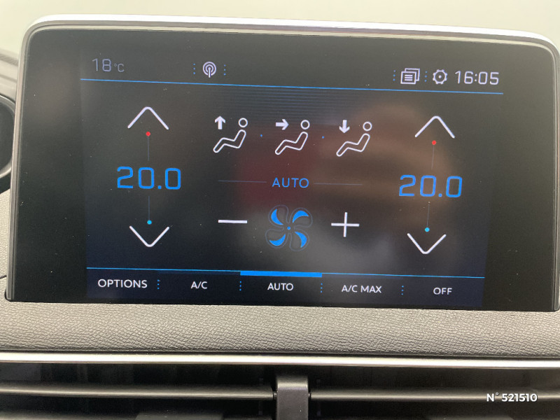 Siège passager AV mécanique réglable en hauteur / Spots de lecture (2x) AR / ABS, AFU, REF / Peinture opaque / Kit de dépannage de pneumatique / Fonction "Mirror Screen" / Accès et démarrage mains libres / Radio 6 HP, bi-tuner compatible MP3 et connectivité Bluetooth (audio streaming, kit mains libres), avec commandes au volant, écran tactile capacitif 8" / Pack Visibilité / Lève-vitres AV et AR électriques séquentiels avec antipincement / Poignées de portes couleur carrosserie / Détection de sous-gonflage indirecte / Poignées de maintien (x4) rétractables avec frein (crochets pour cintres aux places AR) / Banquette AR rabattable 1/3 - 2/3 (avec modularité "Magic Flat" et commandes dans le coffre) avec accoudoir et trappe à skis / Prise USB (dans la zone connectique) / Air conditionné automatique bi-zone avec aérateurs aux places AR / Commande de verrouillage à distance (2 plips) / Surtapis AV et AR / Aide sonore et graphique au stationnement AR / Vitres latérales AR et lunette AR surteintées / Pédalier et repose-pied conducteur aluminium / Avertisseur de temps de conduite / Plafonnier AV avec spots de lecture (x2) et plafonnier AR à extinction temporisée / Poches/filets aumonières au dos des sièges AV / Contrôle dynamique de stabilité CDS avec antipatinage électronique ASR / Jonc de vitres en inox / Ceintures de sécurité AR 3 points à enrouleur (x3) avec prétensionneurs et limiteurs d'effort aux places latérales / Volant Cuir pleine fleur perforé avec bagues chromées et badge GT Line / Peugeot Connect / Toit "Black Diamond" (toit Noir Perla Nera) / PEUGEOT i-Cockpit Amplify / Lunette AR chauffante avec antennes sérigraphiées / Enjoliveur d'arc de pavillon en inox / Seuils de portes AV en Inox / Projecteurs "Peugeot Full Led Technology" / Pack City 1 / Fixations pour 3 sièges enfants suivant norme ISOFIX aux places passager AV et latérales AR / Prise 12V (x3 : zone connectique, AR de console et coffre) / Jantes alliage 18" "Detroit" bi-ton diamantées / Enjoliveur en inox sur les protecteurs de bas de portes / Indicateur de rapport conseillé / Appuis-tête à sécurité optimisée réglables en hauteur sur les sièges conducteur et passager AV ainsi que sur les places latérales AR / Accoudoir central AV à ouverture papillon, avec compartiment de rangement éclairé et réfrigérable / Boîte à gants floquée et éclairée / Console centrale AV avec 2 porte-gobelets / Direction assistée électrique, colonne de direction réglable en hauteur et profondeur (mécanique) / Plancher de coffre 2 positions / Inserts d'ailes AV chromés / Frein de stationnement électrique avec aide au démarrage en pente / Ceintures de sécurité AV 3 points à enrouleur, réglables en hauteur avec prétensionneurs et limiteurs d'effort / Sellerie TEP & Tissu "Imila" / Bouclier AV exclusif et calandre à damier chromé / Canules d'echappement de style chromées / Habitacle et ciel de pavillon Noir Mistral / Sécurité enfants électrique des vitres AR / Pack Safety Plus / Décors intérieurs chromés / Ecran tactile capacitif 8" et "Toggles Switches" / Bandeau de pare-chocs AR chromé / Calandre avec jonc périphérique chrome brillant et satiné, damier chromé et lettrage Peugeot noir / Passages de roues rapportés noirs / Sabots de pare-chocs AV gris métallisé / Décors de planche de bord et panneaux de portes en maille "Brumeo" / Pack Eclairage d'ambiance / Essuie-vitre AV avec système de lavage "Magic Wash" / Essuie-vitre AR avec enclenchement automatique en marche AR / Boitiers de rétroviseurs extérieurs Noir Perla Nera / Eclairage intérieur LED: plafonnier tactile 3 spots + 2 LEDs d'ambiance, 2 liseuses AR, pare-soleil, boîte à gants, accoudoir central, zone connectique, caves à pied, zone coffre (x2) / Airbags frontaux conducteur et passager adaptatifs (passager neutralisable par clé), airbags latéraux conducteur et passager AV, airbags rideaux de tête aux places AV et AR / Siège passager AV mécanique avec mise en tablette