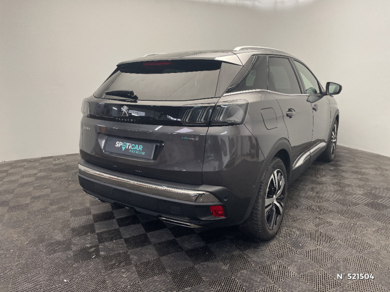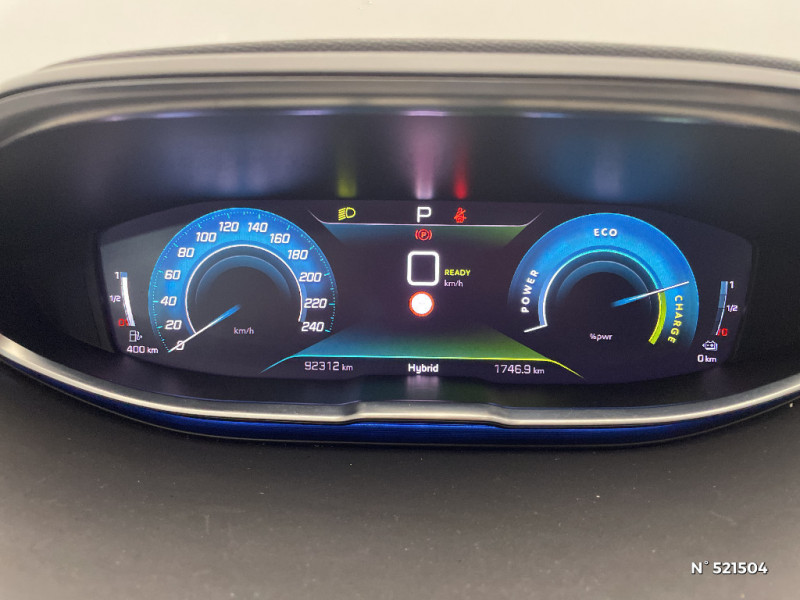 Trappe de recharge électrique avec indicateur d'état de charge / Vitres latérales AR et lunette AR chauffante surteintées / Vitres latérales AV feuilletées acoustiques / Volant cuir fleur perforé Mistral avec bagues chromées et badge GT / Avertisseur sonore audible depuis l'extérieur pour la sécurité piétons / Protecteurs de bas de portes avec inserts Inox Brillant / Toit "Black Diamond" / Banquette AR rabattable 1/3 - 2/3 avec accoudoir central, trappe à skis et commandes de rabattement depuis le coffre / Calandre avec design évolutif chromé / Enjoliveur d'arc de pavillon en Inox Brillant / Enjoliveurs d'ailes AV chromés / Jantes alliage 18" diamantées DETROIT bi-ton Noir Onyx brillant avec pneumatiques 225/55 R18 102 V / Lécheurs de vitres, joncs de vitres latérales en Inox Brillant / Accès et démarrage mains libres / Projecteurs "Peugeot Full LED Technology" avec correction automatique de site, fonction Eclairage Virage Statique,"Foggy Mode" et feux diurnes à LED sous projecteurs / Pares-soleil avec miroirs de courtoisie éclairés / Passages de roues rapportés Noir Mat / Peugeot i-Cockpit avec combiné tête haute numérique, volant compact multi-fonctions / Rétroviseurs extérieurs dégivrants avec réglage et rabattement électriques, éclairage d'accueil à LED, témoin de surveillance d'angles morts / Sabot de pare-chocs AV peint Métallure / Siège conducteur avec réglage lombaire / Décors de planche de bord et panneaux de portes Alcantara Gris Greval / Pack Visibilité / 6 airbags (Frontaux adaptatifs, latéraux AV, rideaux AV et AR) / Appuis-tête à sécurité optimisée réglables en hauteur (conducteur, passager et arrière x3) / Siège passager AV avec mise en tablette / Frein de stationnement électrique avec aide au démarrage en pente et serrage automatique / PEUGEOT Connect SOS & Assistance et Teleservices / Seuils de portes AV en Inox / Navigation 3D connectée avec écran tactile capacitif 10" HD Avec reconnaissance vocale, cartographie Europe, services de Navigation connectée TomTom 3 ans inclus, connexion automatique et permanente via carte SIM intégrée au véhicule / Prises USB de charge (x2) au 2 rang / Barres de toit longitudinales en aluminium / Pédalier et repose-pied conducteur en aluminium / Coques de rétroviseurs extérieurs Noir Perla Nera / Feux AR à LED avec effet 3D, clignotants à défilement / Chargeur embarqué 3,7 kW / Lève-vitres AV et AR électriques séquentiels avec antipincement / Accoudoir central AV à ouverture papillon, avec compartiment de rangement éclairé et réfrigérable / Câble de recharge T2 mode 2 (10 A / 2,3 kW) / Garnissage Tissu BELOMKA / TEP / Driver Sport Pack / Pack City 1 / Avertisseur de temps de conduite / Pack Drive Assist Plus / Pack Safety Plus / Commandes de lève-vitres avec inserts chromés / Prise 12V (x3 : zone connectique, AR de console et coffre) / Détection de sous-gonflage indirecte / Pack Eclairage d'ambiance / Kit de dépannage de pneumatique : compresseur 12 volts, flacon de produit de colmatage, anneau de remorquage, deux cales de roue, manivelle de frein de stationnement électrique / Direction assistée électrique, colonne de direction réglable en hauteur et profondeur (mécanique) / Essuie-vitre AV avec système de lavage "Magic Wash" / "Toggle Switches" chromés (touches 'piano' d'activation des fonctions de l'écran tactile) / Contrôle de la charge de la batterie à distance / Pré-chauffage / climatisation du véhicule à distance / Plancher de coffre fixe avec articulation pour accès au coffre de rangement du câble de recharge / Badge "HYBRID" sur ailes AV et volet de coffre / Rétroviseur intérieur photosensible sans cadre / Sélecteur de modes (Electric, Hybrid, Sport) / Fonction "Mirror Screen" (Apple CarPlay / Android Auto ) / Plafonniers AV/AR à LED avec 2 spots de lecture / Canules d'echappement de style chromées / Habitacle et ciel de pavillon Noir Mistral / Indicateur de rapport conseillé / Sécurité enfants électrique des vitres AR / Surtapis AV et AR / Air conditionné automatique bi-zone avec aérateurs aux places AR / Poches/filets aumonières au dos des sièges AV