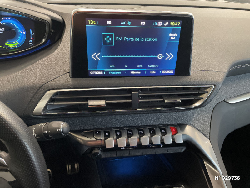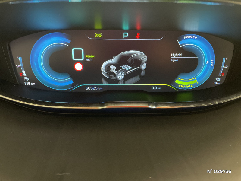 Pack City 1 / Aide graphique et sonore au stationnement AV / Peugeot Connect / Poignées de maintien (x4) rétractables avec frein (crochets pour cintres aux places AR) / Prise USB (dans la zone connectique) / Prise 12V (x3 : zone connectique, AR de console et coffre) / Fixations pour 3 sièges enfants suivant norme ISOFIX aux places passager AV et latérales AR / Aide sonore et graphique au stationnement AR / Vitres AV feuilletées acoustiques / Air conditionné automatique bi-zone avec aérateurs aux places AR / Commande de verrouillage à distance (2 plips) / Prises 12 V (x 3 : zone connectique, AR de console et coffre) / Fonction DAB (Radio Numérique Terrestre) / Mirror Screen / Airbags frontaux conducteur et passager adaptatifs (passager neutralisable par clé), airbags latéraux conducteur et passager AV, airbags rideaux de tête aux places AV et AR / Sécurité enfants électrique des vitres AR / Bandeaux de pare-chocs AR chromé / Passages de roues rapportés noirs / Décors intérieurs chromés / Kit de dépannage de pneumatique : compresseur 12 volts, flacon de produit de colmatage, anneau de remorquage, deux cales de roue, manivelle de frein de stationnement électrique / Projecteurs halogènes à l'AV avec feux diurnes à LED / Système d'antiblocage des roues ABS avec répartiteur électronique de freinage REF et assistance au freinage d'urgence AFU / Siège passager AV mécanique réglable en hauteur / Siège passager AV mécanique avec mise en tablette / Spots de lecture (2x) AR / Boitiers de rétroviseurs extérieurs dans la couleur de la carrosserie / Fonction "Mirror Screen" / Radio 6 HP, bi-tuner compatible MP3 et connectivité Bluetooth (audio streaming, kit mains libres), avec commandes au volant, écran tactile capacitif 8" / Eclairage intérieur à LED: plafonniers / Pack Visibilité / Poignées de portes couleur carrosserie / Réglage lombaire du siège conducteur / ABS, AFU, REF / Lève-vitres électriques AV et AR séquentiels avec antipincement / Kit de dépannage de pneumatique / Frein de stationnement électrique avec aide au démarrage en pente / Vitres latérales AR et lunette AR surteintées / Accoudoir central AV à ouverture papillon, avec compartiment de rangement éclairé et réfrigérable / Boîte à gants floquée et éclairée / Console centrale AV avec 2 porte-gobelets / Direction assistée électrique, colonne de direction réglable en hauteur et profondeur (mécanique) / Essuie-vitre AV avec système de lavage "Magic Walsh" / Essuie-vitre AR avec enclenchement automatique en marche AR / Lunette AR chauffante avec antennes sérigraphiées / Plafonnier AV avec spots de lecture (x2) et plafonnier AR à extinction temporisée / Poches/filets aumonières au dos des sièges AV / "Toggle Switches" chromés (touches "piano" d'activation des fonctions de l'écran tactile) / Décors de planche de bord et panneaux de portes aspect Carbone / Chargeur embarqué 3,7kW : câble de recharge T2 avec prise murale / AVAS (système d'alerte sonore du véhicule émis à faible allure en roulage électrique, audible depuis l'extérieur pour la sécurité des piétons) / Rétroviseur intérieur photosensible frameless (sans cadre) avec témoin lumineux d'information roulage mode ELECTRIC / Contrôle de la charge de la batterie à distance / Pré-chauffage / climatisation du véhicule à distance / Banquette rabattable 1/3 - 2/3 (commandes dans le coffre) avec accoudoir et trappe à skis / Plancher de coffre fixe avec articulation pour accès au coffre de rangement du câble de recharge / Rétroviseur intérieur photosensible sans cadre, avec témoin lumineux de roulage en mode Electric / Badge "HYBRID" sur ailes AV et volet de coffre / Eclairage LED au plafonnier / Trappe de recharge électrique sur l'aile AR gauche, avec indicateur lumineux d'état de recharge / Sélecteur de modes (Electric, Hybrid, Sport) / Sellerie TEP & Tissu "Piedimonte" ou "Evron" / Avertisseur de temps de conduite / Calandre avec jonc périphérique et facettes chromés / Enjoliveur d'arc de pavillon en inox / Nouveau PEUGEOT i-Cockpit avec dalle numérique tête haute / Radio avec écran LCD, 6HP, MP3, Bluetooth, kit mains libres, une prise USB / Inserts d'ailes AV chromés / Ecran tactile capacitif 8" et "Toggles Switches" / Pack Safety Plus / Jantes alliage 18" "Detroit" bi-ton diamantées / Enjoliveur en inox sur les protecteurs de bas de portes / Sabots de pare-chocs AV gris métallisé / Décors de planche de bord et panneaux de portes en maille "Brumeo" / Pack Eclairage d'ambiance / Mise en tablette du siège passager / Peinture opaque Gris Hurricane / Sellerie TEP & Tissu "Piedimonte" / Appuis-tête à sécurité optimisée réglables en hauteur sur les sièges conducteur et passager AV ainsi que sur les places AR / Ceintures de sécurité AV 3 points à enrouleur, réglables en hauteur avec prétensionneurs et limiteurs d'effort / Ceintures de sécurité AR 3 points à enrouleur (x3) avec prétensionneurs et limiteurs d'effort aux places latérales / Contrôle dynamique de stabilité CDS avec antipatinage électronique ASR / Indicateur de rapport conseillé / Accès et démarrage mains libres / Coques de rétroviseurs extérieurs et poignées de portes couleur carrosserie / Volant Cuir pleine fleur / Détection de sous-gonflage indirecte