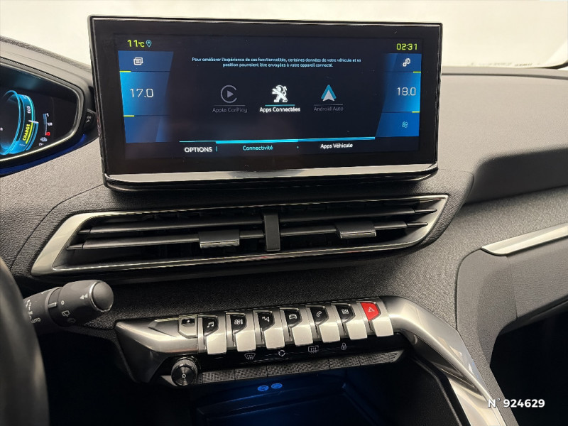 Indicateur de rapport conseillé / "Toggle Switches" chromés (touches "piano" d'activation des fonctions de l'écran tactile) / Sécurité enfants électrique des vitres AR / Eclairage intérieur à LED / Prise USB (dans la zone connectique) / Sièges AV mécaniques à réglage manuel en hauteur / Vitres latérales AR et lunette AR surteintées / Inserts d'ailes AV chromés / Garnissage TEP avec Tissu Colyn Mistral / Contrôle de la charge de la batterie à distance / Rétroviseur intérieur photosensible frameless (sans cadre) avec témoin lumineux d'information roulage mode ELECTRIC / Pack City 1 / Plafonniers AV et AR avec spot de lecture / Reconnaissance étendue des panneaux (Stop, Sens interdit) et préconisation des panneaux de vitesse / Radio avec fonction DAB,bi-tuner compatible MP3 et connectivité Bluetooth (audio streaming, kit mains libres), avec commandes au volant, 6 HP, écran tactile capacitif 10" HD / Teinte métallisée Bleu Celebes / Lunette AR chauffante avec antennes sérigraphiées / Poches/filets aumonières au dos des sièges AV / Décors de planche de bord et panneaux de portes en maille "Brumeo" / Pack Eclairage d'ambiance / Siège conducteur à réglage lombaire manuel / Frein de stationnement électrique avec aide au démarrage en pente / Barres de toit longitudinales profilée en Aluminium / Enjoliveur d'arc de pavillon en inox / Direction assistée électrique, colonne de direction réglable en hauteur et profondeur (mécanique) / Avertisseur de temps de conduite / Boîte à gants floquée et éclairée / Enjoliveur en inox sur les protecteurs de bas de portes / Sabots de pare-chocs AV gris métallisé / Calandre á damiers chromés / Peugeot Connect: Ecran tactile capacitif 10'' HD,navigation 3D connectée avec reconnaissance vocale aux services de Navigation connectée TomTom, SOS & Assistance, Teleservices / Essuie-vitre AV avec système de lavage "Magic Wash" / Ceintures de sécurité AV 3 points à enrouleur, réglables en hauteur avec prétensionneurs et limiteurs d'effort / Bandeau de pare-chocs AR chromé / Essuie-vitre AR avec enclenchement automatique en marche AR / Détection de sous-gonflage indirecte / Accoudoir central AV à ouverture papillon, avec compartiment de rangement éclairé et réfrigérable / Pack Safety Plus / Peugeot i-Cockpit avec combiné tête haute numérique reconfigurable, écran tactile capacitif 10" et volant compact multi-fonctions / Passages de roues rapportés noirs / Accès et démarrage mains libres / Prise 12V (x3 : zone connectique, AR de console et coffre) / Appuis-tête à sécurité optimisée réglables en hauteur sur les sièges conducteur et passager AV ainsi que sur les places latérales AR / Décors intérieurs (baguettes de planche de bord et panneaux de portes, enjoliveur de console) chromés / Plancher de coffre fixe avec articulation pour accès au coffre de rangement du câble de recharge / Air conditionné automatique bi-zone avec aérateurs aux places AR / Sélecteur de modes (Electric, Hybrid, Sport) / Jantes alliage 18" "Detroit" bi-ton diamantées Gris Storm / Siège passager AV mécanique avec mise en tablette / Lève-vitres AV et AR électriques séquentiels avec antipincement / Badge "HYBRID" sur ailes AV et volet de coffre / Trappe de recharge électrique sur l'aile AR gauche, avec indicateur lumineux d'état de recharge / Drive Mode : Choix de 2 modes de conduite (Eco ou Sport) / Pré-chauffage / climatisation du véhicule à distance / Banquette rabattable 1/3 - 2/3 (commandes dans le coffre) avec accoudoir et trappe à skis / Projecteurs "Peugeot LED Technology" avec feux diurnes à LED sous projecteurs / Aide graphique et sonore au stationnement AR / Ceintures de sécurité 3 points à enrouleur (x3) au 2ème rang, avec prétensionneurs et limiteurs d'effort aux places latérales / Commande de verrouillage à distance (2 plips) / Airbags frontaux conducteur et passager adaptatifs (passager neutralisable par clé), airbags latéraux conducteur et passager AV, airbags rideaux de tête aux places AV et AR / Mirror Screen (compatible Mirrorlink, Apple CarPlay, Android Auto) / Kit de dépannage de pneumatique : compresseur 12 volts, flacon de produit de colmatage, anneau de remorquage, deux cales de roue, manivelle de frein de stationnement électrique / Sellerie TEP & Tissu 'Colyn' / Coques de rétroviseurs couleur carrosserie / Système d'antiblocage des roues ABS avec répartiteur électronique de freinage REF et assistance au freinage d?urgence AFU / Chargeur embarqué 3,7kW : câble de recharge T2 avec prise murale / AVAS (système d'alerte sonore du véhicule émis à faible allure en roulage électrique, audible depuis l'extérieur pour la sécurité des piétons) / Pack Visibilité / Contrôle dynamique de stabilité CDS avec antipatinage électronique ASR