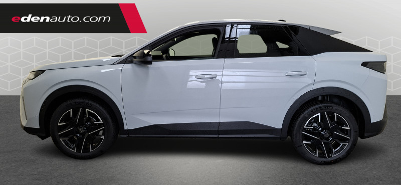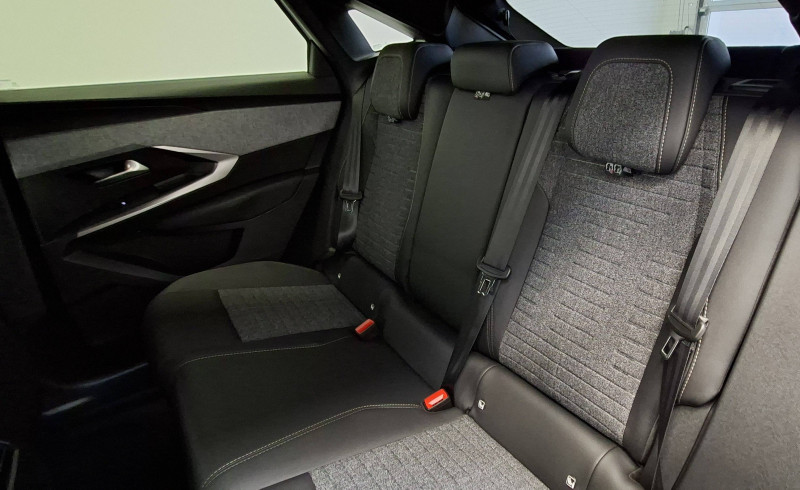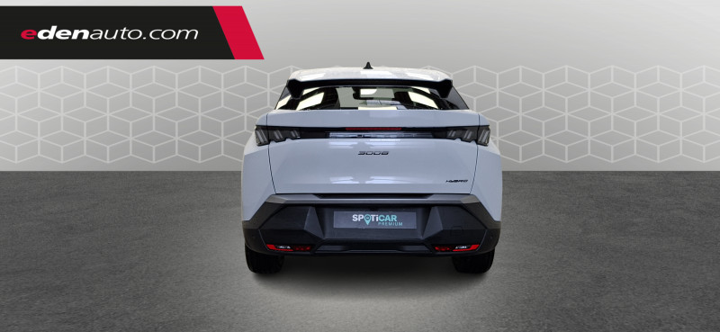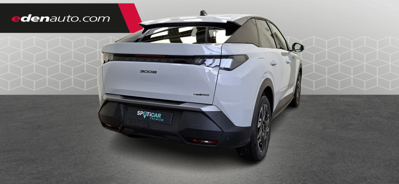 3 prises 12 V (Console centrale, rang 2, coffre) / 4 poignées de maintien rétractables (2 à l'AV et 2 à l'AR) / 6 airbags: frontaux conducteur et passager auto-adaptatifs (passager neutralisable par clé), latéraux conducteur et passager AV (thorax et bassin), rideaux aux places AV et AR (tête et thorax) / 6 HP (2 tweeters et 2 woofers à l'AV et 2 larges bandes à l'AR) / Accès et démarrage mains libres Proximity / Banquette AR avec dossier rabattable 40/20/40 / Boîte de vitesse automatique, séquentielle (6 rapports) / Détection de sous-gonflage indirecte / Eclairage intérieur Plafonnier AV et liseuses AR à LED, Boite à gants et rangement de console éclairés à LED, Eclairage des caves à pieds AV à LED / Eléments de style éxterieur Bandeau entre les projecteurs Noir laqué avec logo 3008. Calandre couleur caisse, écopes latérales Noir laqué, décor inférieur Gris Meteor, jupe inférieure Noir grainé. Vitres AR, vitres de custode et lunette AR surteintées. Lécheurs de vitres masqués. Enjoliveurs de passages de roues et protections inférieures de portes Noir grainé. Bandeau entre les feux AR Noir laqué avec lettrage PEUGEOT. Pare chocs AR avec décor Gris Meteor et jupe inférieure Noir grainé, Monogrammes AV et AR / Eléments de style intérieure Planche de bord moussée avec décor tissu RIMINI chiné et alcôve Graphène, façade et aérateurs Noir laqué avec décor Gris Stène, Panneaux de portes avec décor tissu RIMINI chiné, alcôve Graphène et jonc Gris Stène, accoudoirs TEP Isabella, surpiqûres Quartz à l'AV, Console centrale avec décor tissu RIMINI chiné, façade Noir laqué et jonc Gris Stène, accoudoir tissu RIMINI chiné / Essuie-vitre AV à déclenchement automatique / Frein de stationnement électrique / Habitacle et ciel de pavillon Noir / Jantes alliage 19" diamantées Lulea Noir Orbital, vernis brillant / Lève-vitres AV/AR électriques et séquentiels avec antipincement / Monogrammes AR 3008 et Hybrid / Monogrammes AV: blason PEUGEOT et 3008 / Pack Safety Plus Régulateur / Limiteur de vitesse, Freinage d'urgence automatique avec alerte risque de collision et protection des usagers de la route vulnérables (piétons, cyclistes,... ) Alerte active de franchissement involontaire de ligne et bas côté, Reconnaissance étendue des panneaux de signalisation et préconisation de vitesse, Alerte attention conducteur / Pare-brise feuilleté acoustique / PEUGEOT i-Cockpit panoramique avec Double écran HD flottant (2 x 10'') / PEUGEOT i-Connect - Connect One: Fonctionnalités principales à bord (Mises à jour Over The Air, Géolocalisation), Services de sécurité (Appel d'urgence, Peugeot Assistance), Services d'entretien (Télémaintenance, guide d'utilisation digital), e-ROUTES par Free2move charge Services à distance (E Remote Control) (Abonnement 10 ans inclus) / PEUGEOT i-Connect - Connect Plus: Services de sécurité: alarme connectée, Services à distance (E-Remote Control, Remote Control, Find My Car, My Trip Report, Peugeot Skill for Alexa), (Abonnement 6 mois inclus, renouvellement 8 ? / mois) / PEUGEOT i-Connect Radio DAB, Bluetooth (connexion 2 téléphones), Mirror Screen sans fil (Apple CarPlay / Android Auto), Peugeot Connect SOS & Assistance, 1 prise USB C (Data & charge) / Plancher de coffre modulable 2 positions / Projecteurs "Peugeot Led Technology" / Rétroviseur intérieur électrochrome / Rétroviseurs extérieurs dégivrants avec réglage et rabattement électriques, éclairage de seuil / Sellerie tissu CRISPY embossé, accompagnement TEP Isabella, écharpe tissu RIMINI chiné, surpiqûres Quartz / Sièges AV à réglage en hauteur manuel / Visiopark 1 Caméra de recul et aide au stationnement AR, graphique et sonore / Volant compact croûte de cuir avec commandes intégrées Noir laqué, décors Gris Stène