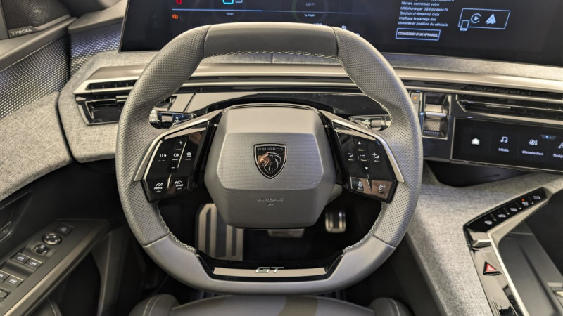 Frein de stationnement électrique / Détection de sous-gonflage indirecte / Commutation automatique des feux de route / Essuie-vitre AV à déclenchement automatique / 6 HP (2 tweeters et 2 woofers à l'AV et 2 larges bandes à l'AR) / Hayon motorisé avec accès mains libres / Pédalier et repose pied aluminium / Plancher de coffre modulable 2 positions / 4 poignées de maintien rétractables (2 à l'AV et 2 à l'AR) / Volant chauffant / PEUGEOT i-Toggles virtuels avec 10 raccourcis personnalisables / PEUGEOT i-Connect Advanced Navigation 3D connectée, 4 prises USB: 1 prise USB C (Data & charge) et 1 prise USB C (Charge) à l'AV, 2 prises USB C (Charge) à l'AR / Jantes alliage 19" diamantées Lulea Noir Orbital, vernis brillant / 6 airbags: frontaux conducteur et passager auto-adaptatifs (passager neutralisable par clé), latéraux conducteur et passager AV (thorax et bassin), rideaux aux places AV et AR (tête et thorax) / Accès et démarrage mains libres Proximity / Banquette AR avec dossier rabattable 40/20/40 / Projecteurs PEUGEOT PIXEL LED Eclairage adaptatif, commutation automatique des feux de route, feux de route avec fonctions anti éblouissement et boost / Toit et becquet AR Black Diamond / Eclairage d'ambiance indirect, jour & nuit sur la planche de bord, les panneaux de portes AV et sous l'écran panoramique 21'', associé aux modes de conduite, personnalisable en 8 couleurs / Volant compact, cuir fleur lisse et perforé avec commandes intégrées Noir Laqué, décors Cast Iron, surpiqûres Iced Clay, insert Noir laqué avec badge GT / Commutation adaptative des projecteurs / PEUGEOT i-Cockpit panoramique avec écran incurvé et flottant 21'' HD / Sièges AV à réglage en hauteur manuel / Sellerie tissu NEW UZIRIS embossé, accompagnement TEP Isabella, écharpe tissu RIMINI chiné, surpiqûres Iced Clay / 2 prises 12 V (Console centrale, coffre) / Boîte de vitesse automatique, séquentielle (6 rapports) / Eclairage intérieur Miroirs de courtoisie conducteur et passager occultables éclairés à LED / Pack Safety Plus : Alerte attention conducteur Reconnaissance étendue des panneaux de signalisation et préconisation de vitesse Alerte active de franchissement involontaire de ligne et bas côté Freinage d'urgence automatique avec alerte risque de collision pilotée par caméra et radar / Pare-brise feuilleté acoustique / Lève-vitres AV/AR électriques et séquentiels avec antipincement / Siège conducteur à réglage lombaire manuel / / Véhicules équivalents: C5 Aircross - Tiguan - X3
