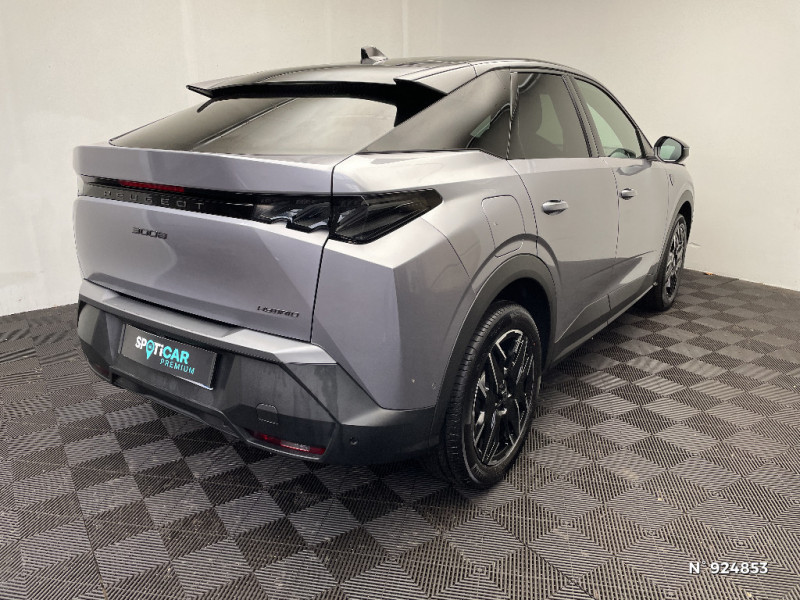 PEUGEOT i-Connect Advanced - Connect Plus: Reconnaissance vocale connectée en langage naturel, ChatGPT (Disponibilité ultérieurement) Services de sécurité: alarme connectée (Si véhicule équipé de l?alarme,) Services à distance (E Remote Control, Remote Control, Find My Car, My Trip Report, Peugeot Skill for Alexa), Fonctions de Navigation (Trafic en temps réel, prévisions météorologiques,parking, recherche TomTom, limitations de vitesse, prix du carburant, mise à jour cartographie Over The Air, Send to Nav, Geofenci / 3 prises 12V 3 prises 12 V (Console centrale, AR de la console centrale, coffre) / Eléments de style éxterieur Bandeau entre les projecteurs Noir laqué avec logo '3008'. Calandre couleur caisse, écopes latérales Noir laqué, décor inférieur Gris Meteor, jupe inférieure Noir grainé. Vitres AR, vitres de custode et lunette AR surteintées. Lécheurs de vitres masqués. Enjoliveurs de passages de roues et protections inférieures de portes Noir grainé. Bandeau entre les feux AR Noir laqué avec lettrage 'PEUGEOT'. Pare chocs AR avec décor Gris Meteor et jupe inférieure Noir grainé, Monogrammes AV et AR / Volant chauffant / Sellerie tissu NEW UZIRIS embossé, accompagnement TEP Isabella, écharpe tissu RIMINI chiné, surpiqûres Iced Clay / Habitacle et ciel de pavillon noir / Rétroviseurs extérieurs dégivrants avec réglage et rabattement électriques,éclairage de seuil / Sièges AV à réglage en hauteur manuel / Frein de stationnement électrique / Pack Safety Plus Régulateur / Limiteur de vitesse, Freinage d'urgence automatique avec alerte risque de collision, Alerte active de franchissement involontaire de ligne et bas côté, Reconnaissance étendue des panneaux de signalisation et préconisation de vitesse, Alerte attention conducteur / Drive Assist - Régulateur de vitesse adaptatif avec fonction Stop & Go / Siège conducteur à réglage lombaire manuel / 6 haut-parleurs (2 tweeters et 2 woofers à l'AV et 2 larges bandes à l'AR) / 2 prises 12 V (Console centrale, coffre) / Kit de dépannage de pneumatique Compresseur 12 volts, flacon de produit de colmatage, anneau de remorquage, deux cales de roue / Hayon motorisé avec accès mains libres / Détection de sous-gonflage indirecte / 4 poignées de maintien rétractables (2 à l'AV et 2 à l'AR) / Rétroviseur intérieur électrochrome sans cadre / Projecteurs PEUGEOT PIXEL LED Eclairage adaptatif, commutation automatique des feux de route, feux de route avec fonctions anti éblouissement et boost / Monogrammes ailes AV: 'blason PEUGEOT' / Toit et becquet AR Black Diamond / Pédalier et repose pied aluminium / Monogrammes AV: 'blason PEUGEOT' et '3008' / Eléments de style intérieure Planche de bord moussée avec décor tissu RIMINI chiné, décor d?alcôve en Aluminium sérigraphié, façade et aérateurs Noir laqué avec décor Cast Iron, Panneaux de portes avec décor tissu RIMINI chiné, décor d?alcôve en Aluminium sérigraphié et jonc Cast Iron, accoudoirs TEP Isabella, surpiqûres Iced Clay à l' AV, Console centrale avec décor tissu RIMINI chiné, façade Noir laqué et jonc Cast Iron, accoudoir tissu RIMINI chiné / Eclairage d'ambiance indirect, jour & nuit sur la planche de bord, les panneaux de portes AV et sous l'écran panoramique 21'', associé aux modes de conduite, personnalisable en 8 couleurs / Seuil de portes AV inox avec lettrage ?PEUGEOT? / Surtapis AV et AR avec surpiqûres Iced Clay et logo 'GT' / Volant compact, cuir fleur lisse et perforé avec commandes intégrées Noir Laqué, décors Cast Iron, surpiqûres Iced Clay, insert Noir laqué avec badge ?GT? / Commutation adaptative des projecteurs / Eclairage intérieur Miroirs de courtoisie conducteur et passager occultables éclairés à LED, Plafonnier AV et lisseuses AR i-DOME tactiles à LED / PEUGEOT i-Cockpit panoramique avec écran incurvé et flottant 21?? HD / PEUGEOT i-Toggles virtuels avec 10 raccourcis personnalisables / PEUGEOT i-Connect Advanced Navigation 3D connectée, 4 prises USB: 1 prise USB C (Data & charge) et 1 prise USB C (Charge) à l'AV, 2 prises USB C (Charge) à l'AR / Sellerie Alcantara REFLECTION embossé, accompagnement TEP Isabella, écharpe tissu RIMINI chiné, surpiqûres Iced Clay / Jantes alliage 19" diamantées BREDA Noir Orbital, vernis brillant / 6 airbags: frontaux conducteur et passager auto-adaptatifs (passager neutralisable par clé), latéraux conducteur et passager AV (thorax et bassin), rideaux aux places AV et AR (tête et thorax) / Lève-vitres AV et AR électriques séquentiels avec antipincement / Banquette AR avec dossier rabattable 40/20/40 / Plancher de coffre modulable 2 positions / Recharge smartphone sans fil (puissance 15W) / Essuie-vitre AV à déclenchement automatique / Pare-brise feuilleté acoustique / Visiopark 1 Caméra de recul & aide au stationnement AV et AR, graphique et sonore / Monogrammes AR '3008' et 'Hybrid / Accès et démarrage mains libres Proximity 2 Télécommandes 3 boutons (verrouillage, coffre, déverrouillage) / Vitres AR, custodes et lunette AR teintées