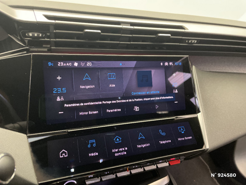 Jantes alliage 17'' Calgary diamantées / Diffuseurs d'air AR / 2 télécommandes 3 boutons / Pare-brise teinté feuilleté acoustique / Garnissage tri-matières TEP/Tissu Falgo, surpiqûres Bleu / 2 prises USB-C à l'AV / Air Quality System / 4 poignées de maintien (2 à l'AV et 2 à l'AR) / Alerte active de franchissement involontaire de ligne et bas côté / Ceintures de sécurité AV 3 points à enrouleur, avec prétensionneurs et limiteurs d'effort / Frein de stationnement électrique / Lécheurs de vitres Noir Brillant / Ceintures de sécurité AR 3 points à enrouleur (x3) avec prétensionneurs et limiteurs d'effort aux places latérales / Air Quality System (sonde de pollution, couplée à un filtre à charbon actif Haute Efficacité) / Rétroviseur intérieur photosensible / Airbags frontaux conducteur et passager adaptatifs (passager neutralisable par clé), airbags latéraux conducteur et passager AV, airbags rideaux de tête aux places AV et AR / Réglage lombaire du siège conducteur / Alerte attention conducteur / Commutation automatique des feux de route / Détection de sous gonflage / Vitres latérales AR et lunette AR surteintées / ESP avec fonction Hill Assist (Aide au démarrage en pente) / Trappe à ski (Rang 2) / Accoudoir central AV avec compartiment de rangement / Planche de bord avec jonc transversal peint et décor textile Texa / Kit de dépannage de pneumatique : compresseur 12 volts, flacon de produit de colmatage, anneau de remorquage, deux cales de roue, manivelle de frein de stationnement électrique / Feux diurnes à LED sous projecteurs nouvelle signature Peugeot / Fonction Mirror Screen (Apple CarPlay/Android Auto) sans fil / Rétroviseurs extérieurs électriques, dégivrants et rabattables électriquement avec répétiteurs de feux clignotants à LED / 2 prises USB-C à l'AR / Calandre AV Noir avec inserts chromés et écopes Noir / Rétroviseurs extérieurs avec éclairage d'approche / Essuie-vitre AV à déclenchement automatique / Jupe AR Noir Brillant avec décors chromés / Navigation connectée / Bandeau entre feux AR noir brillant / Lève-vitres électriques AV et AR et séquentiels avec anti-pincement / Peugeot i-Cockpit avec combiné d'instrumentation numérique 10'' personnalisable / Ciel de pavillon clair