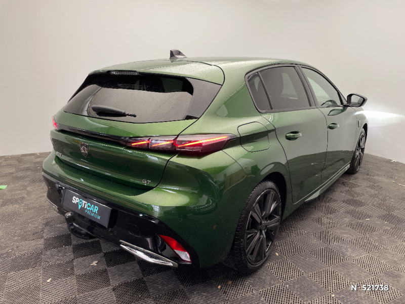 Siège conducteur AGR électrique à mémoire (longueur, inclinaison, hauteur, site, lombaire pneumatique et nez de coussin manuel). Siège passager à réglage mécanique en hauteur et lombaire pneumatique. Sièges AV chauffants, massants / Système Hi Fi Premium FOCAL 10 HP / PEUGEOT Connect SOS & Assistance / Surveillance d'angles morts longue portée (Lane Change Assit) / Alerte de trafic AR transversal (Rear Cross Traffic Alert) / Airbags frontaux conducteur et passager adaptatifs (passager neutralisable par clé), airbags latéraux conducteur et passager AV, airbags rideaux de tête aux places AV et AR / Smart Multidrive: personnalisation du combiné et éclairage d'ambiance LED intérieur associés aux modes de conduite / Projecteurs Peugeot Matrix LED / Feux AR spécifiques avec allumage dynamique griffe à griffe / 2 télécommandes 3 boutons / Sélecteur mode de conduite Eco et Sport / Lève-vitres électriques AV et AR et séquentiels avec anti-pincement / Bandeau entre feux AR noir brillant / Trappe à skis / Ceintures de sécurité AV 3 points à enrouleur, réglables en hauteur avec prétensionneurs et limiteurs d'effort / Air Quality System (sonde de pollution, couplée à un filtre à charbon actif Haute Efficacité) / Ceintures de sécurité AR 3 points à enrouleur (x3) avec prétensionneurs et limiteurs d'effort aux places latérales / Driver Sport Pack / Accès et démarrage mains libres / Pare-brise feuilleté acoustique / Kit de dépannage de pneumatique : compresseur 12 volts, flacon de produit de colmatage, anneau de remorquage, deux cales de roue, manivelle de frein de stationnement électrique / Garnissage tri-matières TEP/Alcantara Fraxx Knit / Rétroviseurs extérieurs électriques, dégivrants et rabattables électriquement avec répétiteurs de feux clignotants à LED / 2 prises USB-C à l'AV / Alerte attention conducteur / Commutation automatique des feux de route / Frein de stationnement électrique / Rear Warning / Lécheurs de vitres Noir Brillant / Seuils de porte AV aluminium / Ceintures de sécurité AV 3 points à enrouleur, avec prétensionneurs et limiteurs d'effort / Pédalier Sport aluminium et repose pied en aluminium / Détection de sous gonflage / Fixations pour 2 sièges enfants ISOFIX, aux places AR, inclus Top Tether / Vitres latérales AR et lunette AR surteintées / Rétroviseur intérieur photosensible sans cadre / 2 prises USB pour les passagers AR / ESP avec fonction Hill Assist (Aide au démarrage en pente) / Trappe à ski (Rang 2) / Accoudoir central AV avec compartiment de rangement / 4 poignées de maintien (2 à l'AV et 2 à l'AR) / Lécheurs de vitres latérales Noir Brillant / Alerte active de franchissement involontaire de ligne et bas côté / Réglage lombaire du siège conducteur / Navigation connectée avec écran central tactile 10'' et écran avec i-Toggles virtuels personnalisables. Reconnaissance vocale en langage naturel. / 2 prises USB-C à l'AR / Volant Cuir chauffant / Ciel de pavillon noir / Fonction Mirror Screen (Apple CarPlay/Android Auto) sans fil / Garnissage tri-matières TEP/Alcantara Fraxx Knit, surpiqûres Vert / Navigation connectée / Pare-brise teinté feuilleté acoustique / Essuie-vitre AV à déclenchement automatique / Surtapis AV et AR / Feux diurnes à LED sous projecteurs nouvelle signature Peugeot / Pack Safety Plus / Calandre AV spécifique Noir verni avec inserts chromés et écopes Noir Brillant / Elargisseurs de pare chocs AV et de bas de caisse latéraux / Monogrammes latéraux emblème Lion / Planche de bord avec jonc transversal chromé, décor Alu et surpiqûres Vert / Décor Alu sur panneaux de porte / Peugeot i-Cockpit 3D avec combiné d'instrumentation numérique personnalisable / Clean Cabin avec capteur de particules dans l'habitacle / Jantes alliage 18" Portland diamantées et vernies en Noir / Ecran tactile capacitif 10" et 2 prises USB AV / Jupe AR Noir Brillant avec décors chromés / Rétroviseurs extérieurs avec éclairage d'approche / Diffuseurs d'air AR / Pack Drive Assist / Pack Drive Assist + Rear warning / Pack Drive Assist Plus / VisioPark 360