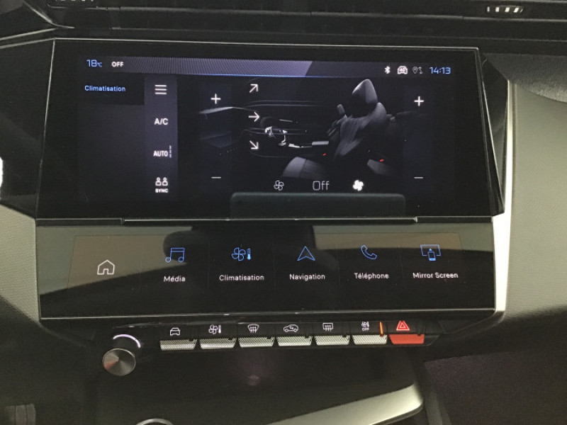 2 prises USB-C a l'AV / 2 telecommandes 3 boutons / 4 poignees de maintien / Accoudoir central AV avec compartiment de rangement / Air Quality System / Airbags frontaux conducteur et passager adaptatifs (passager neutralisable par cle), airbags / Alerte active de franchissement involontaire de ligne et bas cote / Alerte attention conducteur / Bandeau entre feux AR Noir brillant / Calandre AV Noir avec inserts chromes et ecopes Noir / Commutation automatique des feux de route / Diffuseurs d'air aux places AR / ESP avec fonction Hill Assist (Aide au demarrage en pente) / Essuie-vitre AV a declenchement automatique / Feux diurnes a LED sous projecteurs nouvelle signature Peugeot / Fonction Mirror Screen (Apple CarPlay/Android Auto) sans fil / Frein de stationnement electrique / Garnissage tri-matieres TEP/Tissu Falgo, surpiqures Bleu / Jantes alliage 17'' Calgary diamantees / Jupe AR Noir Brillant avec decors chromes / Lecheurs de vitres Noir Brillant / Leve-vitres electriques AV/ AR et sequentiels avec anti-pincement / Pack Drive Assist - Regulateur de vitesse adaptatif avec fonction Stop&Go : Regulateur de vitesse adaptatif avec fonction Stop&Go / Pack Safety Plus : Active Safety Brake pilote par camera et radar / Peugeot i-Cockpit avec combine d'instrumentation numerique 10'' personnalisable / Planche de bord avec jonc transversal peint et decor textile Texa / Reglage lombaire du siege conducteur / Retroviseur interieur photosensible / Retroviseurs exterieurs avec eclairage d'approche / Selecteur mode de conduite Eco et Sport / Systeme stop & go couple avec l'assistance au positionnement sur la voie / Vitres laterales AR et lunette AR surteintees