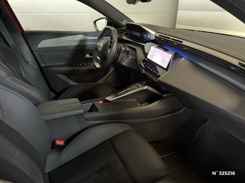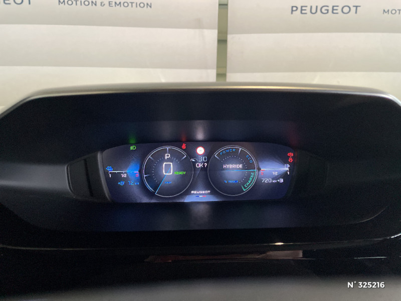 Pré-conditionnement thermique via MyPeugeot ou l'écran central / Projecteurs Peugeot Matrix LED / Puissance batterie 100kW / Réglage lombaire du siège conducteur / Rétroviseur intérieur photosensible sans cadre / Rétroviseurs extérieurs avec éclairage d'accueil à LED et témoins de surveillance d'angles morts / Rétroviseurs extérieurs avec éclairage d'approche / Rétroviseurs extérieurs électriques, dégivrants et rabattables électriquement, avec répétiteurs de feux clignotants à LED / Sélecteur de modes de conduite (Electric, Hybrid, Sport) / Seuils de porte AV aluminium / Smart Multidrive: personnalisation du combiné et éclairage d'ambiance LED intérieur associés aux modes de conduite / Surtapis AV/AR / Trappe à ski (Rang 2) / Vitres AV feuilletées accoustiques / Vitres latérales AR et lunette AR surteintées / 2 prises USB-C à l'AR / 2 prises USB-C à l'AV / 2 télécommandes 3 boutons / 4 poignées de maintien / 4 poignées de maintien (2 à l'AV et 2 à l'AR) / Pré-conditionnement thermique et charge différée via l'écran central / Pack Safety Plus / Pack Safety Plus Active Safety Brake piloté par caméra et radar / Pare-brise teinté feuilleté acoustique / Pédalier Sport aluminium et repose pied en aluminium / Pédalier Sport et repose pied en aluminium / PEUGEOT Connect SOS & Assistance / Peugeot i-Cockpit 3D avec combiné d'instrumentation numérique personnalisable / Planche de bord avec jonc transversal chromé, décor Alu et surpiqûres Vert / Planche de bord avec jonc transversal peint, décor Alu et surpiqûres Vert / Pompe à chaleur / Pack Drive Assist - Régulateur de vitesse adaptatif avec fonction Stop&Go Maintient automatiquement la vitesse du véhicule à la vitesse de référence définie par le conducteur, et ajuste automatiquement la vitesse du véhicule pour garder une distance de sécurité avec le véhicule qui précède, conformément au réglage sélectionné par le conducteur. Maintient et ajuste la vitesse jusqu'à l'arrêt. Le redémarrage du véhicule est automatique si l'arrêt a été d'une durée inférieure à 3 secondes / Air Quality System / Air Quality System (sonde de pollution, couplée à un filtre à charbon actif Haute Efficacité) / Feux AR spécifiques avec allumage dynamique griffe à griffe / Feux diurnes à LED sous projecteurs nouvelle signature Peugeot / Fonction Mirror Screen (Apple CarPlay/Android Auto) sans fil / Frein de stationnement électrique / Garnissage tri-matières TEP/Alcantara Fraxx Knit, surpiqûres Vert / Garnissage tri-matières TEP/Tissu New Belomka / Jantes alliage 18" Kamakura diamantées / Jupe AR Noir Brillant avec décors chromés / Kit de dépannage de pneumatique : compresseur 12 volts, flacon de produit de colmatage, anneau de remorquage, deux cales de roue, manivelle de frein de stationnement électrique / Lécheurs de vitres Noir Brillant / Lève-vitres électriques AV/ AR et séquentiels avec anti-pincement / Monogrammes latéraux emblème Lion / Monogrammes latéraux Hybrid / Navigation connectée / Navigation connectée avec écran central tactile 10'' et écran avec iToggles virtuels personnalisables. Reconnaissance vocale en langage naturel. / Pack Drive Assist / Pack Drive Assist + Rear warning / Airbags frontaux conducteur et passager adaptatifs (passager neutralisable par clé), airbags latéraux conducteur et passager AV.airbags rideaux de tête aux places AV/AR / Alerte active de franchissement involontaire de ligne et bas côté / Alerte attention conducteur / Bandeau entre feux AR Noir brillant / Barres de toit Alu/Noir Onyx / Câble de recharge mode 2 (10 A, 2,3 kW) pour prise domestique standard / Calandre AV spécifique Noir verni avec inserts chromés et écopes Noir Brillant / Capacité batterie 12,4kWh / Ceintures de sécurité AR 3 points à enrouleur (x3) avec prétensionneurs et limiteurs d'effort aux places latérales / Ceintures de sécurité AV 3 points à enrouleur, avec prétensionneurs et limiteurs d'effort / Chargeur embarqué 3,7 kW / Ciel de pavillon noir / Commutation automatique des feux de route / Décor Alu sur panneaux de porte / Détection de sous gonflage / Diffuseurs d'air aux places AR / Driver Sport Pack / Driver Sport Pack - Personnalisation du combiné spécifique - Sonorité du moteur amplifiée et plus sportive (désactivable) / Eclairage d'ambiance (8 couleurs) / Elargisseurs de pare chocs AV et de bas de caisse latéraux / ESP avec fonction Hill Assist (Aide au démarrage en pente) / Essuie-vitre AV à déclenchement automatique / Accès et démarrage mains libres / Accoudoir central AV avec compartiment de rangement