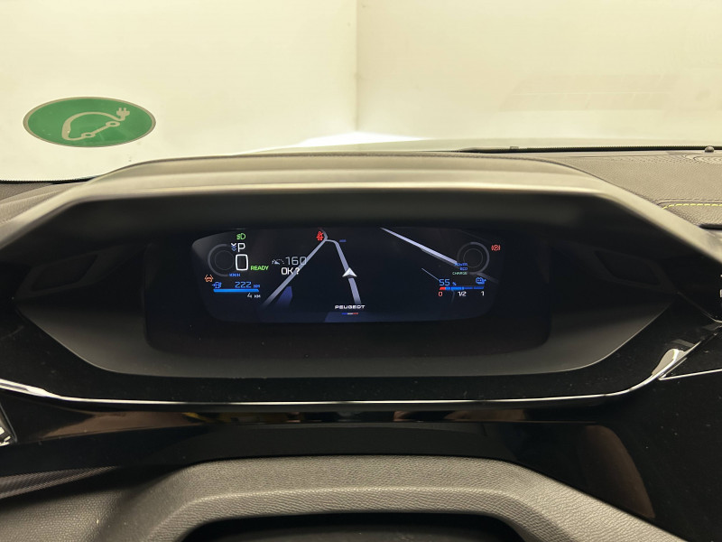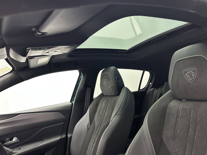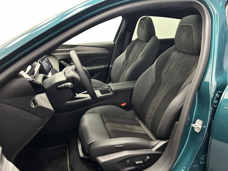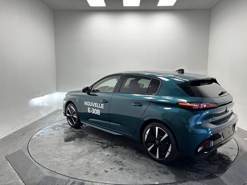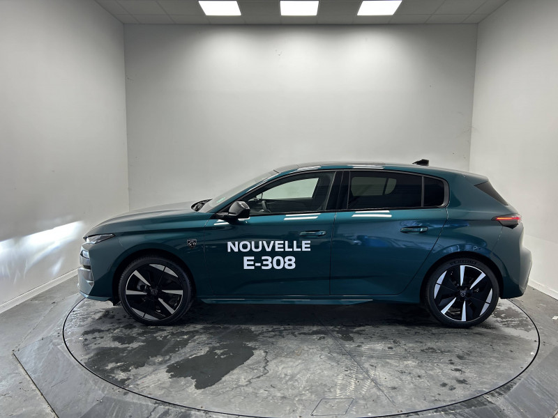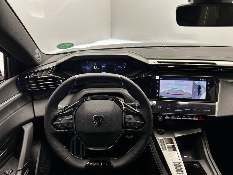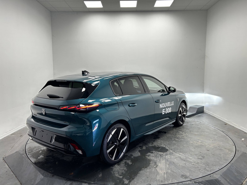 2 prises USB-C à l'AR / 4 poignées de maintien / 6 airbags Airbags frontaux conducteur et passager (passager neutralisable par clé) Airbags latéraux conducteur et passager AV Airbags rideaux aux places AV et AR / Accès et démarrage mains libres Proximity / Aide au stationnement AV/AR, graphique et sonore / Boîte automatique à variation continue (1 rapport) / Câble de recharge mode 3 triphasé 22 kW / Chargeur embarqué 11 kW triphasé bi-directionnel Avec prédisposition V2L (Vehicle to Load) / Diffuseurs d'air aux places AR / Eclairage intérieur Plafonnier AV et liseuses AR à LED, Boite à gants et rangement de console éclairés à LED, Eclairage de coffre à lampe / Eléments de design extérieur Calandre AV avec grille supérieure et blason PEUGEOT illuminés, Élargisseurs de pare-chocs AV et de bas de caisse, Monogrammes blason PEUGEOT sur ailes AV, Lécheurs de vitre Noir brillant / Eléments de design intérieur Planche de bord moussée avec décor aluminium, Panneaux de portes avec décor aluminium / ESP avec aide au démarrage en pente, et détection de sous-gonflage indirect / Essuie-vitre AV à déclenchement automatique / Feux AR 3 griffes à LED Allumage dynamique griffe à griffe / Freinage régénératif 3 niveaux / Frein de stationnement électrique / Intérieur Alcantara Executive - Sellerie Alcantara Noir, tri-matières avec accompagnement TEP et surpiqûres vert Adamite - Siège conducteur AGR à réglages électriques, massant, chauffant - Siège passager AV à réglages manuels, avec réglage en hauteur de l'assise et lombaire pneumatique, massant, chauffant - Volant chauffant / Jantes alliage 18" SEATTLE diamantées Bi-tons Noir Onyx et inserts Noir Onyx mat / Kit de dépannage pneumatique Compresseur 12 V avec cartouche de produit de colmatage / Lève-vitres AV et AR électriques, séquentiels et antipincement / Monogrammes E308 sur volet de coffre / Monogrammes GT sur volet de coffre / Navigation connectée / Pack Drive Assist - Régulateur de vitesse adaptatif avec fonction Stop&Go / Pack Safety Plus Régulateur / Limiteur de vitesse, Freinage d'urgence automatique avec alerte risque de collision, piloté par caméra et radar Alerte active de franchissement involontaire de ligne et bas-côté, Reconnaissance étendue des panneaux de signalisation et préconisation de vitesse, Alerte attention conducteur / Pack Vision 360° & Drive Assist Plus - Peugeot iCockpit avec instrumentation numérique 10'' 3D personnalisable - Visio Park 360° (4 caméras) + Rear warning (surveillance d'angles morts, aide au changement de voie longue portée et alerte de trafic AR transversal) + Aide au maintien de la position dans la voie (conduite semi-autonome) - Pack Inviolabilité - Clean Cabin avec capteurs de particules dans l'habitacle / Pare-brise teinté feuilleté acoustique / Peugeot Connect SOS & Assistance / Peugeot i-Connect Advanced Navigation 3D connectée, et i-Toogles virtuels personnalisables, Pack Connect Plus (Abonnement inclus 6 mois) / Pompe à chaleur / Pré-conditionnement thermique habitacle et batterie, et charge différée via l'écran central / Projecteurs Peugeot Matrix LED Technology Éclairage adaptatif en fonction des conditions extérieures et de la circulation / Rétroviseur intérieur électrochrome / Rétroviseurs extérieurs avec éclairage d'approche / Système audio avec 6 HP 2 tweeters et 2 woofers à l'AV, 2 HP large bande à l'AR / Trip planner Planification des trajets et de la recharge, intégré au système de navigation / Visiopark 1 Caméra de recul HD et aide au stationnement AR, graphique et sonore / Vitrage portes AV feuilleté / Vitres latérales AR et lunette AR chauffante surteintées / Volant compact GT en cuir pleine fleur avec surpiqûres vert Adamite