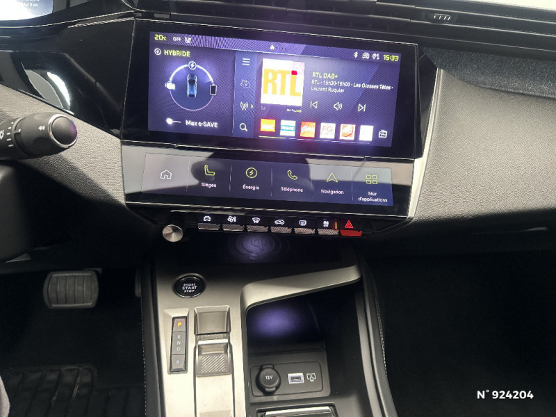 Sièges dynamiques avec appuis tête AV deux voies / Jantes alliage 19" diamantées GRAPHITE / Rétroviseurs extérieurs électrique avec éclairage d'approche, dégivrants et rabattables électriquement, avec répétiteurs de feux clignotants à LED / Sellerie Tri matières Tissus FRACTIL et BALADIN / TEP / Accoudoir central avec rangement et porte gobelet / Pack Rear traffic detection / Câble de recharge mode 2 (10 A, 2,3 kW, pour prise domestique standard) / Sélecteur de modes (Electric, Hybrid, Sport) / Essuie-vitre AV à déclenchement automatique / Navigation connectée avec écran central tactile 10'' et i-Toggles virtuels personnalisables / Fonction Mirror Screen (Apple CarPlay / Android Auto ) sans fil / Airbags frontaux conducteur et passager adaptatifs (passager neutralisable par clé), airbags latéraux conducteur et passager AV, airbags rideaux de tête aux places AV et AR / Teinte métallisée Bleu Obsession / Lécheurs de vitres Noir Brillant / Kit de dépannage de pneumatique / Lève-vitres AV et AR électriques séquentiels avec antipincement / Capacité batterie 12,4 kWh / Puissance batterie 100 kW / Chargeur embarqué 3,7 kW / Pack Drive Assist / Détection de sous gonflage / Projecteurs Peugeot LED Technology / Pack Safety Plus / 4 poignées de maintien (2 à l'AV et 2 à l'AR) / 2 prises USB-C à l'AV / Informations sur la position, consommation, télémaintenance, statistiques de roulage et état de charge de la batterie / Monogrammes Hybrid / Pré-conditionnement thermique et charge différée via My Peugeot ou l'écran central / Calandre avec grille chromée / Eclairage d'ambiance (8 couleurs) / 2 prises USB-C à l'AR / 2 télécommandes 3 boutons / Vitres AV feuilletées acoustiques / Peugeot i-Cockpit avec combiné d'instrumentation numérique 10'' personnalisable / Pare-brise teinté feuilleté acoustique / Vitres latérales AR et lunette AR chauffante temporisée surteintées / Accès et démarrage mains libres / Commutation automatique des feux de route / Frein de stationnement électrique / Fonction DAB (Radio Numérique Terrestre) / Feux diurnes à LED sous projecteurs / ESP avec fonction Hill Assist (Aide au démarrage en pente) / Décors intérieurs textiles (planche de bord, panneaux de porte) / Air Quality System (filtre à charbon HEPA) / Reconnaissance vocale en langage naturel