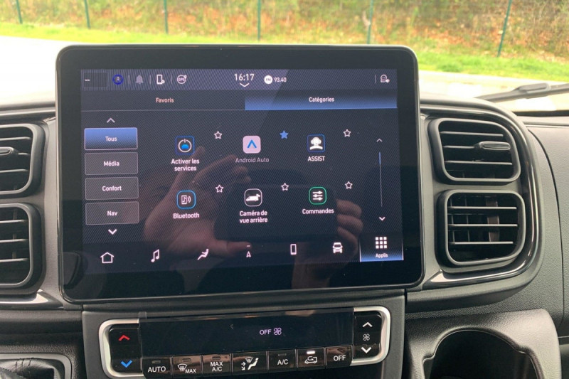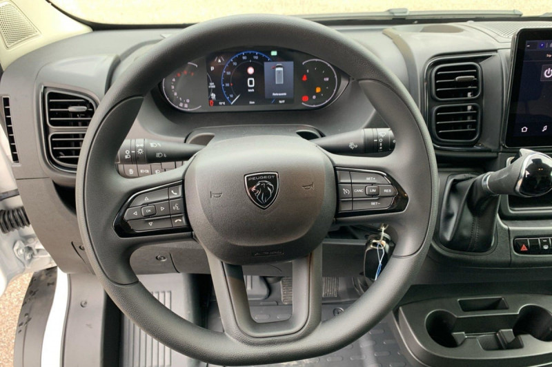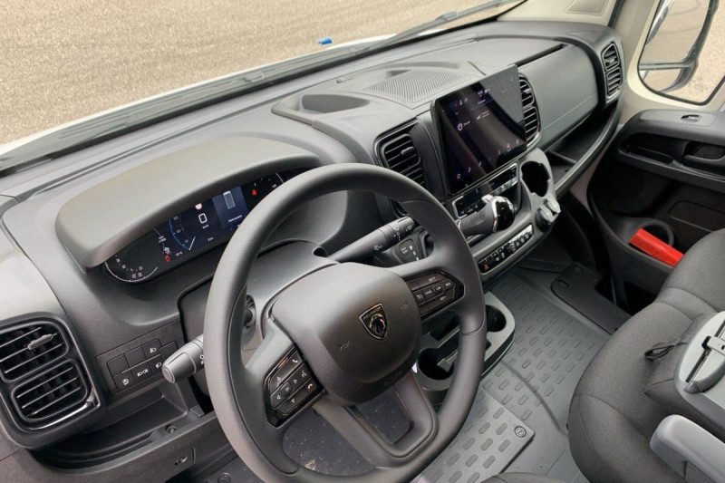 Siège conducteur avec accoudoir, réglable en hauteur et réglage lombaire / Cloison tôlée / Portes AR à 2 battantes tôlés / Sellerie en tissu crêpe noir avec appuie-tête plein / Aide au stationnement AR avec avertisseur sonore pour piétons / ABS, AFU, ASR et ESP (ESC amélioré avec assistance en cas de vent latéral, contrôle de stabilité de la remorque, et freinage après collision) / Capteur de pression des pneumatiques (TPMS indirect) / Crochets d'arrimage latéraux dans l'espace de chargement / Porte-gobelets au milieu du tableau de bord / Projecteurs halogène avec feux de circulation diurne / Rappel de bouclage des ceintures de sécurité / Boitier télématique autonome (BTA) / Pack Sécurité ADAS : Reconnaissance des panneaux de signalisation Freinage d'urgence autonome avec détection piéton / cycliste Aide au maintien dans la voie Détecteur de fatigue ou d'inattention (attention assist) Adaptation intelligente de la vitesse / Roues en acier 16" / Boîte de vitesse automatique 8 rapports / Lève vitres AV électriques (séquentiel côté conducteur à la descente et à la montée avec fonction anti-pincement, séquentiel à la descente côté passager) /