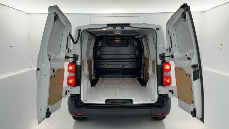 Anneaux d'arrimage (6 en Taille M, sur la zone de chargement) / Cloison pleine tôlée / Boucliers avant et arrière teintés masse / Portes arrière battantes 50/50 tôlées à ouverture à 180° / Roues tôles peintes grises 16" avec cabochon noir / Revêtement de sol TPO dans l'habitacle / Siège conducteur avec accoudoir et réglage lombaire / Pack Visibilité / Banquette passager 2 places avec rangement sous assise / Pack Sécurité / Kit de regonflage pneumatiques / Freinage automatique d'urgence avec alerte risque de collision / / Renault Trafic - Volkswagen Transporter