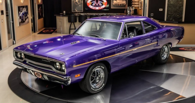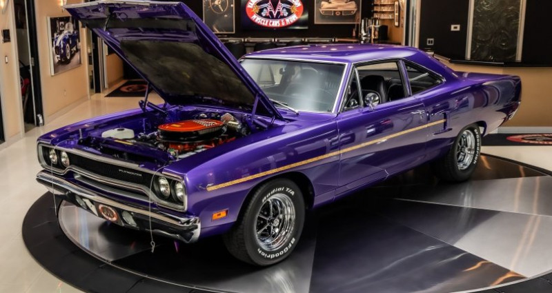 - Marque : Plymouth - Modèle : Road Runner - Année : 1970 - VIN : RM21V0G137603 - Couleur extérieure : In-Violet Purple - Couleur intérieure : Noir - Moteur : 440 Six Pack V8 - Boîte de vitesses : 727 Automatique - Transmission arrière : Factory Style Rear End, 3.55:1 Gear Ratio - Pneus : Magnum 500 Wheels avec BFGoodrich Radial T/A Tires (245/60/15 avant, 275/60/15 arrière). Provenance : Michigan. Disponibilité : environ 7 semaines, clés en main. 144 500 € tout compris (importation, taxes, procédure d'immatriculation). Annonce publiée le 29/12/2025