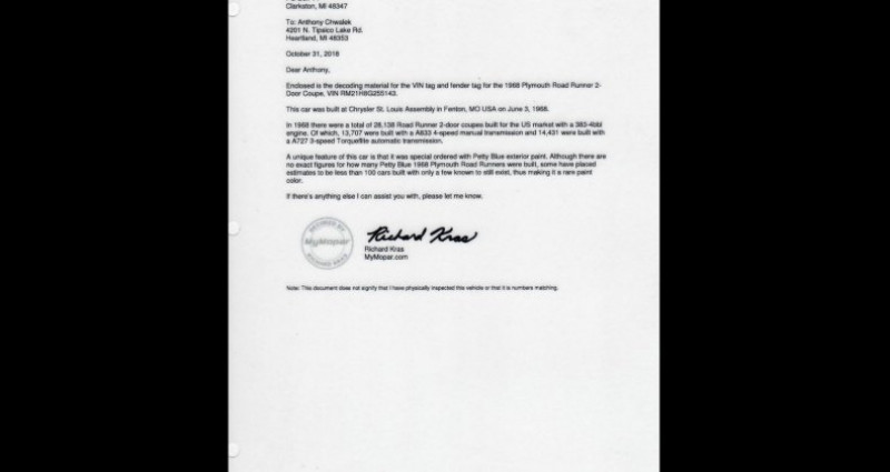 - Marque : Plymouth - Modèle : Road Runner - Année : 1968 - Numéro de série : RM21H8G255143 - Couleur extérieure : Petty Blue - Couleur intérieure : Blue - Kilométrage : 1 542 miles - Moteur : Mopar 440ci V8 - Boîte de vitesses : 4 vitesses manuelle - Transmission arrière : Sure Grip Rear End avec 3.91:1 Gear Ratio - Freins avant : Freins à disque - Suspension : Nouvelle suspension de type factory style - Pneus : Aluminum Wheels Wrapped In BFGoodrich Radial T/A Tires (225/70/15 front, 275/60/15 rear) - Carrosserie : Peinture semi-gloss Black sous la carrosserie - Intérieur : Siège avant divan, siège arrière divan, ceintures de sécurité latérales, levier de vitesses manuel sur le plancher, volant bois, tableau de bord factory style avec panneaux de porte et tapis bleus. Provenance : Michigan. Disponibilité : environ 7 semaines, clés en main. 144 500 € tout compris (importation, taxes, procédure d'immatriculation). Annonce publiée le 29/12/2025