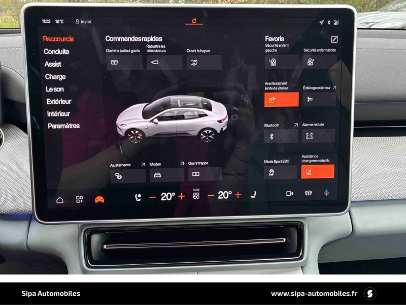 360° Cameras and 3D view / ADAS - Advanced Driver Assistance systems 11 vision cameras, 1 radar, 12 ultrasonic sensors, 1 DMS / LED Headlights with active high beam / LED rear lights / Parking climate incl. scheduled preconditioning / 12V power outlet in rear luggage compartment / 15.4 Landscape CSD / 15W wireless phone charger / 20" Aero / 6-way electrical passenger seat / 8-way electrical driver seat with profile memory / ABS, ESP / AC Charging cable for public/home wallbox / Adaptive cruise control (ACC) with Stop and Go / Adjustable steering force / Advanced Collision Avoidance Intersections / Alarm with interior motion sensor (PPWW state Alarm theft - Internal monitor) / Alco-lock preparation / Android Automotive OS / Blind Spot Information System (BLIS) with steer assist / Camera based interior mirror with automatic dimming, glare and brightness control / CCD Continuous control damping chassis (LRDM), adjustable in 3 levels / Clean Zone / Collision Avoidance and mitigation by braking and steering / Colour coordinated Polestar emblem / Cross Traffic Alert (CTA) with brake support / Customer modes (car wash-, rest-, and animal mode) / DAB+ / Digital key / Digital rear view interior mirror / Direct tyre pressure monitoring system / Drive modes (LRDM): Performance and Range, Launch mode / Driver Alert Control / Electric child safety lock in rear doors / Electrical door latch / Energy saving heat pump / Floating tunnel console with lower storage / Flush door handles / Flush door/windows with frameless windows / Forward Collision Warning / Frameless exterior mirrors / Front and rear parking assist / Front storage compartment - 15 litres / Google Built-in / Hands-on detection Steering wheel / Heated front seats / High performance audio system 8-speakers / In car apps / Integrated e-SIM with 5G network / Intelligent speed assist Speed limit information.Speed limit warnings / ISOFIX outer rear seats / Keyless entry and drive / Lane Keeping Aid / Life detection interior radars / Metal door sill and trunk sill inlay / Mid-level interior illumination / Motorised charge lid / One pedal drive (regenerative braking), x3 adjustable modes / OTA updates / Panoramic glass roof / Polestar App / Post-impact braking / Power operated tailgate with soft closing / Puddle light logo projector / Rain sensor / Rear Collision Warning & Mitigation (RCWM) / Rear seat - 40/60 split / Rear storage compartment - 526 litres including under floor / Road Sign Information / Run-off Road Mitigation / Slim IP and Air vents / Smart home connectivity / Solar system-inspired interior illumination / TCS / Textile floor mats 100% rPET / Up to 11 kW AC charging / Up to 200 kW DC charging / USB-C 2 front, 2 rear row, 1x 60W / x1 Ultra-wideband key, x1 NFC key cards et Polestar Digital Key