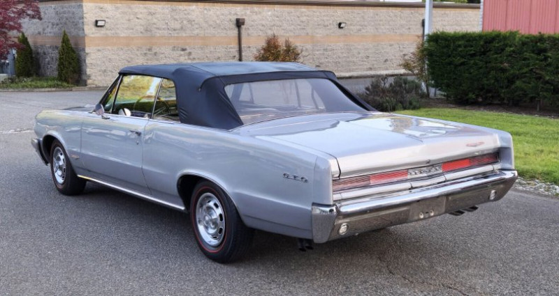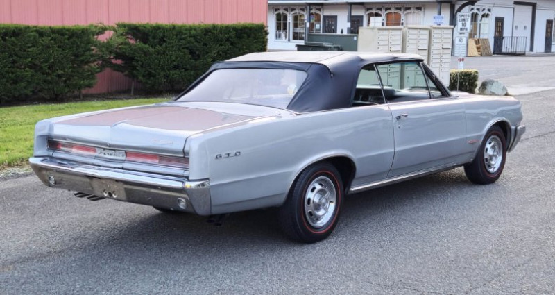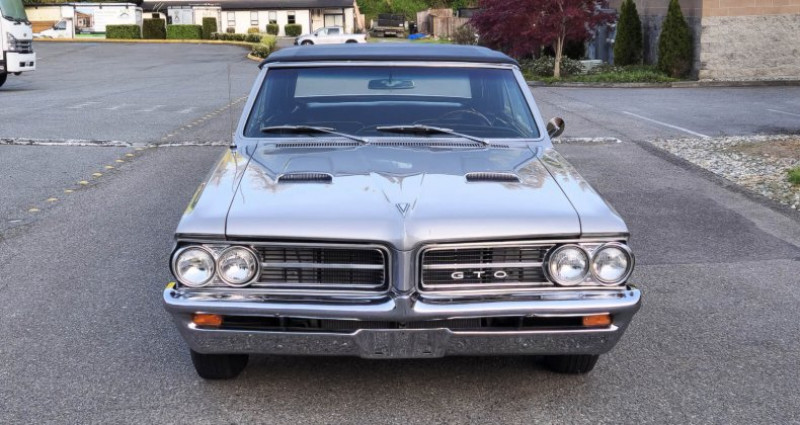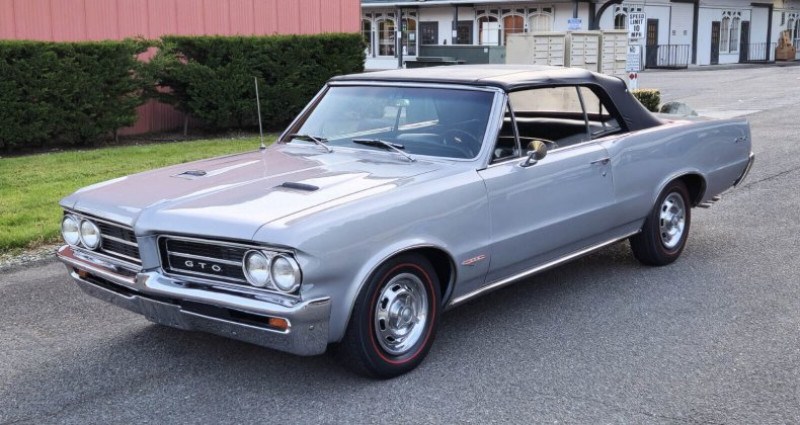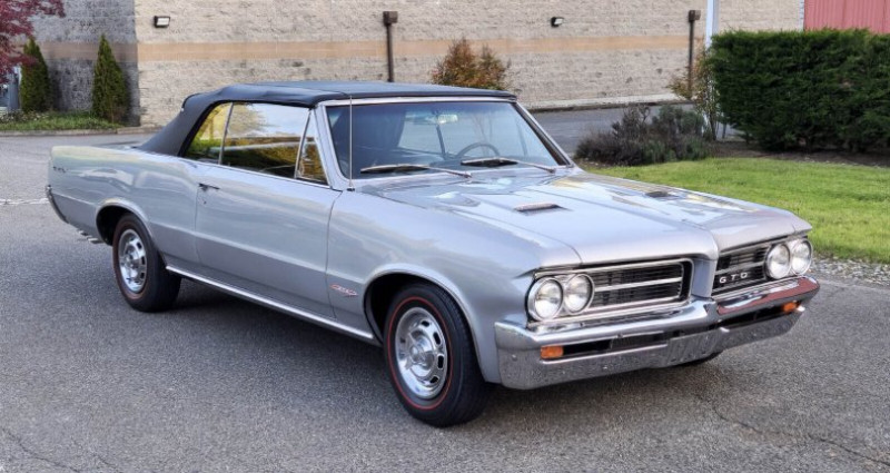 1964 Pontiac GTO • Gran Turismo Omologato • Convertible • Rare silver mist gray • black power top • buckets • 389 c.i. 325 h.p. • 4-speed • Hurst shifter • 1 of 6644 built • console • P.S. • dual exhaust • 10.75:1 compression • 0-60 in 7.7 seconds • polished mag-style hub caps • redlines • Market value $30, 000 to $65, 000 • Stored many years • fast fun affordable • V.I.N. 824F008909 • Stock # 2576578 • 882 miles • $43, 950. Provenance : Washington. Disponibilité : environ 7 semaines, clés en main. 48 500 € tout compris (importation, taxes, procédure d'immatriculation). Annonce publiée le 24/11/2025