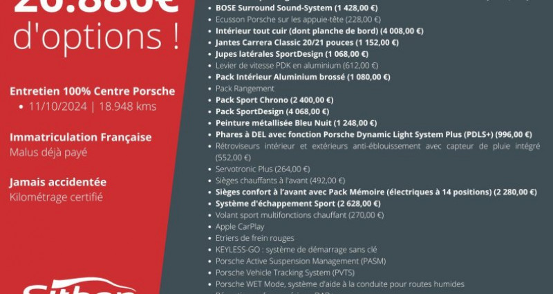 LES PLUS : * Immatriculation Française : Malus payé * Entretien 100% en Centre Porsche * Jamais accidentée * Kilométrage certifié * PACK SPORT DESIGN * Bleu Nuit Métallisé * Très faible kilométrage * Total des options : 26.886? - Historique d'entretien 100% en Centre Porsche : * Dernier entretien : 11/10/2024 | 18.948 kms | Centre Porsche * Certificat 111 points de contrôles : 11/10/2024 | 18.948 kms - OPTIONS INDIVIDUELLES : - Affichage des limitations de vitesse avec assistance de changement de voie (1 068,00 ?) - Assistance parking avant et arrière avec caméra de recul et vue 360° (1 044,00 ?) - BOSE Surround Sound-System (1 428,00 ?) - Ecusson Porsche sur les appuie-tête (228,00 ?) - Intérieur tout cuir (dont planche de bord) (4 008,00 ?) - Jantes Carrera Classic 20/21 pouces (1 152,00 ?) - Jupes latérales SportDesign (1 068,00 ?) - Levier de vitesse PDK en aluminium (612,00 ?) - Pack Intérieur Aluminium brossé (1 080,00 ?) - Pack Rangement - Pack Sport Chrono (2 400,00 ?) - Pack SportDesign (4 068,00 ?) - Peinture métallisée Bleu Nuit (1 248,00 ?) - Phares à DEL avec fonction Porsche Dynamic Light System Plus (PDLS+) (996,00 ?) - Rétroviseurs intérieur et extérieurs anti-éblouissement avec capteur de pluie intégré (552,00 ?) - Servotronic Plus (264,00 ?) - Sièges chauffants à l'avant (492,00 ?) - Sièges confort à l'avant avec Pack Mémoire (électriques à 14 positions) (2 280,00 ?) - Système d'échappement Sport (2 628,00 ?) - Volant sport multifonctions chauffant (270,00 ?) - Apple CarPlay - Etriers de frein rouges - KEYLESS-GO : système de démarrage sans clé - Porsche Active Suspension Management (PASM) - Porsche Vehicle Tracking System (PVTS) - Porsche WET Mode, système d'aide à la conduite pour routes humides - Réception radio numérique DAB+ - Régulateur et limiteur de vitesse - Teinte de capote noire - ?GARANTIE : Tous nos véhicules bénéficient des garanties légales minimum de vice caché et de conformité Elles sont également toutes éligibles à la garantie contractuelle Véhicule d'exception, comparables à la Porsche Approved. Demandez-là à votre commercial ! Les véhicules de moins de 7 ans sont même élligibles à une garantie de 5 ans, pour seulement 49? par mois ! - SERVICES OPTIONNELS : - Protection covering transparent XPEL sur face avant : 2500? TTC - Traitement céramique sur carrosserie : 1800? TTC - Jantes peintes d'une autre couleur : 1000? TTC - Etriers de freins peints d'une autre couleur : 690? TTC - Vitres teintées : 450 - TTC - Ajout d'un module Apple CarPlay : 1500? TTC - FINANCEMENT : Nos solutions de crédit ballon permettent de bénéficier de mensualités plus faibles que dans le cas d'un crédit classique, sans pour autant s'obliger à un contrat de location et ses inconvénients. - A PROPOS DE NOUS : Nous vous accueillons à Grenoble depuis Février 1988, et plus recemment dans notre nouvelle concession à Saint-Egrève au bord de l'autoroute A480. Notre seule publicité, ce sont nos clients ! Nous vous encourageons à lire les avis que certains de nos 20.000 clients ont eu la gentillesse de nous laisser en ligne :) Nous esperons que vous en ferez bientôt partie ! ======= OPTIONS ======= Affichage des limitations de vitesse avec assistance de changement de voie Assistance parking avant et arrière avec caméra de recul et vue 360° BOSE Surround Sound-System Ecusson Porsche sur les appuie-tête Intérieur tout cuir (dont planche de bord) Jantes Carrera Classic 20 21 pouces Jupes latérales SportDesign Levier de vitesse PDK en aluminium Pack Intérieur Aluminium brossé Pack Rangement Pack Sport Chrono Pack SportDesign Peinture métallisée Bleu Nuit Phares à DEL avec fonction Porsche Dynamic Light System Plus (PDLS+) Rétroviseurs intérieur et extérieurs anti-éblouissement avec capteur de pluie intégré Servotronic Plus Sièges chauffants à l'avant Sièges confort à l?avant avec Pack Mémoire (électriques à 14 positions) Système d'échappement Sport Volant sport multifonctions chauffant ======= EQUIPEMENTS DE SERIE ======= Apple CarPlay Etriers de frein rouges KEYLESS-GO : système de démarrage sans clé Porsche Active Suspension Management (PASM) Porsche Vehicle Tracking System (PVTS) Porsche WET Mode, système d'aide à la conduite pour routes humides Réception radio numérique DAB+ Régulateur et limiteur de vitesse Teinte de capote noire Nb. Vitesses : 8 Conso Mixte : l/100