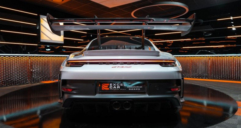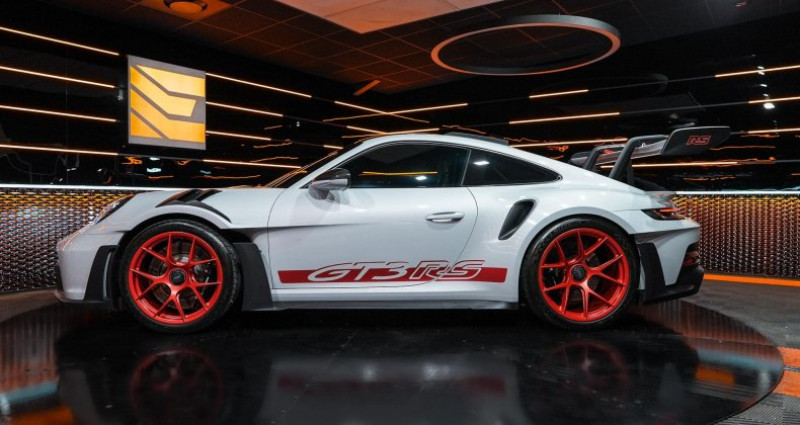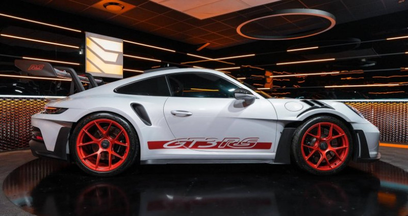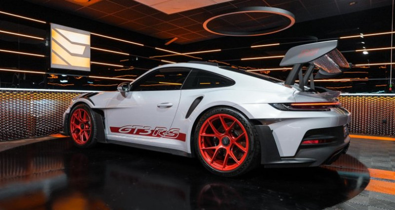 Boite de Vitesse : PDK TVA : Oui Crédit Possible : Oui Leasing Possible : Oui Garantie : Constructeur 04/2026 Options : Équipements de série + 04I Pack Weissach - 44 Intérieur pack Weissach avec éléments supplémentaires en cuir et Race-Tex noir / rouge indien - G7 Gris glacé métallisé - 8JU Phares matriciels à LED teintés avec Porsche Dynamic Light System Plus (PDLS+) - 2UH Système de levage de l’essieu avant - 6FP Partie supérieure des rétroviseurs en carbone - 9VL Bose® Surround Sound System - KA2 Assistance parking arrière avec caméra de recul - 8VH Feux arrière Exclusive Design - 1LR Étriers de frein peints en noir (finition brillante) - AME Pack extérieur désignations contrastantes - ACJ Tapis de sol en carbone gansés de cuir - 1NC Jantes peintes en rouge Pyro - VW7 Vitrages teintés - P14 Rétroviseurs intérieur et extérieurs anti-éblouissement avec capteur de pluie intégré - QJ7 Triangle de fenêtre en carbone - 4QX Harnais 6 points côté passager - 7M8 Baguettes de seuil de porte en carbone satiné, illuminées - 5XK Pare-soleil en Race-Tex noir - 3B0 Points d’ancrage des ceintures en Race-Tex - AFB Clé du véhicule peinte en couleur extérieure avec étui en Race-Tex - 2C6 Colonne de direction en cuir - 7V3 Fond de compte-tours en blanc - UP3 Fond du chronomètre en blanc - FZ1 Ceintures de sécurité rouge indien - 6E5 Accoudoir de la console centrale en Race-Tex avec écusson Porsche - 0I2 Réservoir 90 litres - UD1 Projecteurs de porte à LED avec signature - 8U7 Préparation Porsche Dashcam - G1C Boîte de vitesses Porsche Doppelkupplung (PDK) 7 rapports - 56R Jantes GT3 RS allégées 20/21 pouces en magnésium forgé - Q1K Sièges baquets intégraux - 6A9 Pack Clubsport Historique : Cette Porsche 992 GT3 RS a été livrée neuve en avril 2024 par le Centre Porsche Bayonne. Elle est donc d'origine française. Le véhicule bénéficie d’un film de protection PPF Xpel Ultimate Plus couvrant l’intégralité de la carrosserie, ainsi que d’un film spécifique appliqué sur le pare-brise. Un traitement céramique a également été appliqué sur ce PPF, ainsi que sur les jantes et les étriers de frein. Enfin, l’ensemble des vitres a été teinté.