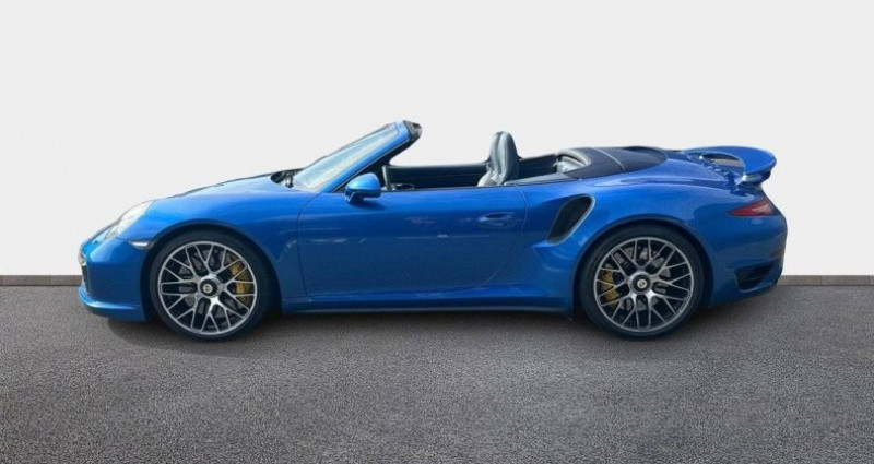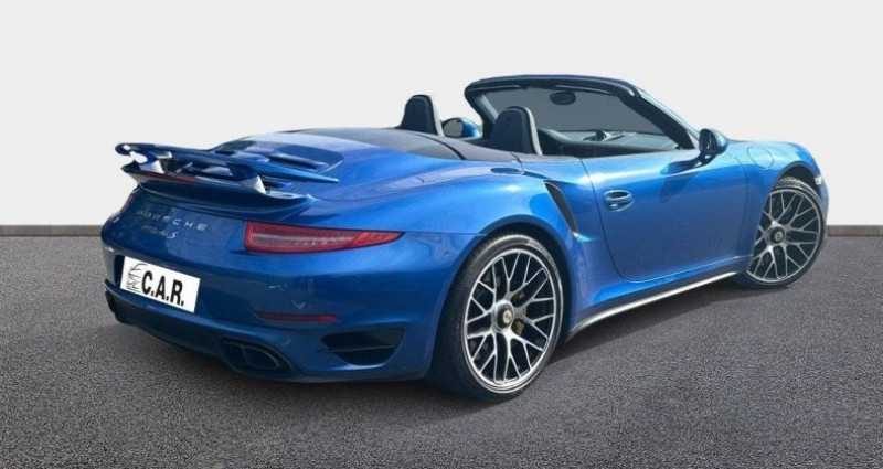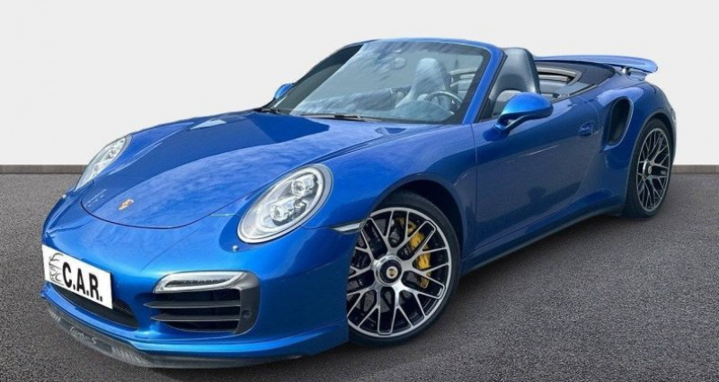 Cylindrée : 3800 cm3 Nb. Vitesse : 7 - Module téléphone - Pédalier et repose-pieds en aluminium - Affichage des limitations de vitesse - Baguettes de seuil de porte en acier inoxydable - Ecusson Porsche sur appuis-tête - Intérieur tout cuir en teinte spéciale - Jantes 911 Turbo 20 AV: 8.5Jx20 avec pneus 245/35 ZR20 et AR: 11Jx20 avec pneus 305/30 ZR20 - Sièges Chauffants - Assistant d'éclairage automatique avec fonction Home - Bouchon de réservoir effet alu - Capot du coffre, ailes AV, portières, toit (sur coupé) et capot AR ainsi que nombreux éléments de la structure en aluminium - Capote en tissu entièrement électrique et automatique avec 3 éléments en magnésium intégrés et une lunette AR en verre rigide, activation de la capote jusqu'à environ 50 km/h, activation confort avec la télécommande - Climatisation automatique bi-zone avec réglage individuel de la température pour le conducteur et le passager AV, commande automatique du recyclage de l'air avec capteur de qualité d'air - Conception allégée intelligente alliant acier et aluminium - Couronne du volant en cuir lisse - Fonction Stop-Start automatique - Habillage de la coque des dossiers des sièges Sport en cuir, caches des airbags latéraux dans la teinte de l'intérieur - Intérieur tout cuir dans les teintes de série 911 Turbo S: Noir-Rouge Carrera (bicolore) - Jantes 911 Turbo S 20 AV: 9Jx20 avec pneus 245/35 ZR20 et AR: 11.5Jx20 avec pneus 305/30 ZR20 - Lève-vitres électriques avec fonction à impulsion haut/bas et abaissement automatique de la vitre - Pack Intérieur Carbone - Pack Sport Chrono - Porsche Communication Management (PCM) avec module de navigation et interface audio universelle - Protection anti-tonneau à déploiement automatique - Rétroviseurs intérieur et extérieurs à anti-éblouissement automatique et capteur de pluie intégré - Système de stabilisation dynamique PSM (Porsche Stability Management) avec fonctions antiblocage (ABS), antipatinage (ASR), différentiel de freinage automatique (ABD) et régulation du couple moteur (MSR) - Système Porsche Active Aerodynamics (PAA) avec spoiler AV et aileron AR déployable automatiquement sur 3 positions - 2 porte-gobelets côté passager derrière la baguette décorative du tableau de bord - 2 sorties d'échappement doubles au design Turbo en acier inoxydable Noir chromaté - 3 Prises 12V (plancher côté passager, boîte à gants et coffre de rangement de la console centrale) - 5 instruments ronds intégrés au tableau de bord - Affichage analogique: régime moteur, vitesse, pression et témperature d'huile, témperature de refroidissement et niveau d'essence - Affichage multifonction: pression de suralimentation, puissance moteur développée, répartition du couple AV et AR, accélérations longitudinale et transversale - Affichage numérique: vitesse, rapport engagé, kilométrage total et journalier - Airbags grand volume conducteur et passager - Appuis-tête AV intégrés - Assistance parking AV et AR - BOSE Surround Sound-System - Bouclier AR avec sorties d'air du refroidissement des turbocompresseurs, sorties d'échappement intégrées et signature - Bouclier AV avec lamelles latérales (Airblades) supplémentaires et capteurs d'assistance parking intégrés - Boîte à double embrayage Porsche (PDK) à 7 rapports avec volant bimasse - Boîte à gants verrouillable - Cabriolet 2+2 places avec carrosserie 911 Turbo élargie - Cache de la console centrale en carbone - Cadrans du combiné d'instruments en Noir, cerclage extérieur couleur chrome, compte-tours avec cerclage couleur Argent et signature rétroéclairée - Catadioptres intégrés au bouclier AR - Ceintures de sécurité 3 points AV/AR, boucles de ceinture sur les sièges - Ciel de toit garni de tissu noir - Combiné d'instruments avec compte-tours central et écran couleur haute définition de 4.6 - Console centrale montante avec barrettes de commande, vide-poches et coffre de rangement fermé avec prise 12V - Crochets porte-vêtement au dos des sièges et sur les montants centraux - Direction assistée électromécanique à rapport variable - Direction de l'essieu AR - Dispositif antidémarrage avec verrouillage centralisé et télécommande, système d'alarme avec surveillance radar de l'habitacle - Dispositif de contrôle de l'usure des freins sur chaque plaquette - Eléments intérieurs revêtement Carbone - Essieu AR multibras avec barres stabilisatrices - Essieu AV à jambe de force McPherson avec barre stabilisatrice - Essuie-glaces à 2 vitesses de balayage et intermittence réglable, buses de lave-glace chauffantes - Feux AR à DEL comprenant les feux de recul, les feux de position, les feux stop, le feu antibrouillard AR et les clignotants, le 3ème feu stop et l'éclairage de la plaque d'immatriculation - Feux à DEL supplémentaires intégrés au bouclier AV avec feux de position, feux de jour, clignotants et rappel de clignotants latéraux - Filtres à particules et à pollen avec filtre à charbon actif - Frein de parking électrique - Gestion des phases d'arrêt avec fonction antirecul - Kit anti-crevaison avec compresseur électrique - Lame de spoiler AV avec signature en relief - Logements pour système de fixation de siège enfant ISOFIX et Top-Tether sur les sièges AR - Lunette AR dégivrante - Miroirs de courtoisie éclairés intégrés dans les pare-soleil (conducteur et passager) - Pare-brise teinté en dégradé de gris - Phares à DEL avec fonction Porsche Dynamic Light System Plus (PDLS Plus) - Porsche Active Suspention Management (PASM) - Porsche Ceramic Composite Brake (PCCB) - Porsche Dynamic Chassis Control (PDCC) - Porsche Side Impact Protection System (POSIP) comprenant : protection anti-encastrement latérale dans les portes, airbags thorax intégrés dans les bandes extérieures des sièges et airbags de tête intégrés dans les contre-portes pour le conducteur et le passager - Porsche Torque Vectoring Plus (PTV Plus) - Pris
