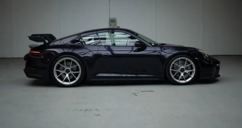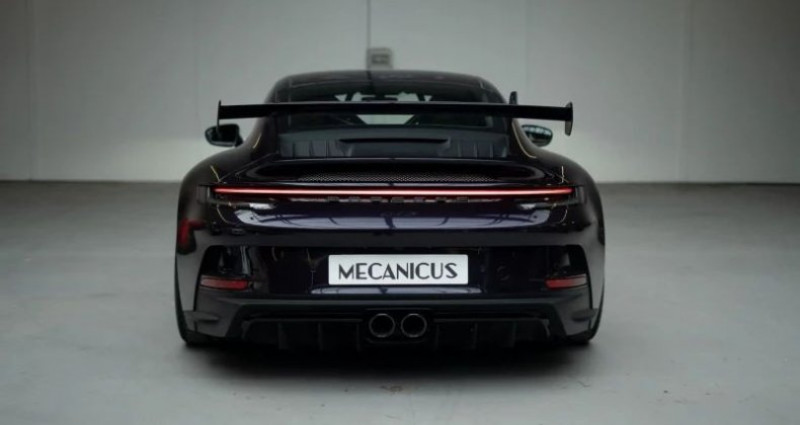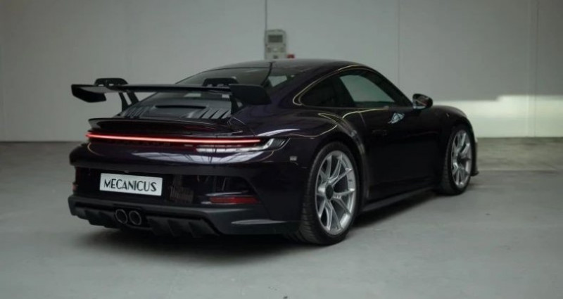 Porsche 911 COUPE (992) GT3 Clubsport *PTS Viola Metallic*, (Coupé), VIOLET, 41cv, 2 portes, mise en circulation le 16-11-2021, garantie 12 mois (12 MOIS). 2 places, couleur intérieur : NOIR, longueur : 4,57 mètres, boîte de vitesse : automatique OPTIONS ET EQUIPEMENTS : Kilométrage garanti. La Porsche GT3 que nous vous présentons est d'origine française, livrée le 16 novembre 2021 par le Centre Porsche Antibes. La configuration de cette auto est exceptionnelle et rare : vous retrouvez une peinture Porsche Paint To Sample (PTS), à la demande, Viola Metallic, avec un intérieur tout en cuir noir avec les surpiqûres contrastantes Argent GT. La bande centrale des sièges baquets 918 est quant à elle en Race-Tex noir. Les jantes à écrous centraux sont peintes couleur Argent GT, une teinte qui se marie parfaitement au Viola Metallic. Notre exemplaire est équipé de la boîte de vitesses PDK. En ce qui concerne les équipements, rien ne manque à l'appel. On retrouve le Pack Clubsport, le Pack Sport Chrono, le système Lift, le pack décoratif intérieur en carbone, les seuils de portes en carbone, le cuir étendu, l'accoudoir en Race-Tex avec le logo Porsche embossé, le réservoir de carburant de 90 L, l'assistance au parking avant et arrière avec la caméra de recul, le système son Bose et les phares PDLS+. La liste complète des options est disponible ci-dessous. Des flexibles de frein type aviation ont été installés en Centre Porsche pour endurcir le freinage. Cette GT3 est faiblement kilométrée, elle n'a parcouru que 9 000 kilomètres depuis sa livraison en concession. Le premier propriétaire, commanditaire de cette configuration époustouflante, ne s'est en réalité pas servi de la voiture et l'a revendue alors qu'elle n'affichait que 12 kilomètres au compteur. C'est son deuxième et dernier propriétaire qui commencera à faire réellement rouler cette voiture. La voiture a toujours été suivie chez Porsche, nous disposons de son carnet d'entretien ainsi que d'un ensemble de factures. Elle recevra son entretien bisannuel chez Porsche à l'occasion de sa vente. Une garantie Porsche Approved est valable sur la voiture jusqu'au mois de novembre 2025. La peinture est entièrement d'origine, aucun élément n'a été repeint, elle se trouve dans une condition exceptionnelle. Les freins ainsi que les pneus Michelin Pilot Sport Cup 2 sont en excellent état. Cette 992 GT3 est un véritable ovni roulant avec son aileron arrière en col de cygne. Sa configuration exceptionnelle et son très faible kilométrage la rendent encore plus envoûtante. Elle est disponible immédiatement. Equipement optionnel : BOSE Surround Sound-System Pack Intérieur Carbone (finition brillante) Pack luminosité Pack rangement Sièges baquets intégraux Assistance parking AV et AR avec caméra de recul Ecusson Porsche sur l'accoudoir de la console centrale en Race-Tex Etriers de frein en Noir (finition brillante) Pack Sport Chrono Peinture spéciale PTS Réservoir de carburant de 90L Système de levage de l'essieu AV Pack Club Sport avec extincteur intégré Phares matriciels à LED teintés avec Porsche Dynamic Light System Plus (PDLS Plus) Liste des entretiens : 11/2021 - Livraison - 10km - Porsche Antibes 06/2023 - Entretien - 5361km - Porsche Lyon Un entretien est prévu pour la vente Le véhicule est couvert par un contrat de garantie Triomphe Essentielle 12 mois avec plafond de 10 000€. Extension de durée (24 mois) et/ou de plafond (20 000€) possible. L'auto est visible à Paris ou sur le site de Mecanicus pour plus de photos. Nos prix s'entendent TVA et malus inclus, le coût de la carte grise reste à la charge de l'acheteur. Reprise et financement possibles. L'équipe MECANICUS Référence annonce : 221