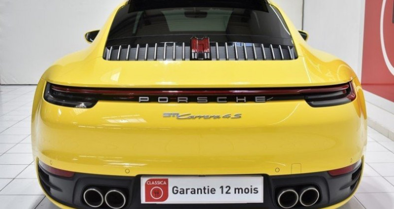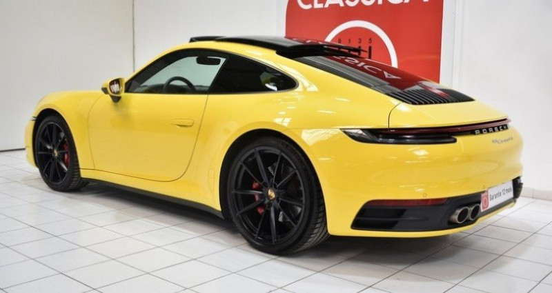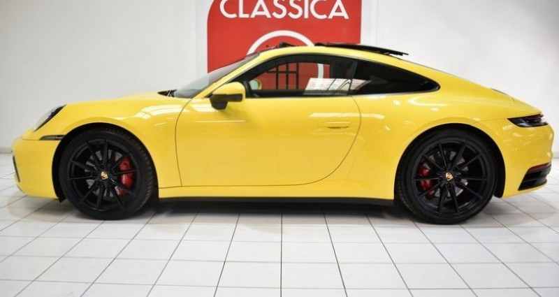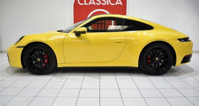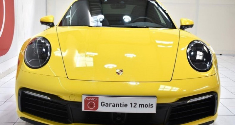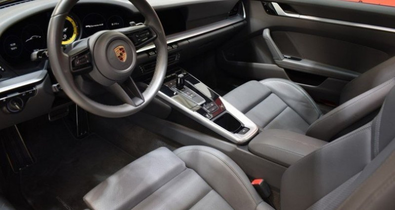 CONDUITE : à gauche CARTE GRISE : Normale NB PLACES : 4 NB CYL. : 6 à plat PNEUMATIQUES : Usure Av 30% + Ar 40% * GARANTIE 12 MOIS incluse * REPRISES et LIVRAISON possibles * Frais de mise à la route (option) : 690 EUR. TTC (Batterie neuve, Révision (vidange moteur + filtre), 1/4 de carburant, Lavage carrosserie + lustrage, nettoyage et aspiration intérieure). * Service « carte grise » et « carte grise collection » (dossier FFVE inclus) Porsche 911 type 992 Carrera 4S (Phase1) Origine France Première main Facture d'achat centre PORSCHE France Version 4S / 3.0 / 450 cv Boite robotisée double embrayage PDK à 8 rapports Entretien 100% centre PORSCHE Carnet PORSCHE d'origine Manuels utilisateur d'origine Matching color extérieur : « Racing Gelb 1S1 » Matching color intérieur : « Grau DH » 4 jantes Carrera S 20 '' à l'avant / 21'' à l'arrière 4 pneumatiques MICHELIN Pilot Sport Etriers de frein coloris « Rot » Aide au stationnement avant et arrière Caméra d'aide au stationnement Alarme Options et équipements : - P3 ? Gelb Racing (Couleur extérieure) - DH ? Intérieur Grau Ardoise avec sièges avant cuir - 3FE ? Toit coulissant / relevable électrique en verre (2.268 EUR.) - 4KF ? Vitrage arrière fumé (552 EUR.) - 6XV ? Rétroviseurs extérieurs rabattables électriquement avec éclairage d'alentour (342 EUR.) - G1G ? Boîte de vitesses PDK (Porsche Doppelkupplung) à 8 rapports - 0N5 ? Roues arrière directrices (2.268 EUR.) - 1N3 ? Servotronic Plus (assistance de direction adaptative 264 EUR.) - 1N1 ? Jantes Carrera S 20/21 pouces - 1NX ? Jantes peintes en Noir (finition satinée 1.200 EUR.) - 8IS ? Phares à LED avec fonction Porsche Dynamic Light System Plus (PDLS Plus : 996 EUR.) - P14 ? Rétroviseurs intérieur et extérieurs anti-éblouissement avec capteur de pluie intégré (552 EUR.) - KA6 ? Assistance parking avant et arrière avec caméra de recul et vue 360° (1.704 EUR.) - P60 ? Affichage des limitations de vitesse avec assistance au changement de voie (1.068 EUR.) - 4F2 ? Accès Confort (entrée et démarrage sans clé 552 EUR.) - 8T3 ? Régulateur de vitesse adaptatif (1.716 EUR.) - 7Y1 ? Assistance angles morts (828 EUR.) - Q1J ? Sièges sport adaptatifs à l'avant (18 positions, électriques) avec Pack Mémoire (3.648 EUR.) - 4A3 ? Sièges chauffants à l'avant (492 EUR.) - 2ZC ? Volant sport multifonction avec options (270 EUR.) - FZ4 ? Ceintures de sécurité Jaune Racing (444 EUR.) - 8PC ? Fond du compte-tours en Jaune Racing (348 EUR.) - 6E3 ? Monogramme sur l'accoudoir de console centrale (228 EUR.) - 6TE ? Pack intérieur Aluminium brossé (1.080 EUR.) - 9VL ? BOSE® Surround Sound System (1.428 EUR.) Démarrage sans clé Start and Stop Modes : Wet / Normal / Sport / Contrôle électrique de la pression des pneus Psm Allumage automatique des feux Tableau de bord coloris « Grau DH » Climatisation automatique Bi-Zone Contre-portes en cuir « Grau DH » avec surpiqûres coloris « Grau DH » Console centrale piano coloris « Schwarz » Régulateur adaptatif Limitateur de vitesse Logiciel de navigation pack Europe Ecran tactile multifonction couleur Apple Car Play avec reconnaissance vocale Siri Disque dur multimédia / Fonction mp3 / Borne WI-FI Appel d'assistance localisé / Fonction « Follow me home » Connectiques double usb /sim / sd Prise 12v et auxiliaire de connexion audio Volant sport chauffant en cuir multifonctions coloris « Grau » réglable en hauteur et profondeur Palettes PDK au volant Frein de parking automatique Seuils de porte aluminium siglés « 911 Carrera 4S » Moquettes coloris « Grau » Sur tapis PORSCHE coloris « Grau » Kit anti-crevaison Historique du modèle : Huitième génération de l'iconique et indémodable 911, la version 992 est présentée en 2018 au salon de Los Angeles. Parfaitement dans l'air du temps, elle est plus puissante, plus large, plus lourde de 50kg malgré sa caisse tout en aluminium et toujours plus connectée. Si la sonorité du Flat 6 apparait en léger retrait, l'efficacité et les performances du nouveau 3.0 bi-turbo sont proprement sidérantes, notamment grâce à la nouvelle boîte PDK 8 rapports à la fois plus douce et encore plus réactive. Le nouveau design intérieur apparait également très réussi en conjuguant modernité et classicisme épuré, malgré la présence trop importante de plastiques sur les portes et la console centrale. Conformément à la tradition PORSCHE désormais bien ancrée, la 992 sera déclinée en version Coupé, Cabriolet, Targa, Turbo et GT2 / GT3 / RS Carrosserie / Extérieur : Le modèle présenté ici est une PORSCHE 992 Carrera 4S de Septembre 2019 dans son coloris « Racing Gelb 1S1 » d'origine (Matching colors). La peinture d'origine est en excellent état et présente un brillant et une profondeur excellentes. Après un lustrage pro réalisé à l'orbitale par notre atelier, nous avons noté un petit coup peu visible sur l'aile arrière gauche et une petite trace de frottement sur le rétroviseur conducteur. Les boucliers avant et arrière sont en excellent état, notamment grâce à l'option aide au stationnement avant et arrière avec caméra de recul. Le spoiler inférieur avant présente quelques traces de frottement sur la partie basse. L'aileron arrière électrique fonctionne parfaitement. Cet exemplaire dispose d'une option recherchée : le toit coulissant / relevable en verre (2.268?) ainsi que des vitres arrière surteintées (option 4KF). Cet exemplaire est également équipé des phares LED directionnels PDLS améliorant la vision de nuit. Les 4 jantes « Carrera S » en 20 '' à l'avant et 21'' à l'arrière-coloris « Schwarz » sont en bon état. Nous avons relevé quelques petites traces de frottement sur les contours. Les pneumatiques MICHELIN Pilot Sport conformes aux normes spécifiques PORSCHE affichent une usure de 30% à l'avant et 40% à l'arrière. Cet exemplaire dispose également de son kit anti-crevaison d'origine. P