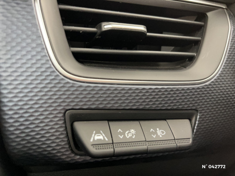 Indicateur de changement de vitesse / Alerte Distance Sécurité / Alerte d'oubli de ceinture de sécurité / Compartimentage de coffre / Projecteurs AV full LED Pure Vision / Commutation automatique des feux de route/croisement / Kit de gonflage et de réparation des pneumatiques / Harmonie foncé / Carte Renault avec accès et démarrage mains libres avec fermeture à l'éloignement / Allumage automatique des phares et des essuis-glace avec capteur de pluie et de luminosité / Feux de jour à LED avec signature lumineuse C-Shape / Programme eco mode / Coques de rétroviseurs ton caisse / Boitier connect AIVC / Navigation embarquée avec cartographie Europe / Tableau de bord avec écran couleur 4,2'' et compteurs analogiques / Système ISOFIX (i-Size) aux places AR (latérales) / Alerte de survitesse combinéà la vitesse limite de la navigation / Compatibilité Apple CarPlay Wifi / Projecteurs AV LED pure vision / Jantes alliage 17" Bahamas diamantées noires / Aérateurs aux places AR / Lève-vitres AR électriques avec fonction anti-pincement / Purificateur d'air / Freinage actif d'urgence avec détection piétons et cyclistes / Bouton d'appel d'urgence R-Call / Sellerie tissu Noir Titane / Volant gainé en similicuir Soft Touch
