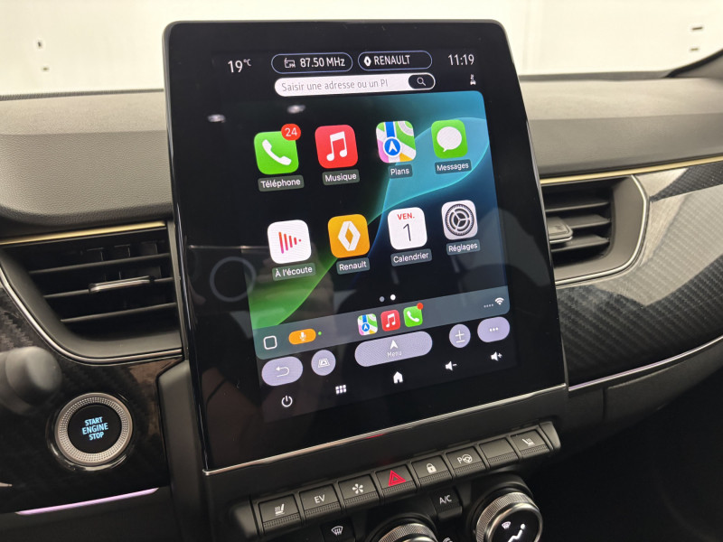 Aérateurs aux places AR / Alerte de distance de sécurité / Alerte de survitesse combinéà la vitesse limite de la navigation / Alerte d'oubli de ceinture de sécurité / Allumage automatique des phares et des essuis-glace avec capteur de pluie et de luminosité / Avertisseur de sortie de stationnement / Banquette AR avec accoudoir central / Boite de vitesse E shifter / Boitier connect AIVC / Bouton d'appel d'urgence R-Call / Carte Renault avec accès et démarrage mains libres avec fermeture à l'éloignement / Commutation automatique des feux de route/croisement / Compartimentage de coffre / Compartimentage de coffre / Compatibilité Apple CarPlay Wifi / Coques de rétroviseurs extérieures noires / Détection d'obstacle latérale / Easy link avec écran tactile 9.3", navigation, réplication smartphone, Bluetooth / Easy Park Assist / Eclairage d'ambiance / Feux de jour à LED avec signature lumineuse C-Shape / Freinage actif d'urgence avec détection piétons et cyclistes / Frein de parking électrique avec fonction Auto-Hold / Harmonie intérieure foncée / Indicateur de changement de vitesse / Jantes alliage 18" silverstone diamantées avec insert gold / Kit de gonflage et de réparation des pneumatiques / Lame F1 Golf / Lève-vitres AR électriques avec fonction anti-pincement / Programme eco mode / Projecteurs AV full LED Pure Vision / Purificateur d'air / Réhomologation E-Tech / Renault Multi-sense / Rétroviseur intérieur électrochrome sans contour / Sellerie cuir/suédine E-Tech engineered avec surpiqûres gold / Système ISOFIX (i-Size) aux places AR (latérales) / Tableau de bord avec écran numérique et personnalisable 10" / Volant chauffant / Volant cuir pleine fleur /