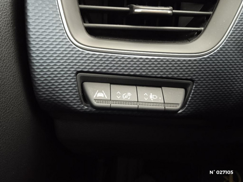 Allumage automatique des phares et des essuis-glace avec capteur de pluie et de luminosité / Feux de jour à LED avec signature lumineuse C-Shape / Programme eco mode / Aérateurs aux places AR / Lève-vitres AR électriques avec fonction anti-pincement / Purificateur d'air / Freinage actif d'urgence avec détection piétons et cyclistes / Bouton d'appel d'urgence R-Call / Sellerie tissu Noir Titane / Volant gainé en similicuir Soft Touch / Boitier connect AIVC / Navigation embarquée avec cartographie Europe / Tableau de bord avec écran couleur 4,2'' et compteurs analogiques / Système ISOFIX (i-Size) aux places AR (latérales) / Alerte de survitesse combinéà la vitesse limite de la navigation / Compatibilité Apple CarPlay Wifi / Jantes alliage 17" Bahamas diamantées noires / Projecteurs AV full LED Pure Vision / Commutation automatique des feux de route/croisement / Kit de gonflage et de réparation des pneumatiques / Harmonie foncé / Carte Renault avec accès et démarrage mains libres avec fermeture à l'éloignement / Coques de rétroviseurs ton caisse / Indicateur de changement de vitesse / Alerte Distance Sécurité / Alerte d'oubli de ceinture de sécurité / Compartimentage de coffre